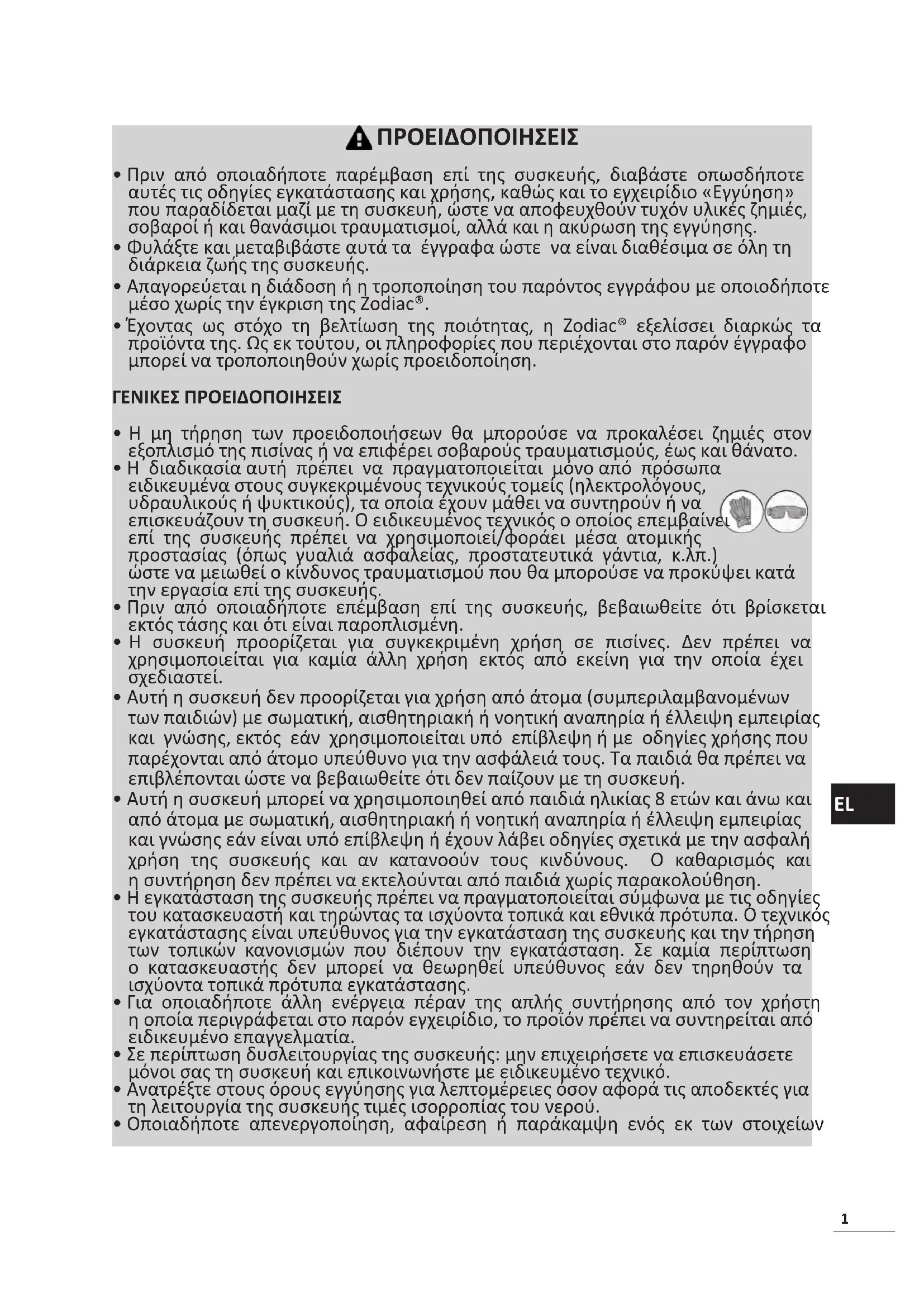 - Έχοντας ως στόχο τη βελτίωση της ποιότητας, η Zodiac® εξελίσσει διαρκώς τα προϊόντα της. Ως εκ τούτου, οι πληροφορίες που περιέχονται στο παρόν έγγραφο μπορεί να τροποποιηθούν χωρίς προειδοποίηση. ΓΕΝΙΚΕΣ ΠΡΟΕΙΔΟΠΟΙΗΣΕΙΣ