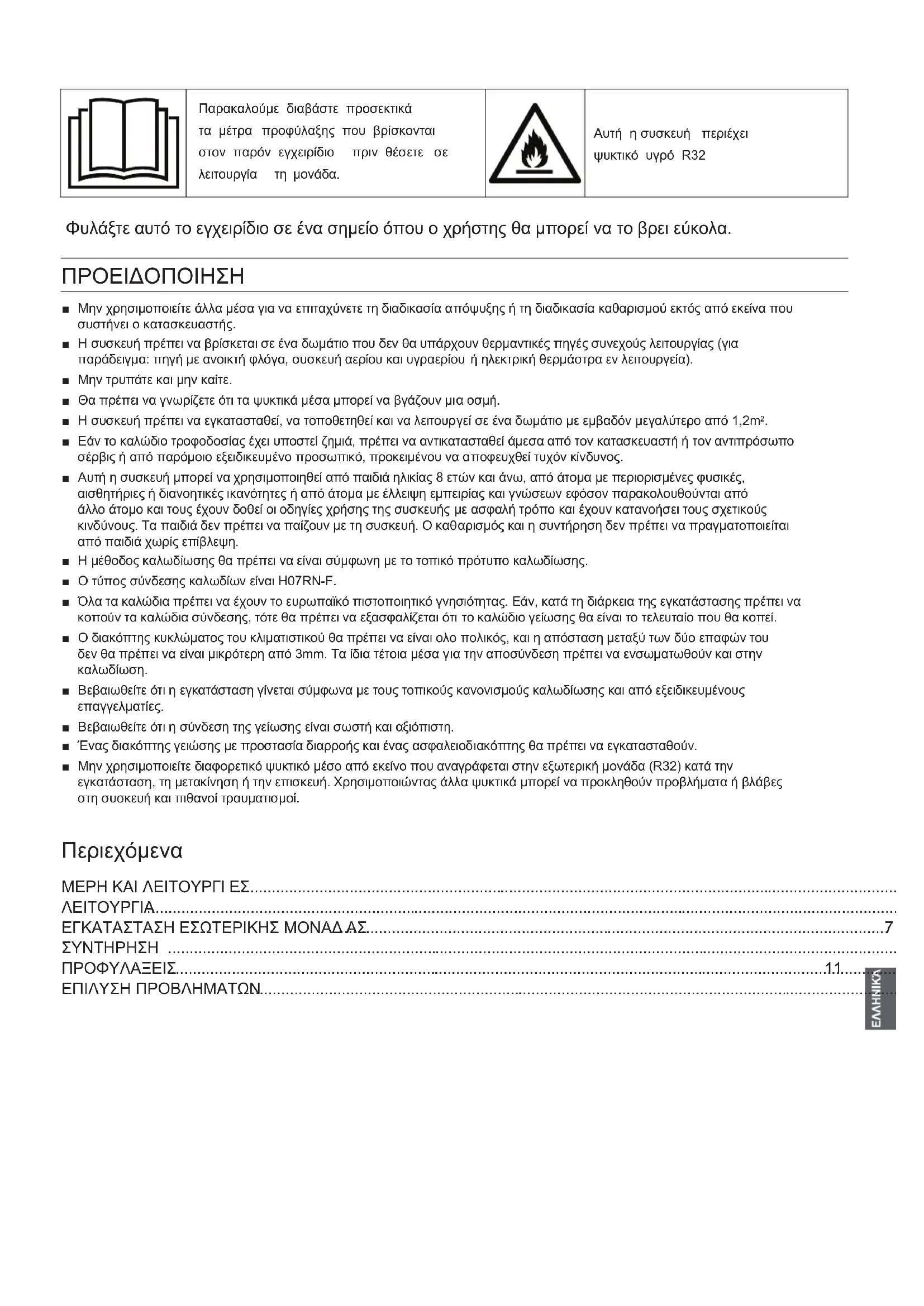 ΕΠΙΛΥΣΗ ΠΡΟΒΛΗΜΑΤΩ Ν.........................................................................................................................................................12 Παρακαλούμε διαβάστε προσεκτικά τα μέτρα προφύλαξης που βρίσκονται στον παρόν εγχειρίδιο πριν θέσετε σε λειτουργία τη μονάδα. Aυτή η συσκευή περιέχει ψυκτικό υγρό R32 Φυλάξτε αυτό το εγχειρίδιο σε ένα σημείο όπου ο χρήστης θα μπορεί να το βρει εύκολα.Εξα