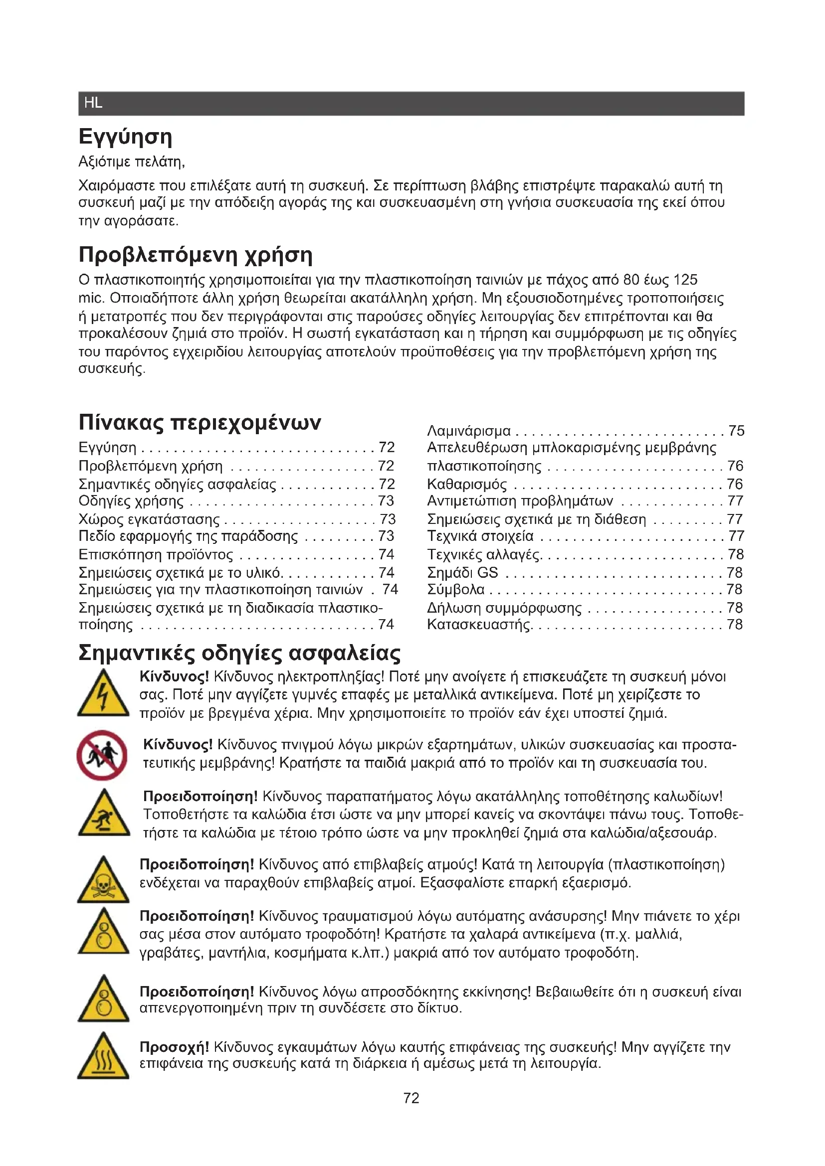 - Κατασκευαστής Σημαντικές οδηγίες ασφαλείας Κίνδυνος! Κίνδυνος ηλεκτροπληξίας! Ποτέ μην ανοίγετε ή επισκευάζετε τη συσκευή μόνοι σας. Ποτέ μην αγγίζετε γυμνές επαφές με μεταλλικά αντικείμενα. Ποτέ μη χειρίζεστε το προϊόν με βρεγμένα χέρια. Μην χρησιμοποιείτε το προϊόν εάν έχει υποστεί ζημιά. Κίνδυνος! Κίνδυνος πνιγμού λόγω μικρών εξαρτημάτων, υλικών συσκευασίας και προστα- τευτικής μεμβράνης! Κρατήστε τα παιδιά μακριά από το προϊόν και τη συσκευασία του. Προειδοποίηση! Κίνδυνος παραπατήματος λόγω ακατάλληλης τοποθέτησης καλωδίων! Τοποθετήστε τα καλώδια έτσι ώστε να μην μπορεί κανείς να σκοντάψει πάνω τους. Τοποθε- τήστε τα καλώδια με τέτοιο τρόπο ώστε να μην προκληθεί ζημιά στα καλώδια/αξεσουάρ. Προειδοποίηση! Κίνδυνος από επιβλαβείς ατμούς! Κατά τη λειτουργία (πλαστικοποίηση) ενδέχεται να παραχθούν επιβλαβείς ατμοί. Εξασφαλίστε επαρκή εξαερισμό. Προειδοποίηση! Κίνδυνος τραυματισμού λόγω αυτόματης ανάσυρσης! Μην πιάνετε το χέρι σας μέσα στον αυτόματο τροφοδότη! Κρατήστε τα χαλαρά αντικείμενα (π.χ. μαλλιά, γραβάτες, μαντήλια, κοσμήματα κ.λπ.) μακριά από τον αυτόματο τροφοδότη. Προειδοποίηση! Κίνδυνος λόγω απροσδόκητης εκκίνησης! Βεβαιωθείτε ότι η συσκευή είναι απενεργοποιημένη πριν τη συνδέσετε στο δίκτυο. Προσοχή! Κίνδυνος εγκαυμάτων λόγω καυτής επιφάνειας της συσκευής! Μην αγγίζετε την επιφάνεια της συσκευής κατά τη διάρκεια ή αμέσως μετά τη λειτουργία.73 Προσοχή! Κίνδυνος εγκαυμάτων από καυτό φιλμ πλαστικοποίησης! Η μεμβράνη πλαστικο- ποίησης είναι πολύ θερμή αμέσως μετά τη πλαστικοποίηση. Κατά την αφαίρεση της μεμβράνης πλαστικοποίησης, αγγίξτε μόνο το ψυχόμενο άκρο. Προσοχή! Κίνδυνος εγκαυμάτων από καυτά υπολείμματα! Το χαρτί που χρησιμοποιείται για τον καθαρισμό μπορεί να περιέχει καυτά υπολείμματα. Το χαρτί είναι πολύ ζεστό αμέσως μετά τον καθαρισμό. Κατά την αφαίρεση του χαρτιού, αγγίξτε μόνο το ψυχόμενο άκρο. Προσοχή! Υλικές ζημιές λόγω ακατάλληλης λειτουργίας! Αφαιρέστε όλους τους συνδετήρες και τους συνδετήρες πριν από την πλαστικοποίηση ή την κοπή. Προσοχή! Υλικές ζημιές λόγω ακατάλληλης λειτουργίας! Χρησιμοποιείτε μόνο χαρτί και μεμβράνες πλαστικοποίησης που πληρούν τις απαιτήσεις στην ενότητα Τεχνικά στοιχεία. Προσοχή! Πιθανές υλικές ζημιές! Εάν το προϊόν παρουσιάζει ασυνήθιστα χαρακτηριστικά, όπως θόρυβο, οσμή ή καπνό, αποσυνδέστε αμέσως την παροχή ρεύματος. Προσοχή! Πιθανές υλικές ζημιές! Δεν μπορεί να αποκλειστεί ότι ορισμένα χρώματα, πλαστικά ή προϊόντα περιποίησης επίπλων μπορεί να προσβάλλουν και να μαλακώσουν το υλικό των αντιολισθητικών ποδιών. Για να αποφύγετε τα σημάδια στα έπιπλα, τοποθετήστε ένα αντιολισθητικό χαλί κάτω από τη συσκευή, εάν είναι απαραίτητο. Οδηγίες χρήσης Παρακαλούμε διαβάστε αυτές τις οδηγίες λειτουργίας πριν συνδέσετε και χρησιμοποιήσετε το προϊόν. Φυλάξτε αυτές τις οδηγίες λειτουργίας για μελλοντική αναφορά. Να παραδίδετε όλα τα έγγραφα κατά τη μεταβίβαση του προϊόντος σε τρίτους. p. 78