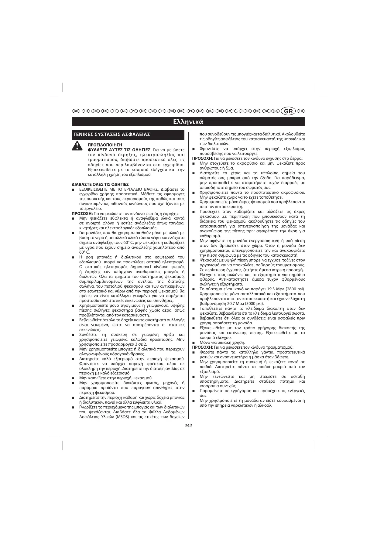 AVERTISSEMENT: Pour réduire les risque d’incendie ou d’explosion: Ne vaporisez pas de produits inflammables ou combustibles à proximité d’une flamme nue ou de sources d’inflammation telles que cigarettes, moteurs, et équipements électriques. N’utilisez pas de produits ayant un point éclair inférieur à 60°C dans les unités conçues pour n’être utilisées qu’avec des produits à base d’eau ou de solvants minéraux ayant un point éclair minimal de 60°C, et ne nettoyez pas l’appareil avec de tels produits. Les peintures ou solvants qui circulent à travers l’appareil sont susceptibles de produire de l’électricité statique. L’électricité statique crée un risque d’incendie ou d’explosion en présence de vapeurs de peintures ou de solvants. Tous les éléments du système de vaporisation, y compris la pompe, le flexible, le pistolet, et les objets se trouvant dans la zone de travail ou alentour doivent être correctement reliés à la terre afin de les protéger des décharges électrostatiques et des étincelles. N’utilisez que des pistolets et flexibles haute pression reliés à la terre tels que spécifiés par le fabricant. Vérifiez que tous les bidons, réservoirs, et systèmes de collecte sont reliés à la terre afin de prévenir toute décharge électrostatique. Branchez l’appareil sur une prise reliée à la terre et utilisez des rallonges avec terre. N’utilisez pas d’adaptateur 2 broches / 3 broches. N’utilisez pas de peinture ou de solvant contenant des hydrocarbures halogénés. Gardez la zone de vaporisation bien ventilée. Assurez un bon apport en air frais à la zone de travail. Gardez l’ensemble de la pompe dans un lieu bien ventilé. Ne fumez pas dans la zone de vaporisation. Ne manipulez pas d’interrupteurs de lumières, de 12