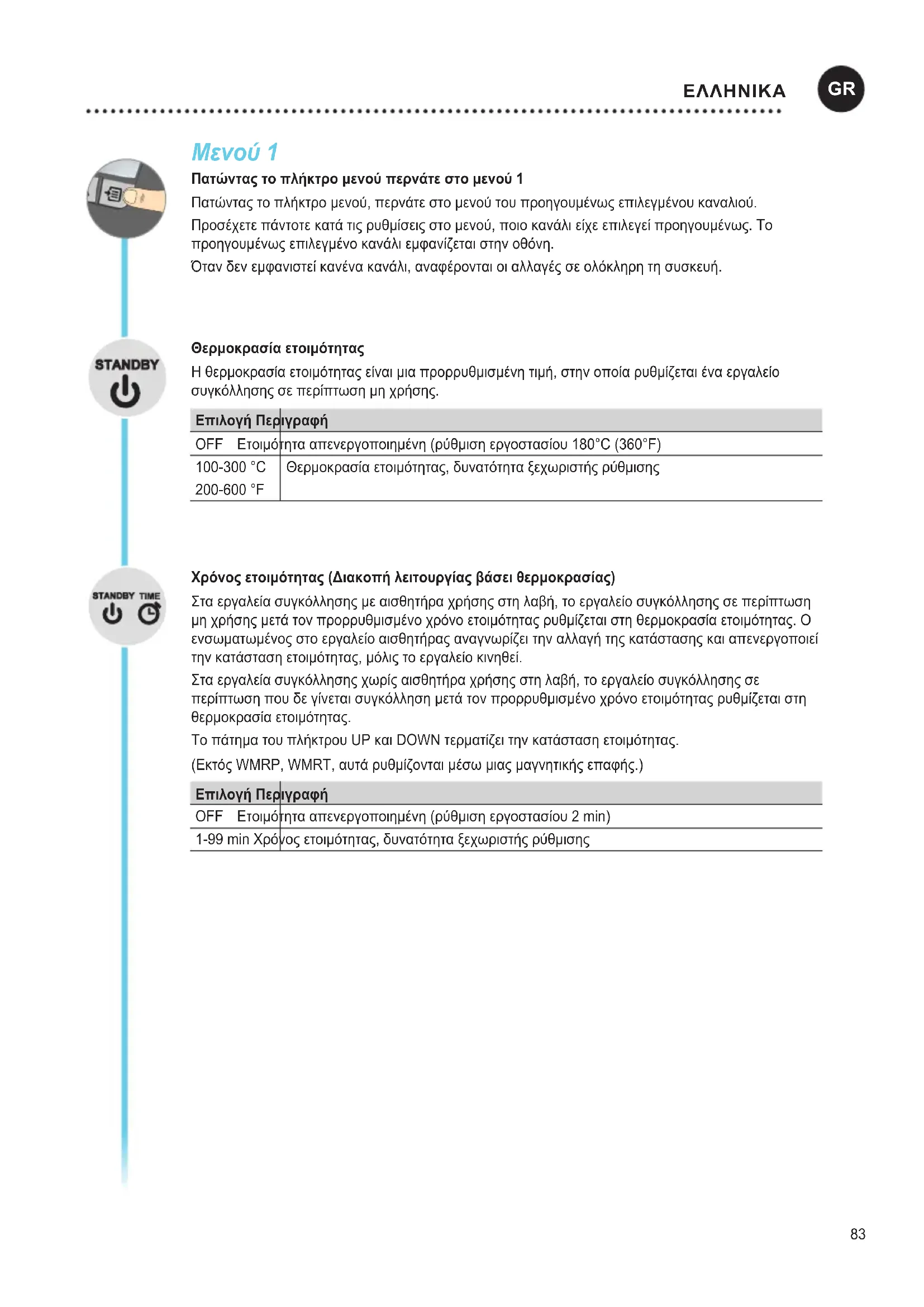 SUOMI83 Μενού 1 Πατώντας το πλήκτρο μενού περνάτε στο μενού 1 Πατώνταςτοπλήκτρομενού,περνάτεστομενούτουπροηγουμένωςεπιλεγμένουκαναλιού. Προσέχετεπάντοτεκατάτιςρυθμίσειςστομενού,ποιοκανάλιείχεεπιλεγείπροηγουμένως.Το προηγουμένωςεπιλεγμένοκανάλιεμφανίζεταιστηνοθόνη. Ότανδενεμφανιστείκανένακανάλι,αναφέρονταιοιαλλαγέςσεολόκληρητησυσκευή. Θερμοκρασα ετοιμτητας Ηθερμοκρασίαετοιμότηταςείναιμιαπρορρυθμισμένητιμή,στηνοποίαρυθμίζεταιέναεργαλείο συγκόλλησηςσεπερίπτωσημηχρήσης. Επιλογή Περιγραφή OFF Ετοιμότητααπενεργοποιημένη(ρύθμισηεργοστασίου180°C(360°F) 100-300°C 200-600°F Θερμοκρασίαετοιμότητας,δυνατότηταξεχωριστήςρύθμισης Χρνος ετοιμτητας (Διακοπή λειτουργας βάσει θερμοκρασας) Σταεργαλείασυγκόλλησηςμεαισθητήραχρήσηςστηλαβή,τοεργαλείοσυγκόλλησηςσεπερίπτωση μηχρήσηςμετάτονπρορρυθμισμένοχρόνοετοιμότηταςρυθμίζεταιστηθερμοκρασίαετοιμότητας.Ο ενσωματωμένοςστοεργαλείοαισθητήραςαναγνωρίζειτηναλλαγήτηςκατάστασηςκαιαπενεργοποιεί τηνκατάστασηετοιμότητας,μόλιςτοεργαλείοκινηθεί. Σταεργαλείασυγκόλλησηςχωρίςαισθητήραχρήσηςστηλαβή,τοεργαλείοσυγκόλλησηςσε περίπτωσηπουδεγίνεταισυγκόλλησημετάτονπρορρυθμισμένοχρόνοετοιμότηταςρυθμίζεταιστη θερμοκρασίαετοιμότητας. ΤοπάτηματουπλήκτρουUPκαιDOWNτερματίζειτηνκατάστασηετοιμότητας. (ΕκτόςWMRP,WMRT,αυτάρυθμίζονταιμέσωμιαςμαγνητικήςεπαφής.) Επιλογή Περιγραφή OFF Ετοιμότητααπενεργοποιημένη(ρύθμισηεργοστασίου2min) 1-99 min Χρόνοςετοιμότητας,δυνατότηταξεχωριστήςρύθμισης