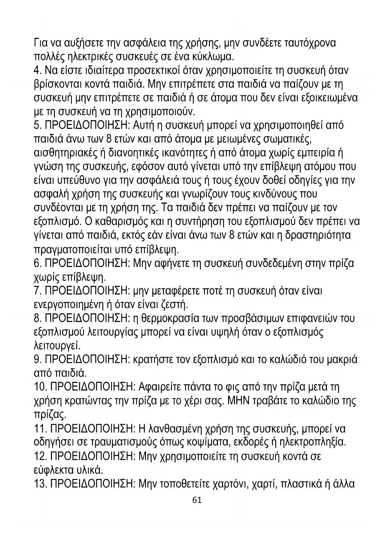 συσκευή για οποιονδήποτε άλλο σκοπό ασυμβίβαστο με την προβλεπόμενη χρήση της. 3.Συνδέστε τη συσκευή μόνο σε γειωμένη πρίζα 220-240V ~ 50-60Hz.61 Για να αυξήσετε την ασφάλεια της χρήσης, μην συνδέετε ταυτόχρονα πολλές ηλεκτρικές συσκευές σε ένα κύκλωμα.
