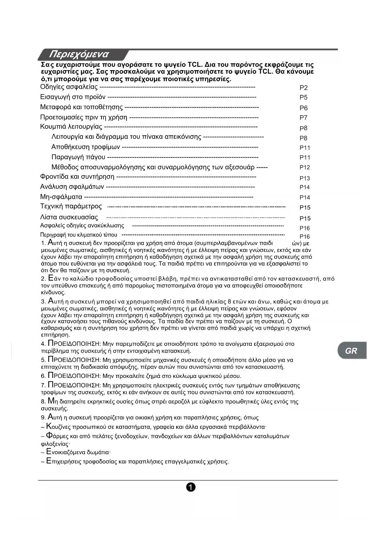 ς ευχαριστούμε που αγοράσατε το ψυγείο TCL. Δια του παρόντος εκφράζουμε τις ευχαριστίες μας. Σας προσκαλούμε να χρησιμοποιήσετε το ψυγείο TCL. Θα κάνουμε ό,τι μπορούμε για να σας παρέχουμε ποιοτικές υπηρεσίες. 1. Αυτή η συσκευή δεν προορίζεται για χρήση από άτομα (συμπεριλαμβανομένων παιδι ών) με μειωμένες σωματικές, αισθητικές ή νοητικές ικανότητες ή με έλλειψη πείρας και γνώσεων, εκτός και εάν έχουν λάβει την απαραίτητη επιτήρηση ή καθοδήγηση σχετικά με την ασφαλή χρήση της συσκευής από άτομο που ευθύνεται για την ασφάλειά τους. Τα παιδιά πρέπει να επιτηρούνται για να εξασφαλιστεί το ότι δεν θα παίζουν με τη συσκευή.