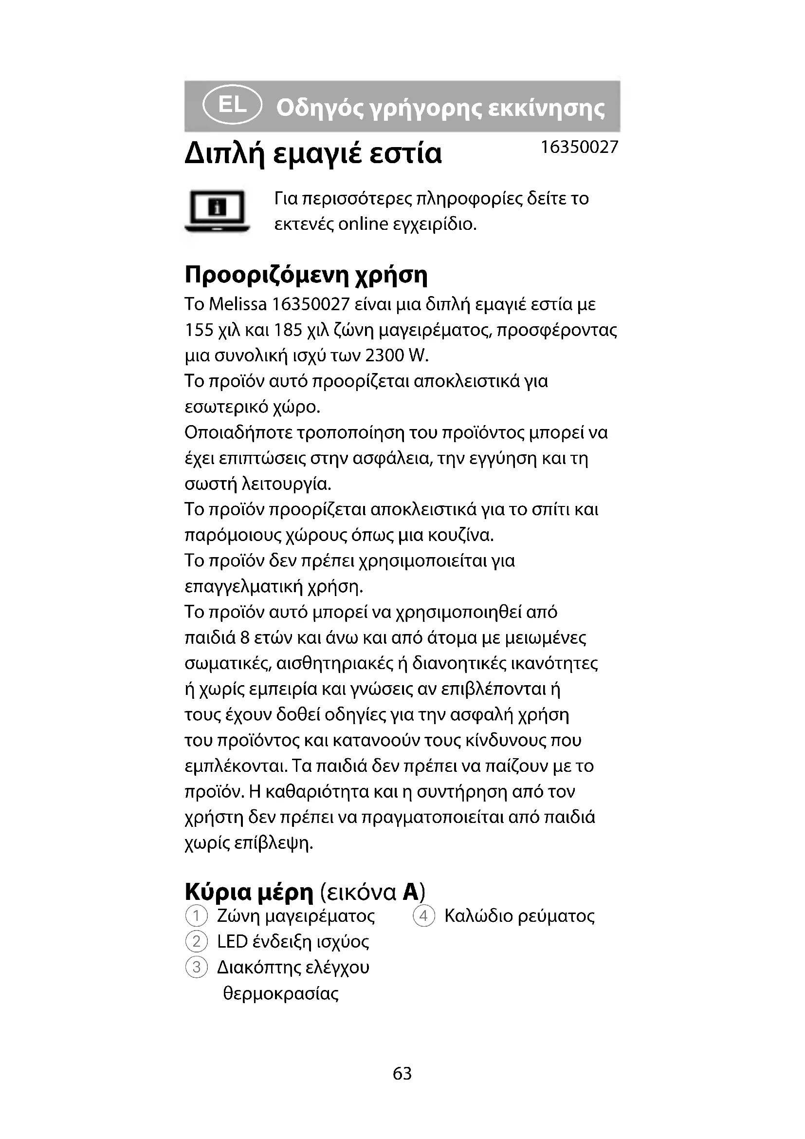 Για περισσότερες πληροφορίες δείτε το εκτενές online εγχειρίδιο. Προοριζόμενη χρήση Το Melissa 16350027 είναι μια διπλή εμαγιέ εστία με 155 χιλ και 185 χιλ ζώνη μαγειρέματος, προσφέροντας μια συνολική ισχύ των 2300 W. Το προϊόν αυτό προορίζεται αποκλειστικά για εσωτερικό χώρο. Οποιαδήποτε τροποποίηση του προϊόντος μπορεί να έχει επιπτώσεις στην ασφάλεια, την εγγύηση και τη σωστή λειτουργία. Το προϊόν προορίζεται αποκλειστικά για το σπίτι και παρόμοιους χώρους όπως μια κουζίνα. Το προϊόν δεν πρέπει χρησιμοποιείται για επαγγελματική χρήση. Το προϊόν αυτό μπορεί να χρησιμοποιηθεί από παιδιά 8 ετών και άνω και από άτομα με μειωμένες σωματικές, αισθητηριακές ή διανοητικές ικανότητες ή χωρίς εμπειρία και γνώσεις αν επιβλέπονται ή τους έχουν δοθεί οδηγίες για την ασφαλή χρήση του προϊόντος και κατανοούν τους κίνδυνους που εμπλέκονται. Τα παιδιά δεν πρέπει να παίζουν με το προϊόν. Η καθαριότητα και η συντήρηση από τον χρήστη δεν πρέπει να πραγματοποιείται από παιδιά χωρίς επίβλεψη. Κύρια μέρη (εικόνα A) 1 Ζώνη μαγειρέματος 2 LED ένδειξη ισχύος 3 Διακόπτης ελέγχου θερμοκρασίας 4 Καλώδιο ρεύματος64 Οδηγίες ασφάλειας Σύμβολο Περιγραφή Ένδειξη για ζεστή επιφάνεια. Η επαφή μπορεί να προκαλέσει εγκαύματα. Μην αγγίζετε.