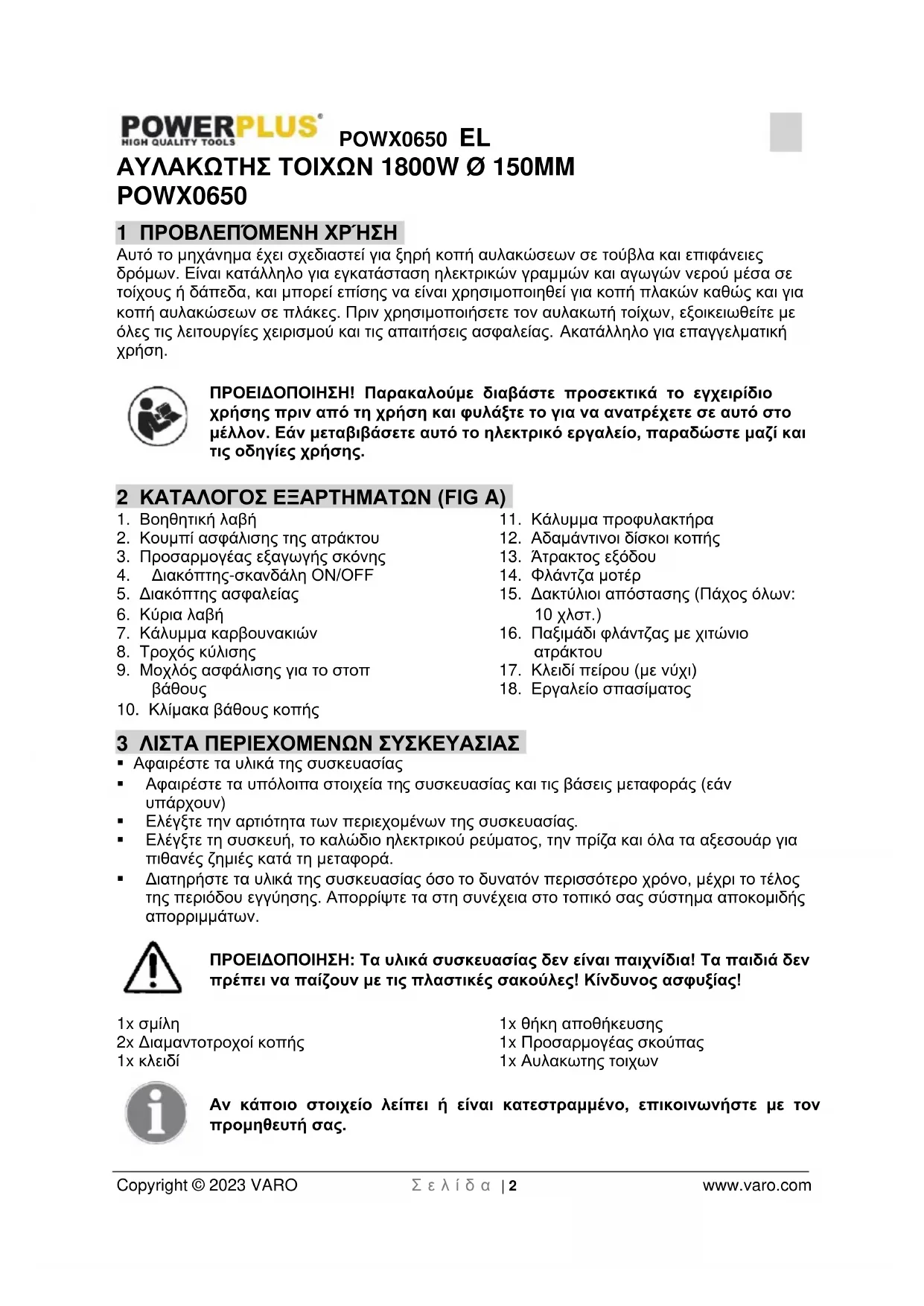- 16 ΔΗΛΩΣΗ ΣΥΜΜΟΡΦΩΣΗΣ POWX0650 EL Copyright © 2023 VARO Σ ε λ ί δ α | 2 www.varo.com ΑΥΛΑΚΩΤΗΣ ΤΟΙΧΩΝ 1800W Ø 150MM POWX0650 1 ΠΡΟΒΛΕΠΌΜΕΝΗ ΧΡΉΣΗ Αυτό το μηχάνημα έχει σχεδιαστεί για ξηρή κοπή αυλακώσεων σε τούβλα και επιφάνειες δρόμων. Είναι κατάλληλο για εγκατάσταση ηλεκτρικών γραμμών και αγωγών νερού μέσα σε τοίχους ή δάπεδα, και μπορεί επίσης να είναι χρησιμοποιηθεί για κοπή πλακών καθώς και για κοπή αυλακώσεων σε πλάκες. Πριν χρησιμοποιήσετε τον αυλακωτή τοίχων, εξοικειωθείτε με όλες τις λειτουργίες χειρισμού και τις απαιτήσεις ασφαλείας. Ακατάλληλο για επαγγελματική p. 12