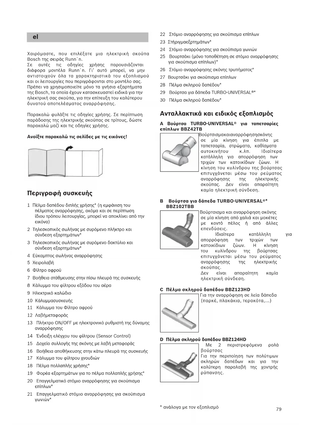 - conforme o modelo79 Χαιρόμαστε, που επιλέξατε μια ηλεκτρική σκούπα Bosch της σειράς Runn`n. Σε αυτές τις οδηγίες χρήσης παρουσιάζονται διάφορα μοντέλα Runn`n. Γι’ αυτό μπορεί, να μην αντιστοιχούν όλα τα χαρακτηριστικά του εξοπλισμού και οι λειτουργίες που περιγράφονται στο μοντέλο σας. Πρέπει να χρησιμοποιείτε μόνο τα γνήσια εξαρτήματα της Bosch, τα οποία έχουν κατασκευαστεί ειδικά για την ηλεκτρική σας σκούπα, για την επίτευξη του καλύτερου δυνατού αποτελέσματος αναρρόφησης. Παρακαλώ φυλάξτε τις οδηγίες χρήσης. Σε περίπτωση παράδοσης της ηλεκτρικής σκούπας σε τρίτους, δώστε παρακαλώ μαζί και τις οδηγίες χρήσης. Ανοίξτε παρακαλώ τις σελίδες με τις εικόνες! Περιγραφή συσκευής 1 Πέλμα δαπέδου διπλής χρήσης* (η εμφάνιση του πέλματος αναρρόφησης, ακόμα και σε περίπτωση ίδιου τρόπου λειτουργίας, μπορεί να αποκλίνει από την