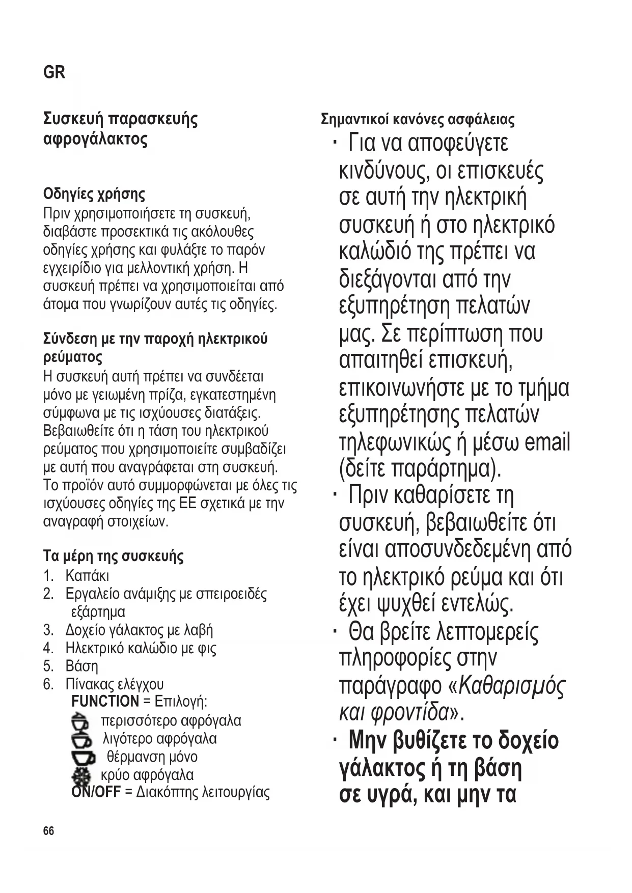 FUNCTION=Επιλογή: περισσότεροαφρόγαλα λιγότεροαφρόγαλα θέρμανσημόνο κρύοαφρόγαλα ON/OFF=Διακόπτηςλειτουργίας Σημαντικοί κανόνες ασφάλειας ∙ Γιανααποφεύγετε κινδύνους,οιεπισκευές σεαυτήτηνηλεκτρική συσκευήήστοηλεκτρικό καλώδιότηςπρέπεινα διεξάγονταιαπότην εξυπηρέτησηπελατών μας.Σεπερίπτωσηπου απαιτηθείεπισκευή, επικοινωνήστεμετοτμήμα εξυπηρέτησηςπελατών τηλεφωνικώςήμέσωemail (δείτεπαράρτημα). ∙ Πρινκαθαρίσετετη συσκευή,βεβαιωθείτεότι είναιαποσυνδεδεμένηαπό τοηλεκτρικόρεύμακαιότι έχειψυχθείεντελώς. ∙ Θαβρείτελεπτομερείς πληροφορίεςστην παράγραφο«Καθαρισμός και φροντίδα». ∙ Μην βυθίζετε το δοχείο γάλακτος ή τη βάση σε υγρά, και μην τα GR104 x 142 mm