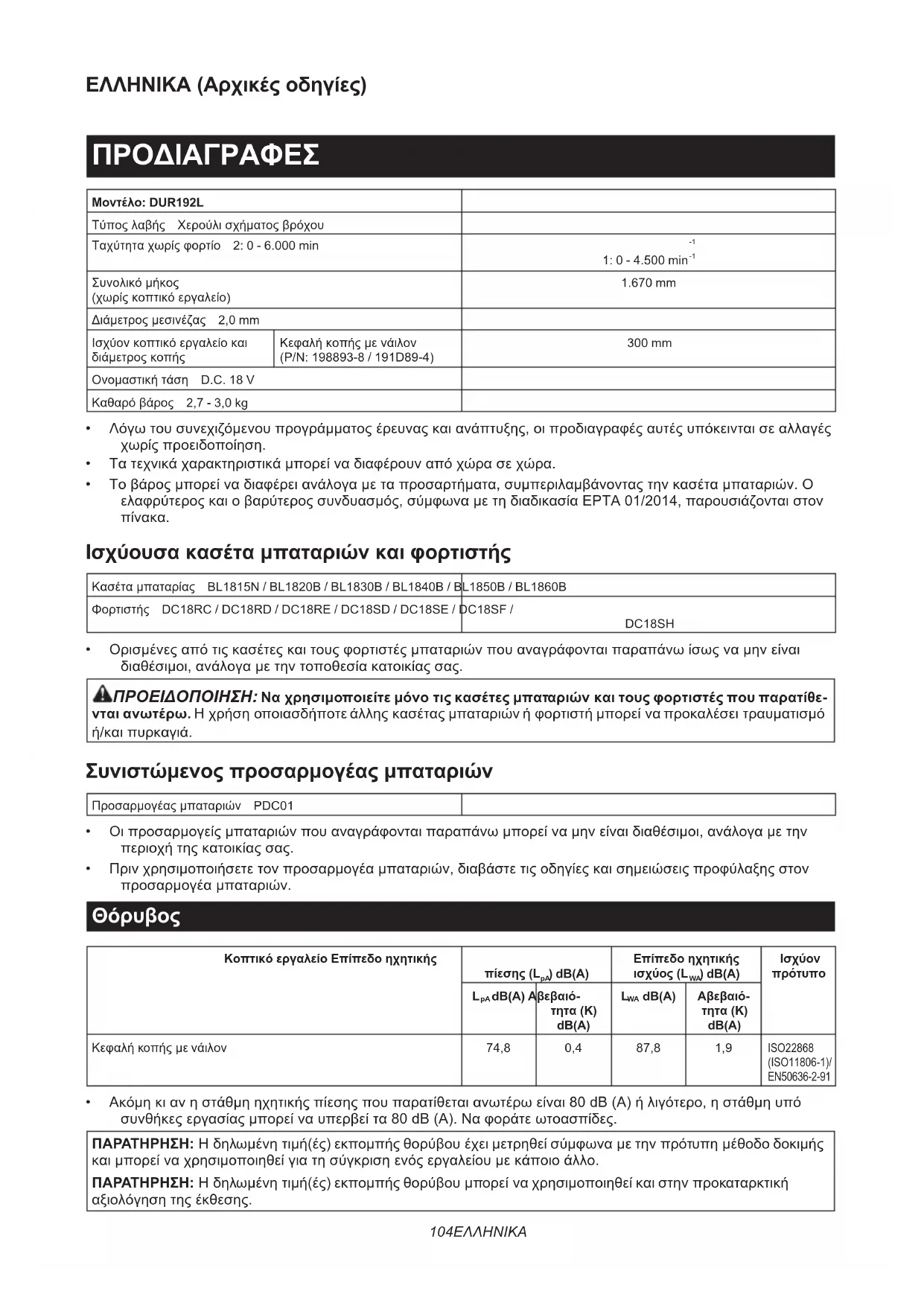Διάμετροςμεσινέζας 2,0 mm Ισχύονκοπτικόεργαλείοκαι διάμετροςκοπής Κεφαλήκοπήςμενάιλον (P/N: 198893-8 / 191D89-4) 300 mm Ονομαστικήτάση D.C. 18 V Καθαρόβάρος 2,7 - 3,0 kg