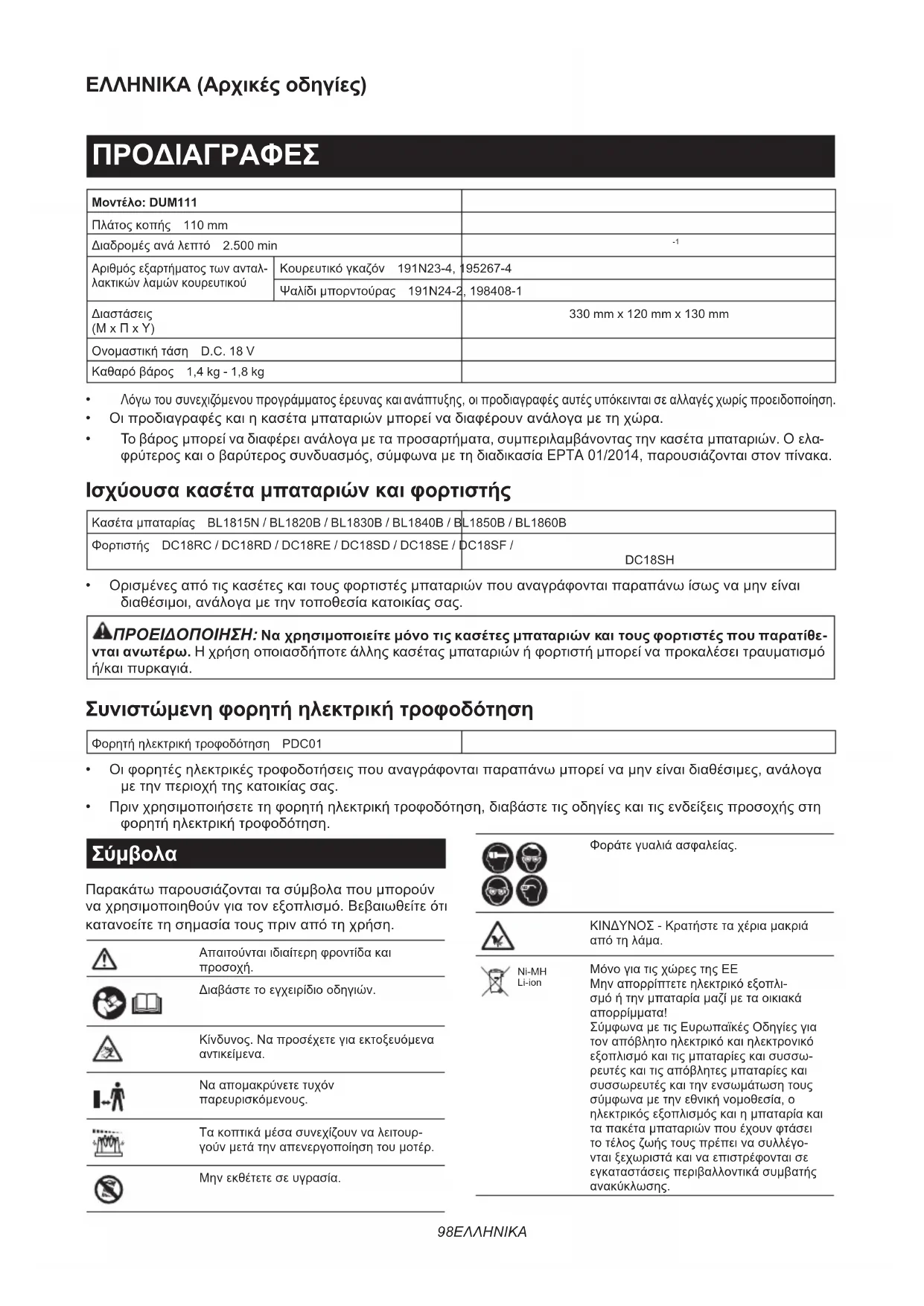 Τοβάροςμπορείναδιαφέρειανάλογαμεταπροσαρτήματα,συμπεριλαμβάνονταςτηνκασέταμπαταριών.Οελα- φρύτεροςκαιοβαρύτεροςσυνδυασμός,σύμφωναμετηδιαδικασίαEPTA01/2014,παρουσιάζονταιστονπίνακα. Ισχύουσα κασέτα μπαταριών και φορτιστής Κασέταμπαταρίας BL1815N / BL1820B / BL1830B / BL1840B / BL1850B / BL1860B Φορτιστής DC18RC / DC18RD / DC18RE / DC18SD / DC18SE / DC18SF / DC18SH