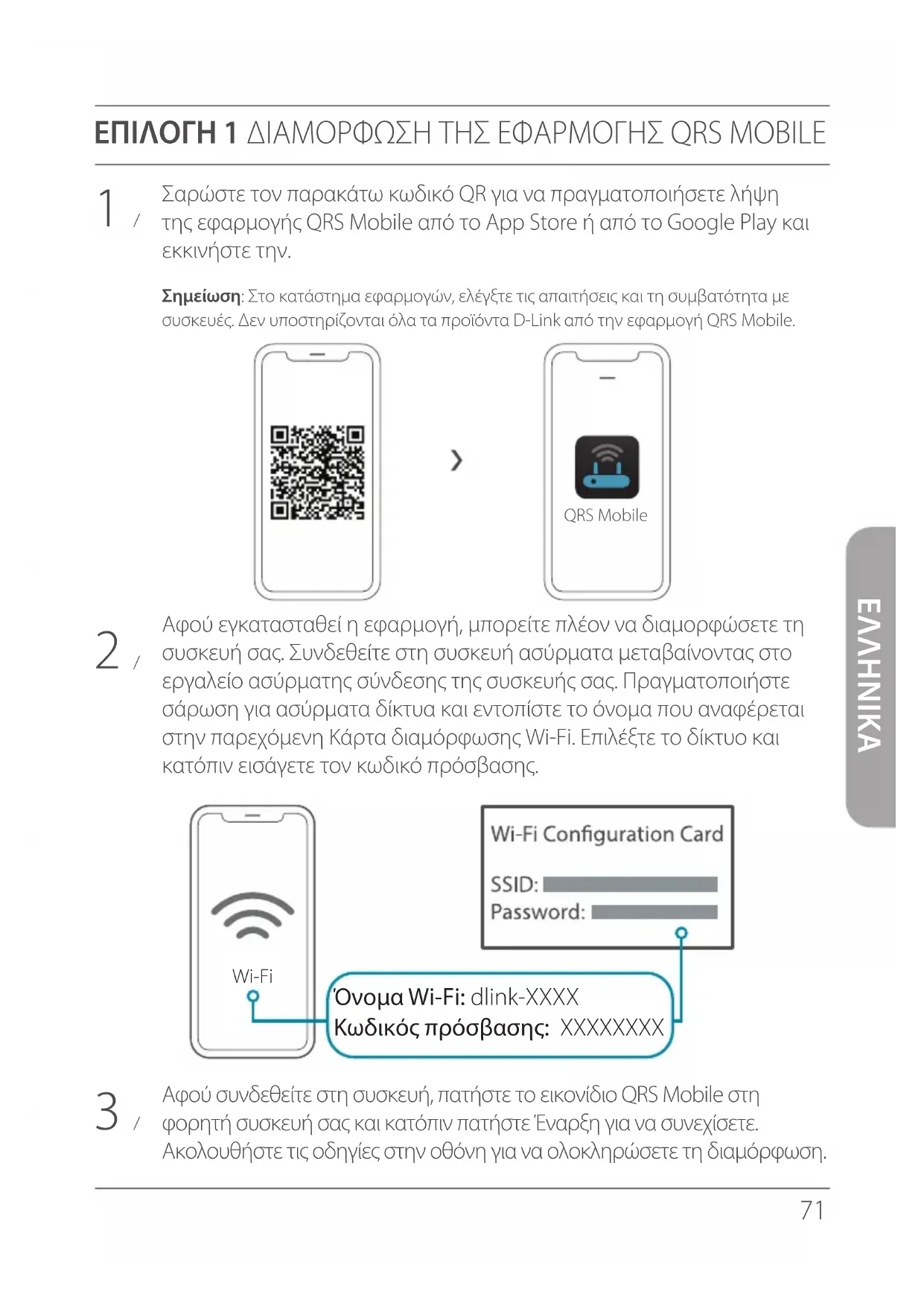 ΕΠΙΛΟΓΉ 1 ΔΙΑΜΟΡΦΩΣΗ ΤΗΣ ΕΦΑΡΜΟΓΗΣ QRS MOBILE Σαρώστε τον παρακάτω κωδικό QR για να πραγματοποιήσετε λήψη της εφαρμογής QRS Mobile από το App Store ή από το Google Play και εκκινήστε την. Σημείωση: Στο κατάστημα εφαρμογών, ελέγξτε τις απαιτήσεις και τη συμβατότητα με συσκευές. Δεν υποστηρίζονται όλα τα προϊόντα D-Link από την εφαρμογή QRS Mobile. 1 / QRS Mobile Αφού εγκατασταθεί η εφαρμογή, μπορείτε πλέον να διαμορφώσετε τη συσκευή σας. Συνδεθείτε στη συσκευή ασύρματα μεταβαίνοντας στο εργαλείο ασύρματης σύνδεσης της συσκευής σας. Πραγματοποιήστε σάρωση για ασύρματα δίκτυα και εντοπίστε το όνομα που αναφέρεται στην παρεχόμενη Κάρτα διαμόρφωσης Wi-Fi. Επιλέξτε το δίκτυο και κατόπιν εισάγετε τον κωδικό πρόσβασης. 2 / Wi-Fi Όνομα Wi-Fi: dlink-XXXX Κωδικός πρόσβασης: XXXXXXXX Αφού συνδεθείτε στη συσκευή, πατήστε το εικονίδιο QRS Mobile στη φορητή συσκευή σας και κατόπιν πατήστε Έναρξη για να συνεχίσετε. Ακολουθήστε τις οδηγίες στην οθόνη για να ολοκληρώσετε τη διαμόρφωση. 3 /72