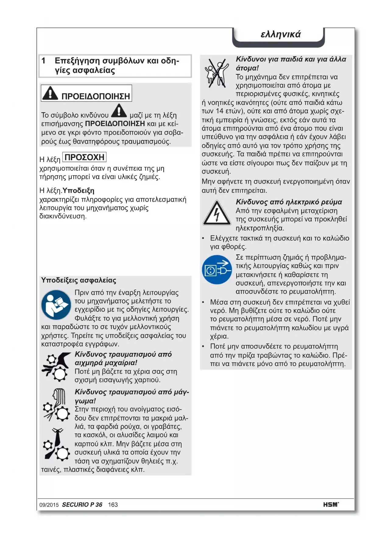 - Λειτουργήστε για 10 δευτερόλεπτα τον κοπτικό μηχανισμό χωρίς χαρτιά σε διαρκή λειτουργία. Η χαρτόσκονη και τα σωματίδια ξεκολλούν και φεύγουν. ΠΡΟΕΙΔΟΠΟΙΗΣΗ Επικίνδυνη ηλεκτρική τάση! Από την εσφαλμένη μεταχείριση της συσκευής μπορεί να προκληθεί ηλεκτροπληξία. Πριν από την αλλαγή θέσης και τον καθαρισμό απενεργοποιήστε τον καταστροφέα εγγράφων και αποσυνδέστε το φις από την πρίζα. Οι εργασίες συντήρησης όπου πρέπει να αφαιρεθούν τα καλύμ- ματα επιτρέπεται να εκτελούνται μόνο από το τμήμα εξυπηρέτησης πελατών και τους τεχνικούς σέρβις της HSM. Οι διευθύνσεις εξυπηρέτησης πελα- τών δίνονται στη σελίδα 180. Επιτήρηση του στοιχείου ασφαλείας Οι κινήσεις του στοιχείου ασφαλείας εποπτεύ- ονται κατά τη διαδικασία καταστροφής. Αν το μηχάνημα απενεργοποιείται χωρίς σήμα βλά- βης, βγάλτε το χαρτί από τη σχισμή και βάλτε πάλι εκ νέου.170 SECURIO P 36 09/2015