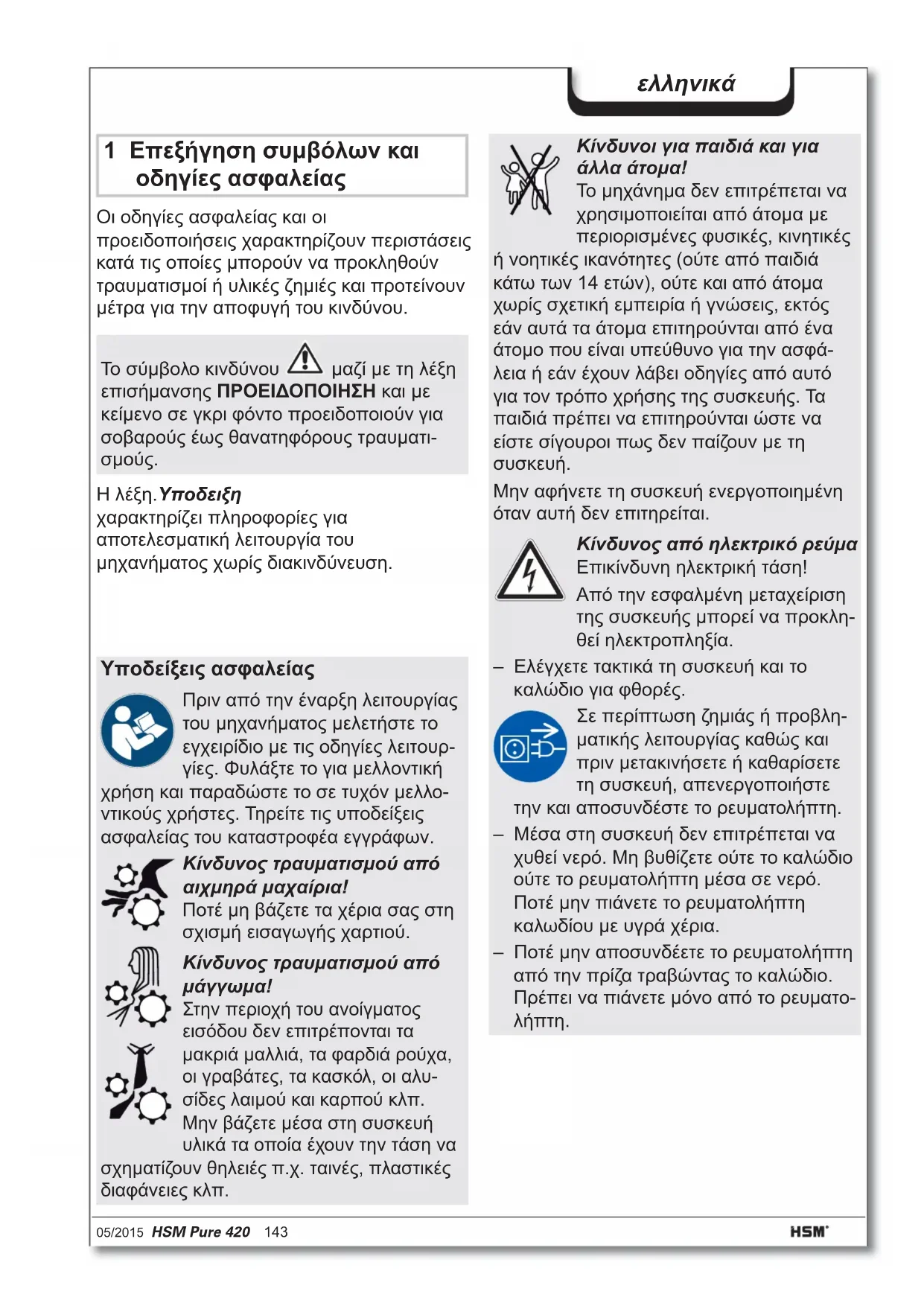 Η λέξη.Υποδειξη χαρακτηρίζει πληροφορίες για αποτελεσματική λειτουργία του μηχανήματος χωρίς διακινδύνευση. Το σύμβολο κινδύνου μαζί με τη λέξη επισήμανσης ΠΡΟΕΙΔΟΠΟΙΗΣΗ και με κείμενο σε γκρι φόντο προειδοποιούν για σοβαρούς έως θανατηφόρους τραυματι- σμούς.144 HSM Pure 420 05/2015