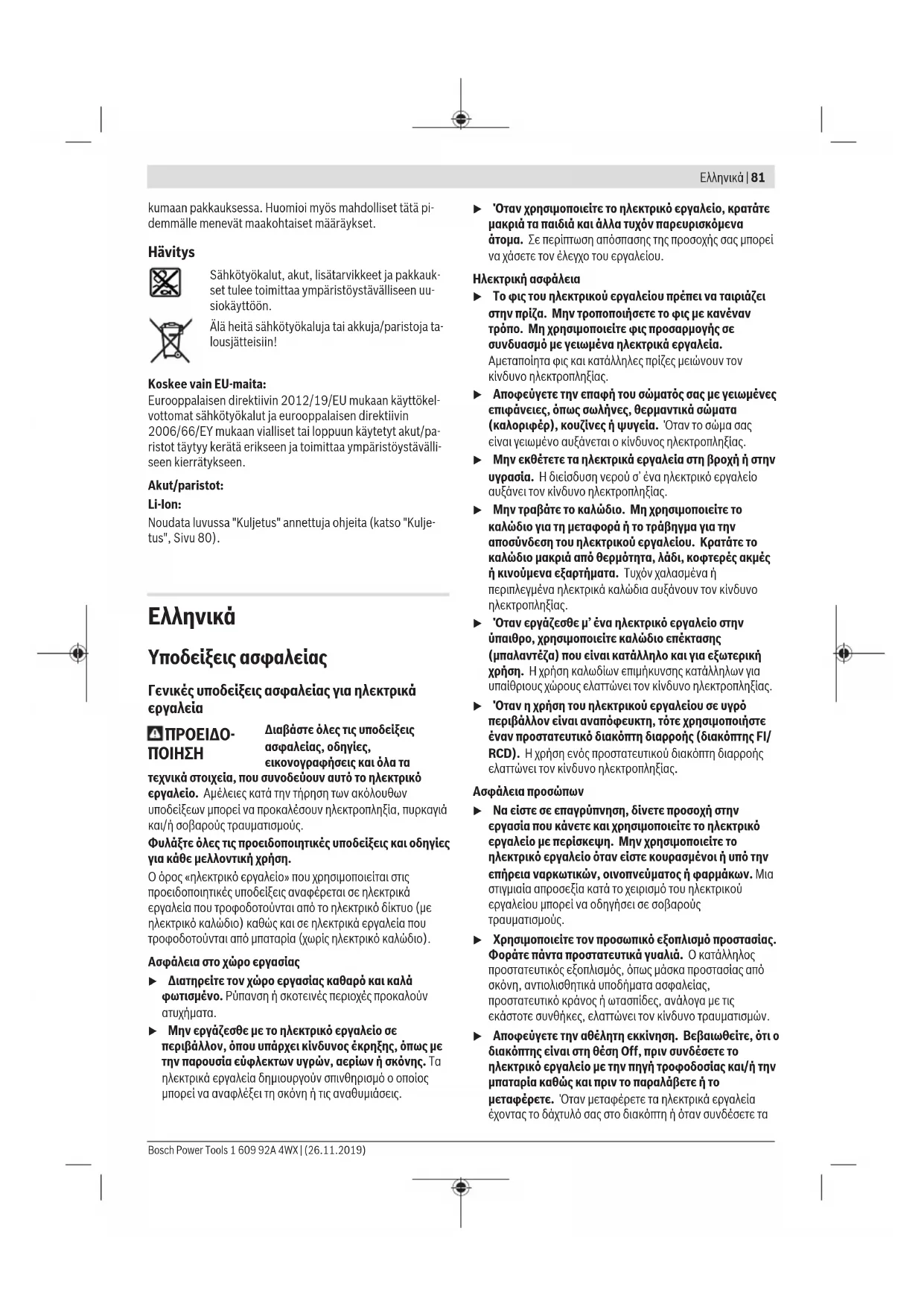 u Μην εργάζεσθε με το ηλεκτρικό εργαλείο σε περιβάλλον, όπου υπάρχει κίνδυνος έκρηξης, όπως με την παρουσία εύφλεκτων υγρών, αερίων ή σκόνης. Τα ηλεκτρικά εργαλεία δημιουργούν σπινθηρισμό ο οποίος μπορεί να αναφλέξει τη σκόνη ή τις αναθυμιάσεις. u Όταν χρησιμοποιείτε το ηλεκτρικό εργαλείο, κρατάτε μακριά τα παιδιά και άλλα τυχόν παρευρισκόμενα άτομα. Σε περίπτωση απόσπασης της προσοχής σας μπορεί να χάσετε τον έλεγχο του εργαλείου. Ηλεκτρική ασφάλεια u Το φις του ηλεκτρικού εργαλείου πρέπει να ταιριάζει στην πρίζα. Μην τροποποιήσετε το φις με κανέναν τρόπο. Μη χρησιμοποιείτε φις προσαρμογής σε συνδυασμό με γειωμένα ηλεκτρικά εργαλεία. Αμεταποίητα φις και κατάλληλες πρίζες μειώνουν τον κίνδυνο ηλεκτροπληξίας. u Αποφεύγετε την επαφή του σώματός σας με γειωμένες επιφάνειες, όπως σωλήνες, θερμαντικά σώματα (καλοριφέρ), κουζίνες ή ψυγεία. Όταν το σώμα σας είναι γειωμένο αυξάνεται ο κίνδυνος ηλεκτροπληξίας. u Μην εκθέτετε τα ηλεκτρικά εργαλεία στη βροχή ή στην υγρασία. Η διείσδυση νερού σ’ ένα ηλεκτρικό εργαλείο αυξάνει τον κίνδυνο ηλεκτροπληξίας. u Μην τραβάτε το καλώδιο. Μη χρησιμοποιείτε το καλώδιο για τη μεταφορά ή το τράβηγμα για την αποσύνδεση του ηλεκτρικού εργαλείου. Κρατάτε το καλώδιο μακριά από θερμότητα, λάδι, κοφτερές ακμές ή κινούμενα εξαρτήματα. Τυχόν χαλασμένα ή περιπλεγμένα ηλεκτρικά καλώδια αυξάνουν τον κίνδυνο ηλεκτροπληξίας. u Όταν εργάζεσθε μ’ ένα ηλεκτρικό εργαλείο στην ύπαιθρο, χρησιμοποιείτε καλώδιο επέκτασης (μπαλαντέζα) που είναι κατάλληλο και για εξωτερική χρήση. Ηχρήση καλωδίων επιμήκυνσης κατάλληλων για υπαίθριους χώρους ελαττώνει τον κίνδυνο ηλεκτροπληξίας. u Όταν η χρήση του ηλεκτρικού εργαλείου σε υγρό περιβάλλον είναι αναπόφευκτη, τότε χρησιμοποιήστε έναν προστατευτικό διακόπτη διαρροής (διακόπτηςFI/ RCD). Ηχρήση ενός προστατευτικού διακόπτη διαρροής ελαττώνει τον κίνδυνο ηλεκτροπληξίας. Ασφάλεια προσώπων u Να είστε σε επαγρύπνηση, δίνετε προσοχή στην εργασία που κάνετε και χρησιμοποιείτε το ηλεκτρικό εργαλείο με περίσκεψη. Μην χρησιμοποιείτε το ηλεκτρικό εργαλείο όταν είστε κουρασμένοι ή υπό την επήρεια ναρκωτικών, οινοπνεύματος ή φαρμάκων. Μια στιγμιαία απροσεξία κατά το χειρισμό του ηλεκτρικού εργαλείου μπορεί να οδηγήσει σε σοβαρούς τραυματισμούς. u Χρησιμοποιείτε τον προσωπικό εξοπλισμό προστασίας. Φοράτε πάντα προστατευτικά γυαλιά. Ο κατάλληλος προστατευτικός εξοπλισμός, όπως μάσκα προστασίας από σκόνη, αντιολισθητικά υποδήματα ασφαλείας, προστατευτικό κράνος ή ωτασπίδες, ανάλογα με τις εκάστοτε συνθήκες, ελαττώνει τον κίνδυνο τραυματισμών. u Αποφεύγετε την αθέλητη εκκίνηση. Βεβαιωθείτε, ότι ο διακόπτης είναι στη θέση Off, πριν συνδέσετε το ηλεκτρικό εργαλείο με την πηγή τροφοδοσίας και/ή την μπαταρία καθώς και πριν το παραλάβετε ή το μεταφέρετε. Όταν μεταφέρετε τα ηλεκτρικά εργαλεία έχοντας το δάχτυλό σας στο διακόπτη ή όταν συνδέσετε τα Bosch Power Tools 1 609 92A 4WX | (26.11.2019)82 | Ελληνικά ηλεκτρικά εργαλεία με την πηγή ρεύματος όταν αυτά είναι ακόμη στη θέση ΟΝ, τότε δημιουργείται κίνδυνος τραυματισμών. u Απομακρύνετε από το ηλεκτρικό εργαλείο τυχόν εξαρτήματα ρύθμισης ή κλειδιά πριν θέσετε το ηλεκτρικό εργαλείο σε λειτουργία. Ένα εργαλείο ή κλειδί συναρμολογημένο σ’ ένα περιστρεφόμενο τμήμα ενός ηλεκτρικού εργαλείου μπορεί να οδηγήσει σε τραυματισμούς. u Προσέχετε πως στέκεστε. Φροντίζετε