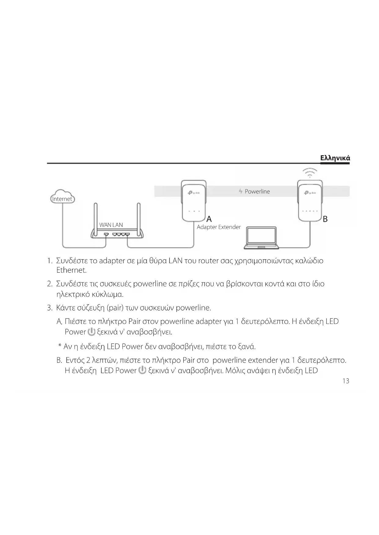 - Αν η ένδειξη LED Power δεν αναβοσβήνει, πιέστε το ξανά. B. Εντός 2 λεπτών, πιέστε το πλήκτρο Pair στο powerline extender για 1 δευτερόλεπτο. Η ένδειξη LED Power ξεκινά ν' αναβοσβήνει. Μόλις ανάψει η ένδειξη LED Internet WAN LAN Adapter Extender PowerlineΕλληνικά
