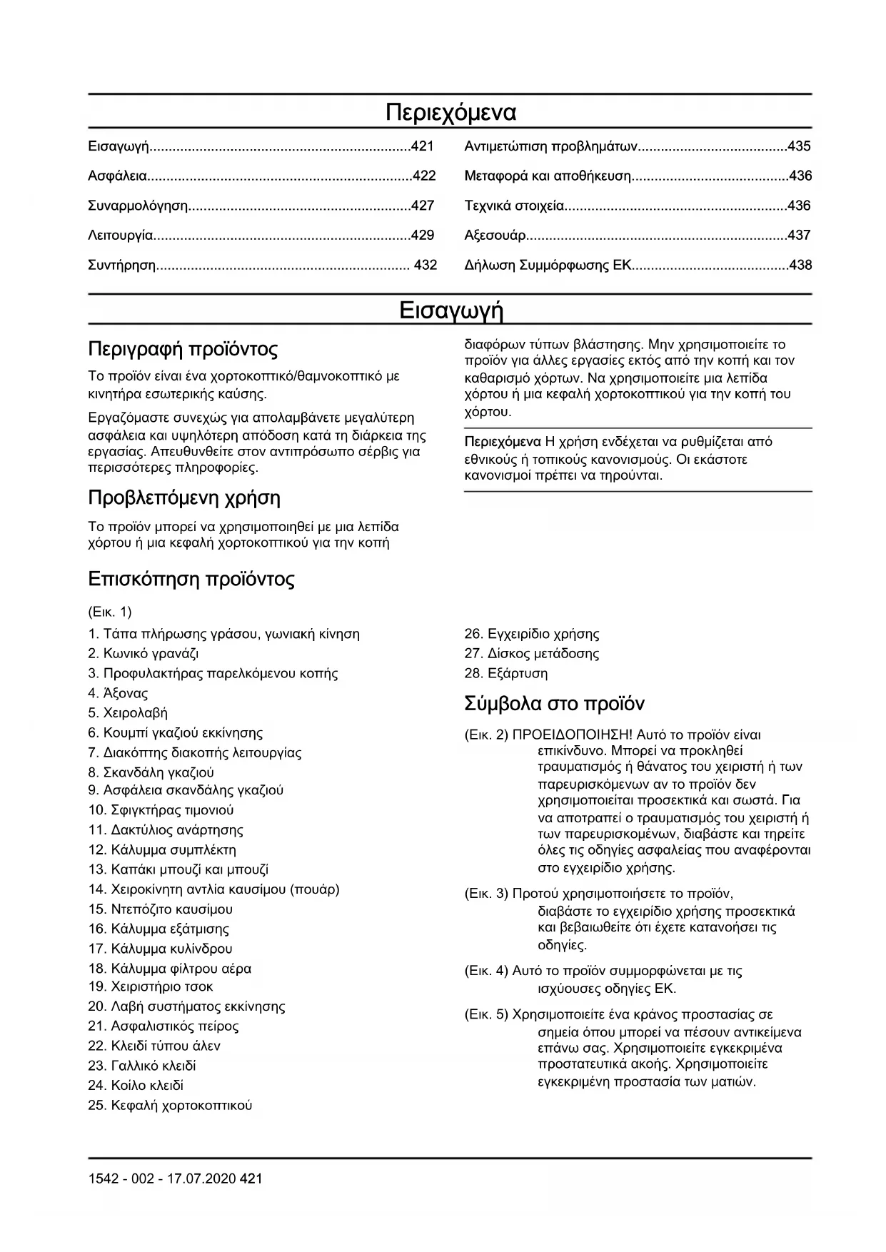 (Εικ. 4) Αυτό το προϊόν συμμορφώνεται με τις ισχύουσες οδηγίες ΕΚ. (Εικ. 5) Χρησιμοποιείτε ένα κράνος προστασίας σε σημεία όπου μπορεί να πέσουν αντικείμενα επάνω σας. Χρησιμοποιείτε εγκεκριμένα προστατευτικά ακοής. Χρησιμοποιείτε εγκεκριμένη προστασία των ματιών. 1542 - 002 - 17.07.2020 421(Εικ. 6) Χρησιμοποιείτε εγκεκριμένα προστατευτικά