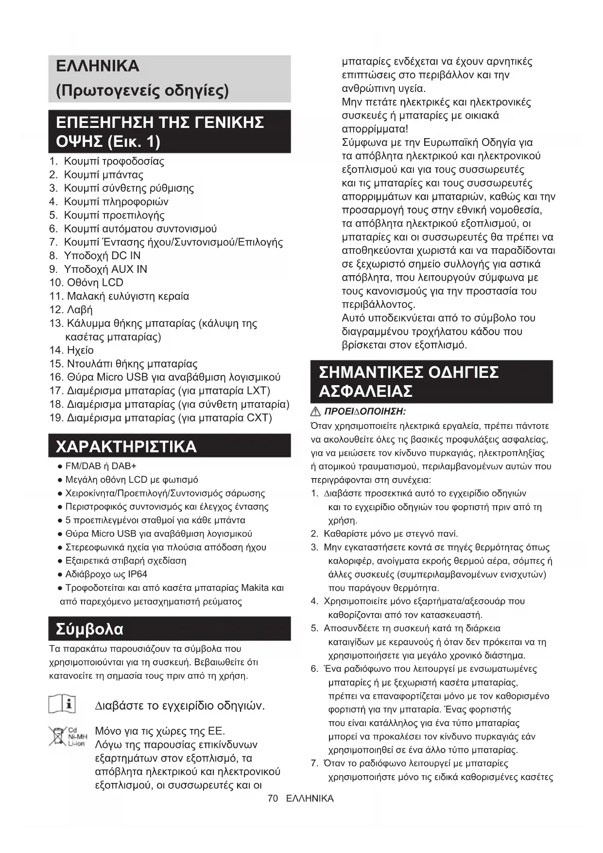 ΧΑΡΑΚΤΗΡΙΣΤΙΚΑ ● FM/DAB ή DAB+ ● Μεγάλη οθόνη LCD με φωτισμό ● Χειροκίνητα/Προεπιλογή/Συντονισμός σάρωσης ● Περιστροφικός συντονισμός και έλεγχος έντασης ● 5 προεπιλεγμένοι σταθμοί για κάθε μπάντα ● Θύρα Micro USB για αναβάθμιση λογισμικού ● Στερεοφωνικά ηχεία για πλούσια απόδοση ήχου ● Εξαιρετικά στιβαρή σχεδίαση ● Αδιάβροχο ως IP64 ● Τροφοδοτείται και από κασέτα μπαταρίας Makita και από παρεχόμενο μετασχηματιστή ρεύματος