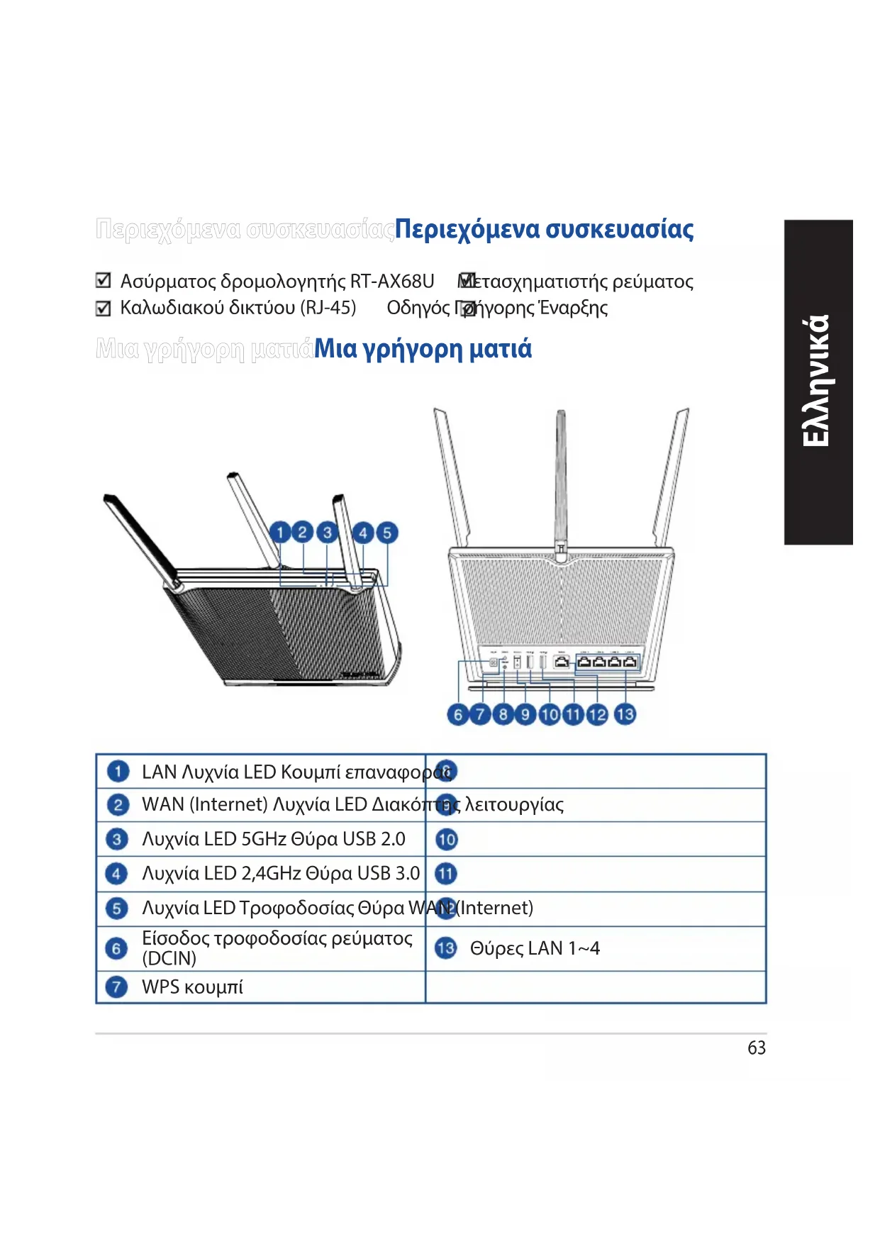 LAN Λυχνία LED Κουμπί επαναφοράς WAN (Internet) Λυχνία LED Διακόπτης λειτουργίας Λυχνία LED 5GHz Θύρα USB 2.0 Λυχνία LED 2,4GHz Θύρα USB 3.0 Λυχνία LED Τροφοδοσίας Θύρα WAN (Internet) Είσοδος τροφοδοσίας ρεύματος (DCIN) Θύρες LAN 1~4 WPS κουμπί64