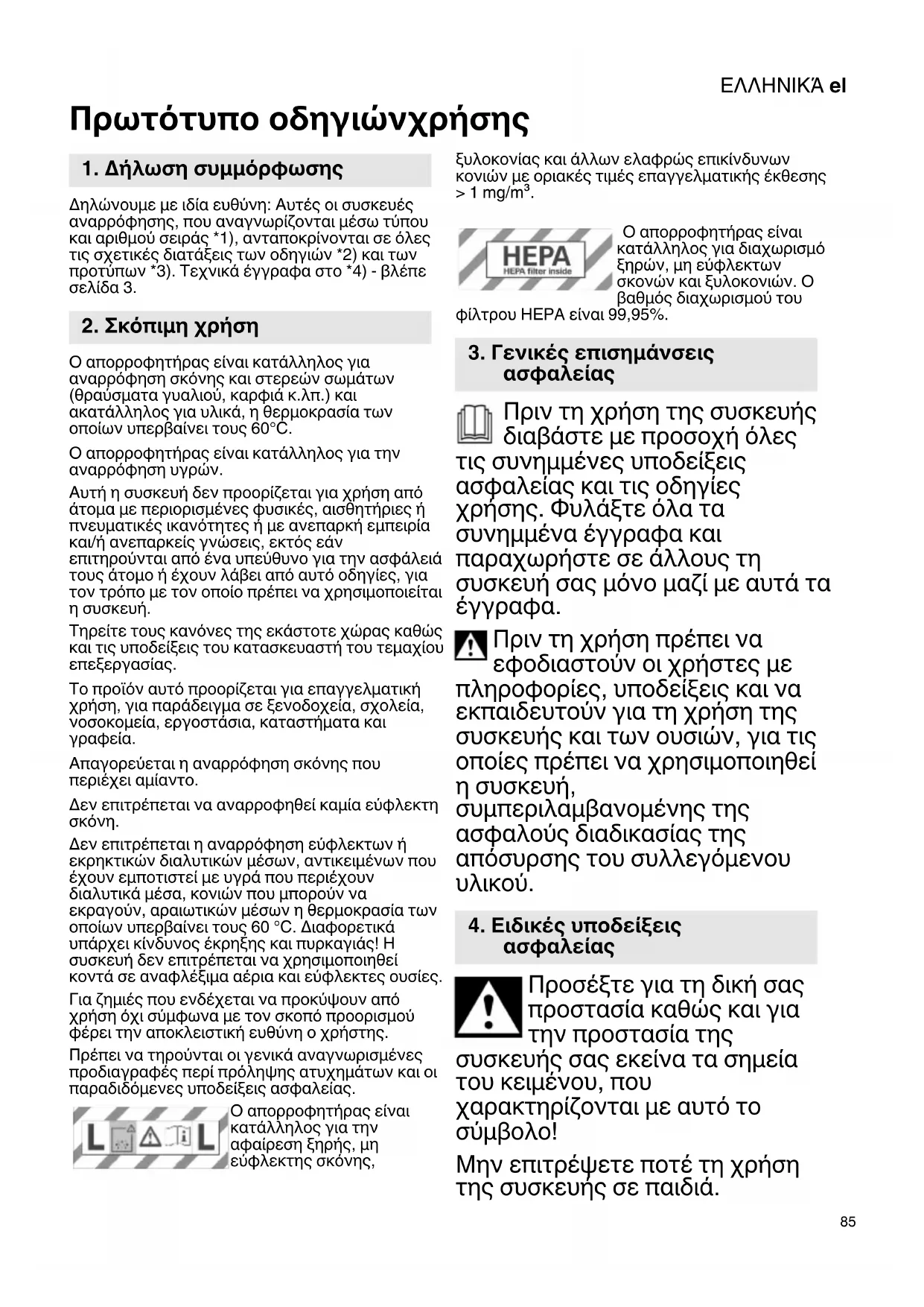 Δεν επιτρέπεται η αναρρόφηση εύφλεκτων ή εκρηκτικών διαλυτικών μέσων, αντικειμένων που έχουν εμποτιστεί με υγρά που περιέχουν διαλυτικά μέσα, κονιών που μπορούν να εκραγούν, αραιωτικών μέσων η θερμοκρασία των οποίων υπερβαίνει τους 60 °C. Διαφορετικά υπάρχει κίνδυνος έκρηξης και πυρκαγιάς! Η συσκευή δεν επιτρέπεται να χρησιμοποιηθεί κοντά σε αναφλέξιμα αέρια και εύφλεκτες ουσίες. Για ζημιές που ενδέχεται να προκύψουν από χρήση όχι σύμφωνα με τον σκοπό προορισμού φέρει την αποκλειστική ευθύνη ο χρήστης. Πρέπει να τηρούνται οι γενικά αναγνωρισμένες προδιαγραφές περί πρόληψης ατυχημάτων και οι παραδιδόμενες υποδείξεις ασφαλείας. Ο απορροφητήρας είναι κατάλληλος για την αφαίρεση ξηρής, μη εύφλεκτης σκόνης, ξυλοκονίας και άλλων ελαφρώς επικίνδυνων κονιών με οριακές τιμές επαγγελματικής έκθεσης > 1 mg/m³. Ο απορροφητήρας είναι κατάλληλος για διαχωρισμό ξηρών, μη εύφλεκτων σκονών και ξυλοκονιών. Ο βαθμός διαχωρισμού του φίλτρου HEPA είναι 99,95%. Πριν τη χρήση της συσκευής διαβάστε με προσοχή όλες τις συνημμένες υποδείξεις ασφαλείας και τις οδηγίες χρήσης. Φυλάξτε όλα τα συνημμένα έγγραφα και παραχωρήστε σε άλλους τη συσκευή σας μόνο μαζί με αυτά τα