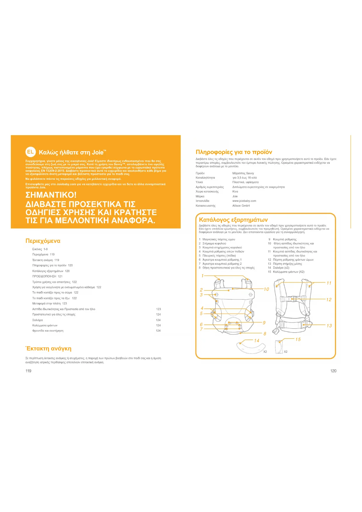 ΔΙΑΒΑΣΤΕ ΠΡΟΣΕΚΤΙΚΑ ΤΙΣ ΟΔΗΓΙΕΣ ΧΡΗΣΗΣ ΚΑΙ ΚΡΑΤΗΣΤΕ ΤΙΣ ΓΙΑ ΜΕΛΛΟΝΤΙΚΗ ΑΝΑΦΟΡΑ. Περιεχόμενα Εικόνες 1-9Περιεχόμενα 119Έκτακτη ανάγκη 119Πληροφορίες για το προϊόν 120Κατάλογος εξαρτημάτων 120ΠΡΟΕΙΔΟΠΟΙΗΣΗ 121Τρόποι χρήσης και απαιτήσεις 122Χρήση για νεογέννητα με ενσωματωμένο κάθισμα 122Το παιδί κοιτάζει προς το σώμα 122Το παιδί κοιτάζει προς τα έξω 122Μεταφορά στην πλάτη 123Ασπίδα ιδιωτικότητας και Προστασία από τον ήλιο 123Προστατευτικό για όλες τις εποχές 124Σαλιάρα 124Καλύμματα ιμάντων 124Φροντίδα και συντήρηση 124 Έκτακτη ανάγκη Σε περίπτωση έκτακτης ανάγκης ή ατυχήματος, η παροχή των πρώτων βοηθειών στο παιδί σας και η άμεση αναζήτηση ιατρικής περίθαλψης αποτελούν επιτακτική ανάγκη. Κατάλογος εξαρτημάτων Διαβάστε όλες τις οδηγίες που περιέχονται σε αυτόν τον οδηγό πριν χρησιμοποιήσετε αυτό το προϊόν. Εάν έχετε επιπλέον ερωτήσεις, συμβουλευτείτε τον προμηθευτή. Ορισμένα χαρακτηριστικά ενδέχεται να διαφέρουν ανάλογα με το μοντέλο. Δεν απαιτούνται εργαλεία για τη συναρμολόγηση. 1 Μαγνητικές πόρπες ώμου 2 Στήριγμα κεφαλιού 3 Κουμπιά στηρίγματος κεφαλιού 4 Κουμπιά ρύθμισης οπών ποδιών 5 Πλευρικές πόρπες (πόδια) 6 Άγκιστρα κουμπιού ρύθμισης 1 7 Άγκιστρα κουμπιού ρύθμισης 2 8 Θήκη προστατευτικού για όλες τις εποχές 9 Κουμπιά ρύθμισης10 Θήκη ασπίδας ιδιωτικότητας και προστασίας από τον ήλιο 11 Κουμπιά ασπίδας ιδιωτικότητας και προστασίας από τον ήλιο12 Πόρπη ρύθμισης ιμάντων ώμων13 Πόρπη στήριξης μέσης14 Σαλιάρα (x2)15 Καλύμματα ιμάντων (X2)