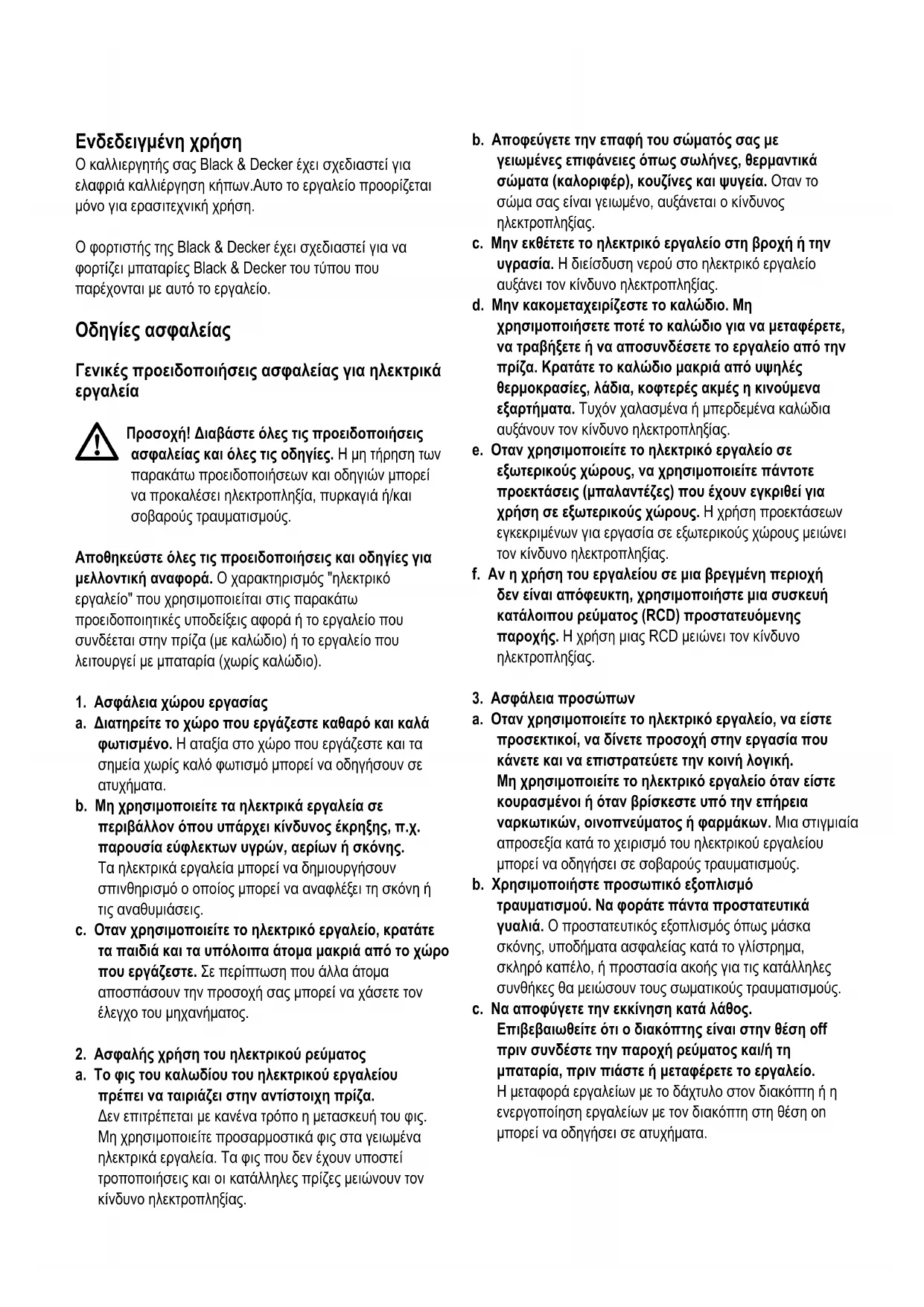 Προειδοποίηση! Ο φορτιστής σας έχει σχεδιαστεί για συγκεκριμένες τάσεις. Ελέγχετε πάντα αν η τάση τροφοδοσίας αντιστοιχεί σε αυτήν που αναγράφεται στην πινακίδα χαρακτηριστικών. Χρησιμοποιήστε μόνο το φορτιστή της Black & Decker για τη φόρτιση μπαταριών του τύπου που συνοδεύει το εργαλείο σας. Σε άλλες μπαταρίες ενδέχεται να σημειωθεί διάρρηξη, προκαλώντας τραυματισμό και ζημιά. Μην επιχειρήσετε ποτέ να επαναφορτίσετε μη επαναφορτιζόμενες μπαταρίες. Αν το καλώδιο ρεύματος έχει υποστεί βλάβη, πρέπει να αντικατασταθεί από τον κατασκευαστή η από εξουσιοδοτημένο Κέντρο Επισκευών Black & Decker ώστε να αποφύγετε τους κινδύνους. Μην εκθέτετε το φορτιστή σε νερό. Μην ανοίγετε το φορτιστή. Μην επιχειρήσετε να διερευνήσετε το εσωτερικό του φορτιστή.79