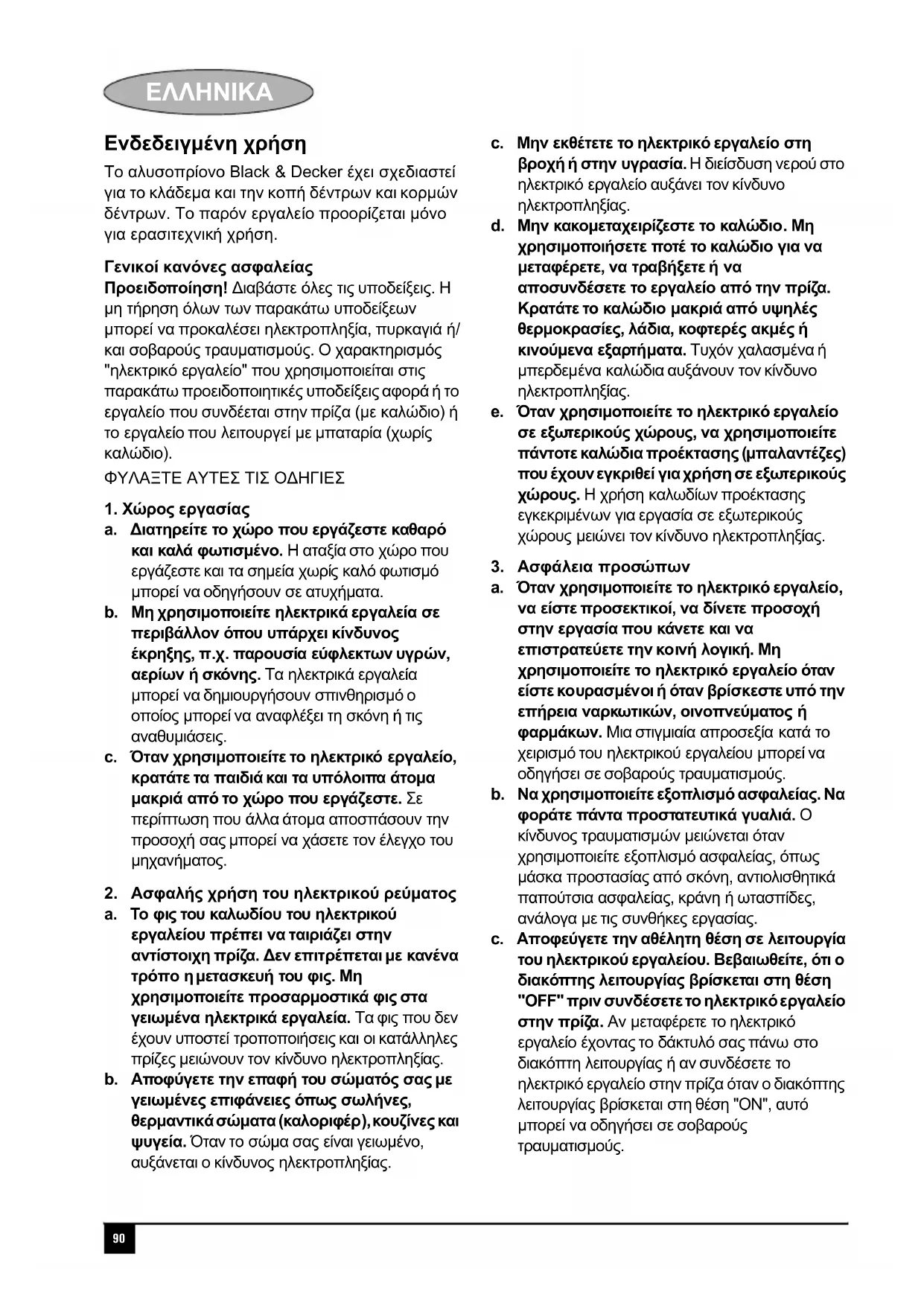 ÅËËÇÍÉÊÁ Ενδεδειγμένη χρήση Το αλυσοπρίονο Black & Decker έχει σχεδιαστεί για το κλάδεμα και την κοπή δέντρων και κορμών δέντρων. Το παρόν εργαλείο προορίζεται μόνο για ερασιτεχνική χρήση. Γενικοί κανόνες ασφαλείας Προειδοποίηση! Διαβάστε όλες τις υποδείξεις. Η μη τήρηση όλων των παρακάτω υποδείξεων μπορεί να προκαλέσει ηλεκτροπληξία, πυρκαγιά ή/ και σοβαρούς τραυματισμούς. Ο χαρακτηρισμός "ηλεκτρικό εργαλείο" που χρησιμοποιείται στις παρακάτω προειδοποιητικές υποδείξεις αφορά ή το εργαλείο που συνδέεται στην πρίζα (με καλώδιο) ή το εργαλείο που λειτουργεί με μπαταρία (χωρίς