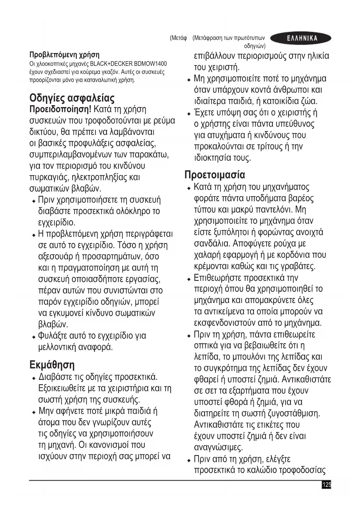 επιβάλλουν περιορισμούς στην ηλικία του χειριστή. u Μη χρησιμοποιείτε ποτέ το μηχάνημα όταν υπάρχουν κοντά άνθρωποι και ιδιαίτερα παιδιά, ή κατοικίδια ζώα. u Έχετε υπόψη σας ότι ο χειριστής ή ο χρήστης είναι πάντα υπεύθυνος για ατυχήματα ή κινδύνους που προκαλούνται σε τρίτους ή την ιδιοκτησία τους. Προετοιμασία u Κατά τη χρήση του μηχανήματος φοράτε πάντα υποδήματα βαρέος τύπου και μακρύ παντελόνι. Μη χρησιμοποιείτε το μηχάνημα όταν είστε ξυπόλητοι ή φορώντας ανοιχτά σανδάλια. Αποφύγετε ρούχα με χαλαρή εφαρμογή ή με κορδόνια που κρέμονται καθώς και τις γραβάτες. u Επιθεωρήστε προσεκτικά την περιοχή όπου θα χρησιμοποιηθεί το μηχάνημα και απομακρύνετε όλες τα αντικείμενα τα οποία μπορούν να εκσφενδονιστούν από το μηχάνημα. u Πριν τη χρήση, πάντα επιθεωρείτε οπτικά για να βεβαιωθείτε ότι η λεπίδα, το μπουλόνι της λεπίδας και το συγκρότημα της λεπίδας δεν έχουν φθαρεί ή υποστεί ζημιά. Αντικαθιστάτε σε σετ τα εξαρτήματα που έχουν υποστεί φθορά ή ζημιά, για να διατηρείτε τη σωστή ζυγοστάθμιση. Αντικαθιστάτε τις ετικέτες που έχουν υποστεί ζημιά ή δεν είναι αναγνώσιμες. u Πριν από τη χρήση, ελέγξτε προσεκτικά το καλώδιο τροφοδοσίας Προβλεπόμενη χρήση Οι χλοοκοπτικές μηχανές BLACK+DECKER BDMOW1400 έχουν σχεδιαστεί για κούρεμα γκαζόν. Αυτές οι συσκευές προορίζονται μόνο για καταναλωτική χρήση. Οδηγίες ασφαλείας Προειδοποίηση! Κατά τη χρήση συσκευών που τροφοδοτούνται με ρεύμα δικτύου, θα πρέπει να λαμβάνονται οι βασικές προφυλάξεις ασφαλείας, συμπεριλαμβανομένων των παρακάτω, για τον περιορισμό του κινδύνου πυρκαγιάς, ηλεκτροπληξίας και σωματικών βλαβών. u Πριν χρησιμοποιήσετε τη συσκευή διαβάστε προσεκτικά ολόκληρο το εγχειρίδιο. u Η προβλεπόμενη χρήση περιγράφεται σε αυτό το εγχειρίδιο. Τόσο η χρήση αξεσουάρ ή προσαρτημάτων, όσο και η πραγματοποίηση με αυτή τη συσκευή οποιασδήποτε εργασίας, πέραν αυτών που συνιστώνται στο παρόν εγχειρίδιο οδηγιών, μπορεί να εγκυμονεί κίνδυνο σωματικών