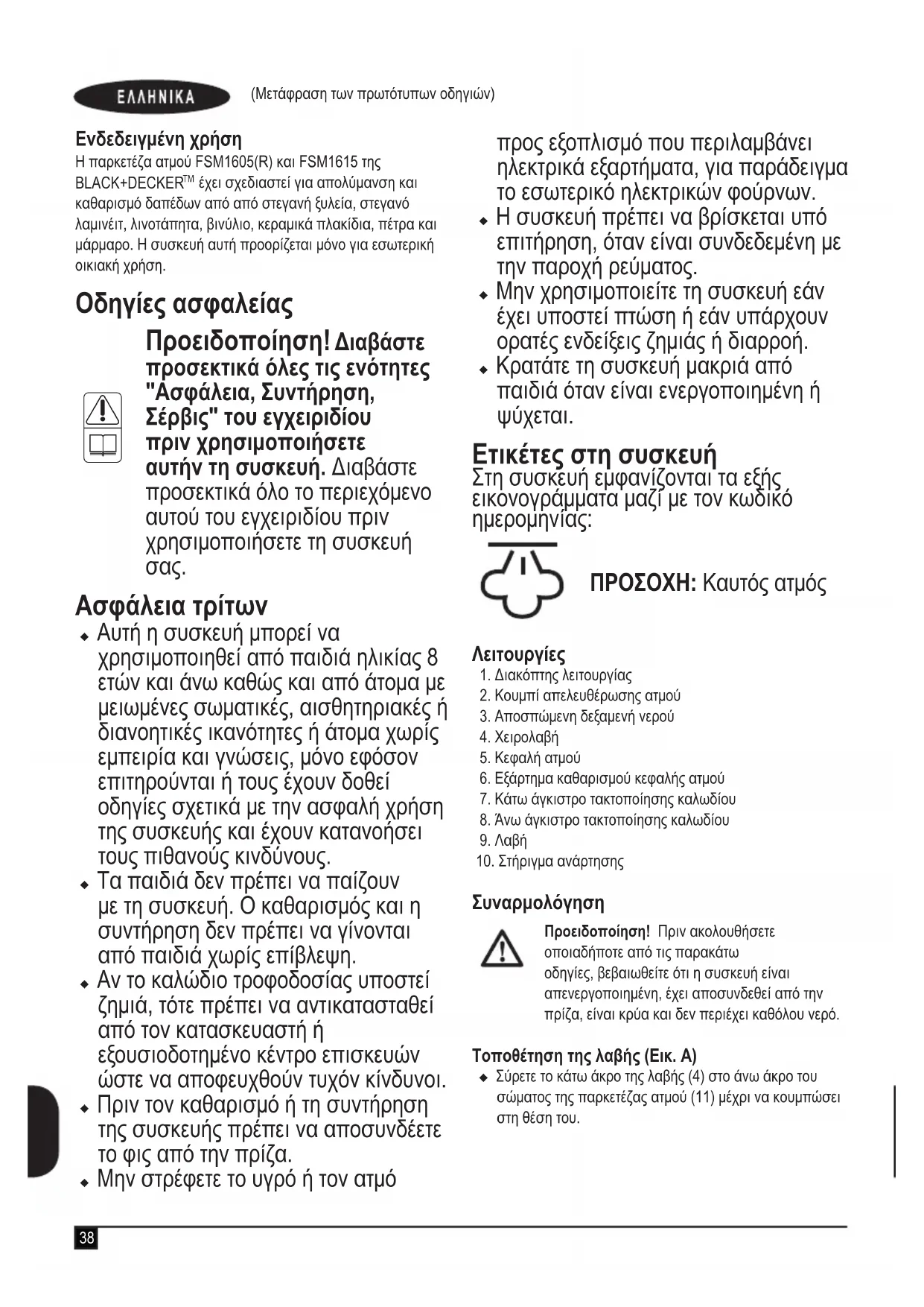 lisävarusteiden oikea asennus käyttöohjeen kappaleesta Kokoaminen.38 (Μετάφραση των πρωτότυπων οδηγιών) Ενδεδειγμένη χρήση Η παρκετέζα ατμού FSM1605(R) και FSM1615 της BLACK+DECKER έχει σχεδιαστεί για απολύμανση και καθαρισμό δαπέδων από από στεγανή ξυλεία, στεγανό λαμινέιτ, λινοτάπητα, βινύλιο, κεραμικά πλακίδια, πέτρα και μάρμαρο. Η συσκευή αυτή προορίζεται μόνο για εσωτερική οικιακή χρήση. Οδηγίες ασφαλείας
