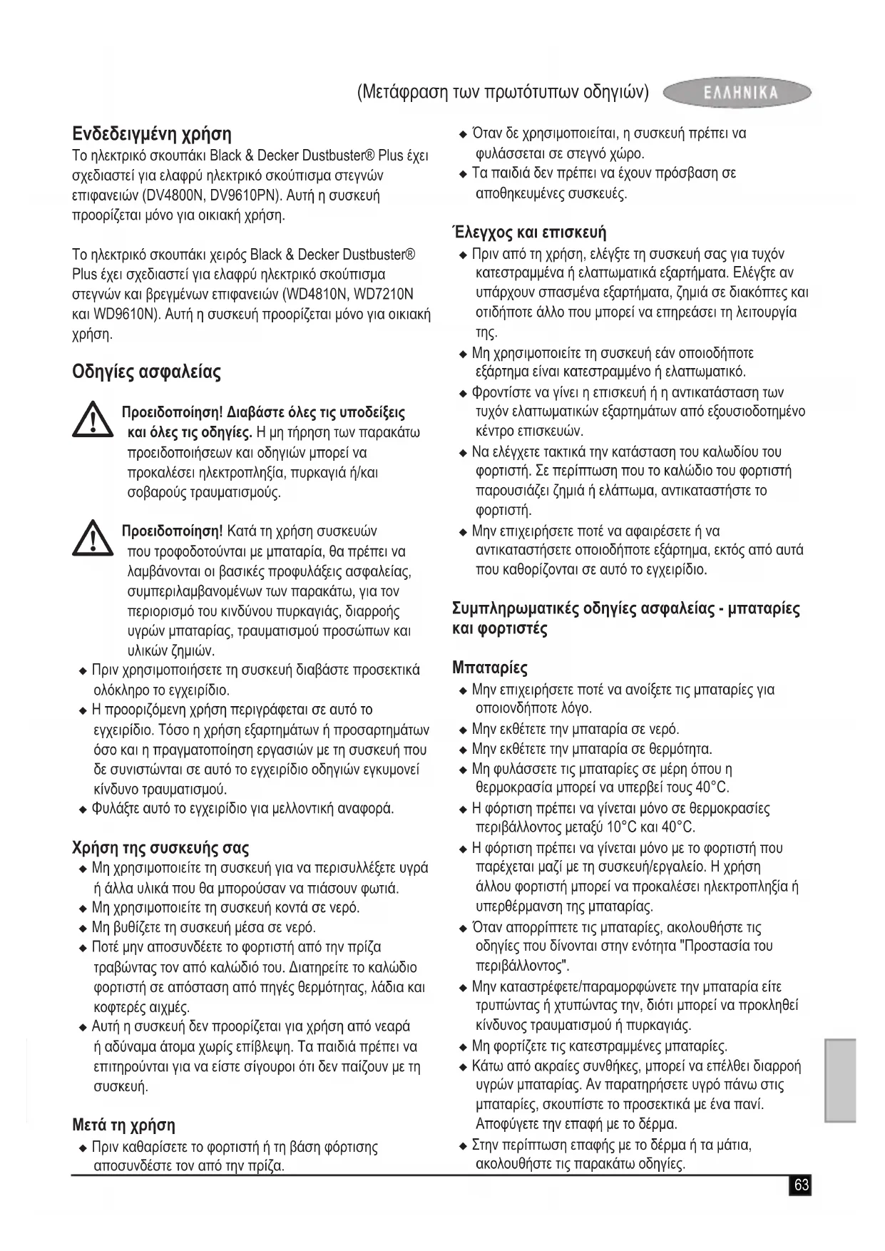 Η Black & Decker είναι σίγουρη για την ποιότητα των προϊόντων της και παρέχει μια εξαιρετική εγγύηση. Η παρούσα γραπτή εγγύηση αποτελεί πρόσθετο δικαίωμά σας και δε ζημιώνει τα νόμιμα δικαιώματά σας. Η εγγύηση ισχύει εντός της επικράτειας των Κρατών Μελών της Ευρωπαϊκής Ένωσης και της Ευρωπαϊκής Ζώνης Ελευθέρων Συναλλαγών. Σε περίπτωση που κάποιο προϊόν της Black & Decker παρουσιάσει βλάβη εξαιτίας ελαττωματικών υλικών, ποιότητας εργασίας ή έλλειψης συμφωνίας με τις προδιαγραφές εντός 24 μηνών από την ημερομηνία αγοράς, η Black & Decker εγγυάται την αντικατάσταση των ελαττωματικών τμημάτων, την επισκευή προϊόντων που έχουν υποστεί εύλογη φθορά λόγω χρήσης ή την αντικατάσταση των προϊόντων προκειμένου να εξασφαλίσει την ελάχιστη ενόχληση στους πελάτες της, εκτός εάν: u Το προϊόν έχει χρησιμοποιηθεί σε εργασιακό, επαγγελματικό περιβάλλον ή έχει ενοικιαστεί. u Έχει γίνει εσφαλμένη χρήση του προϊόντος ή έχει παραμεληθεί. u Το προϊόν έχει υποστεί βλάβη από άλλα αντικείμενα, από ουσίες ή λόγω ατυχήματος. u Έχει γίνει προσπάθεια επισκευής από μη εξουσιοδοτημένα κέντρα επισκευών ή από προσωπικό που δεν ανήκει στο προσωπικό της Black & Decker. Για να ισχύσει η εγγύηση, πρέπει να υποβάλετε απόδειξη αγοράς στον πωλητή ή το εξουσιοδοτημένο κέντρο επισκευών. Ενημερωθείτε για το πλησιέστερο εξουσιοδοτημένο κέντρο επισκευών της περιοχής σας, επικοινωνώντας με τα γραφεία της Black & Decker στη διεύθυνση που αναγράφεται στο εγχειρίδιο. Επίσης, μια λίστα με τα εξουσιοδοτημένα κέντρα επισκευών της Black & Decker και πλήρεις λεπτομέρειες για τις υπηρεσίες που παρέχονται μετά την πώληση καθώς και στοιχεία επικοινωνίας υπάρχουν στο Διαδίκτυο, στη διεύθυνση: www.2helpU.com Παρακαλούμε επισκεφθείτε την ιστοσελίδα μας www.black- anddecker.gr για να καταχωρήσετε το νέο σας προϊόν Black & Decker και για να ενημερώνεστε για τα νέα προϊόντα και τις ειδικές προσφορές. Περισσότερες πληροφορίες σχετικά με τη μάρκα Black & Decker και τη σειρά των προϊόντων μας θα βρείτε στη διεύθυνση www.blackanddecker.gr69 (Orijinal talimatların Çeviri) Kullanım amacı Black & Decker Dustbuster® el tipi elektrikli süpürgeniz, haf kuru temizlik amacıyla tasarlanmıştır (DV4800N, DV9610PN). Bu cihaz, sadece evsel kullanım için tasarlanmıştır. Black & Decker Dustbuster® el tipi elektrikli süpürgeniz, haf ıslak ve kuru temizlik amacıyla tasarlanmıştır (WD4810N, WD7210N ve WD9610N). Bu cihaz, sadece evsel kullanım için tasarlanmıştır. Güvenlik talimatları