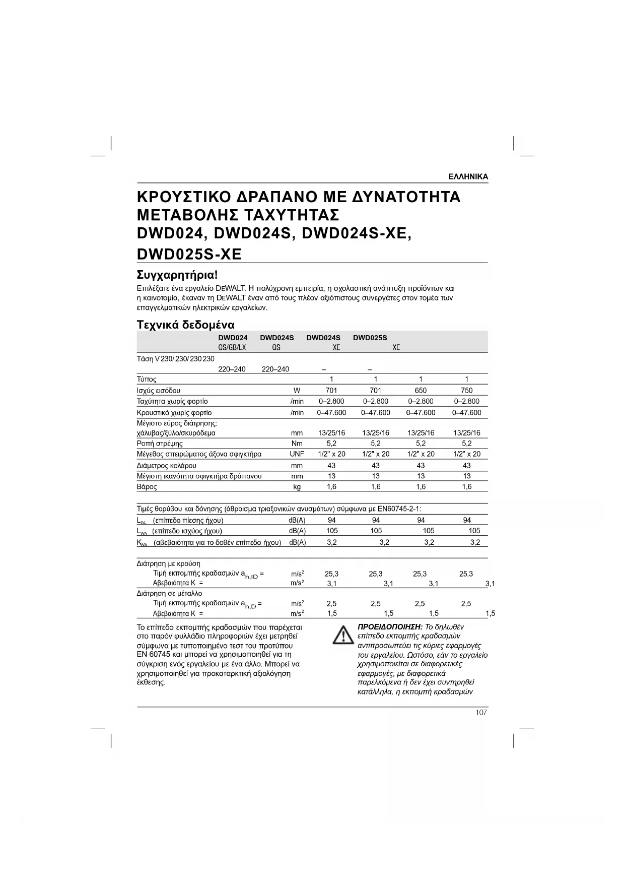 DWD025S-XE Συγχαρητήρια! Επιλέξατε ένα εργαλείο DEWALT. Η πολύχρονη εμπειρία, η σχολαστική ανάπτυξη προϊόντων και η καινοτομία, έκαναν τη DEWALT έναν από τους πλέον αξιόπιστους συνεργάτες στον τομέα των επαγγελματικών ηλεκτρικών εργαλείων. Τεχνικά δεδομένα DWD024 DWD024S DWD024S DWD025S QS/GB/LX QS XE XE Τάση V 230/ 230/ 230 230 220–240 220–240 – – Τύπος 1 1 1 1 Ισχύς εισόδου W 701 701 650 750 Ταχύτητα χωρίς φορτίο /min 0–2.800 0–2.800 0–2.800 0–2.800 Κρουστικό χωρίς φορτίο /min 0–47.600 0–47.600 0–47.600 0–47.600 Μέγιστο εύρος διάτρησης: χάλυβας/ξύλο/σκυρόδεμα mm 13/25/16 13/25/16 13/25/16 13/25/16 Ροπή στρέψης Nm 5,2 5,2 5,2 5,2 Μέγεθος σπειρώματος άξονα σφιγκτήρα UNF 1/2" x 20 1/2" x 20 1/2" x 20 1/2" x 20 Διάμετρος κολάρου mm 43 43 43 43 Μέγιστη ικανότητα σφιγκτήρα δράπανου mm 13 13 13 13 Βάρος kg 1,6 1,6 1,6 1,6 Τιμές θορύβου και δόνησης (άθροισμα τριαξονικών ανυσμάτων) σύμφωνα με EN60745-2-1: