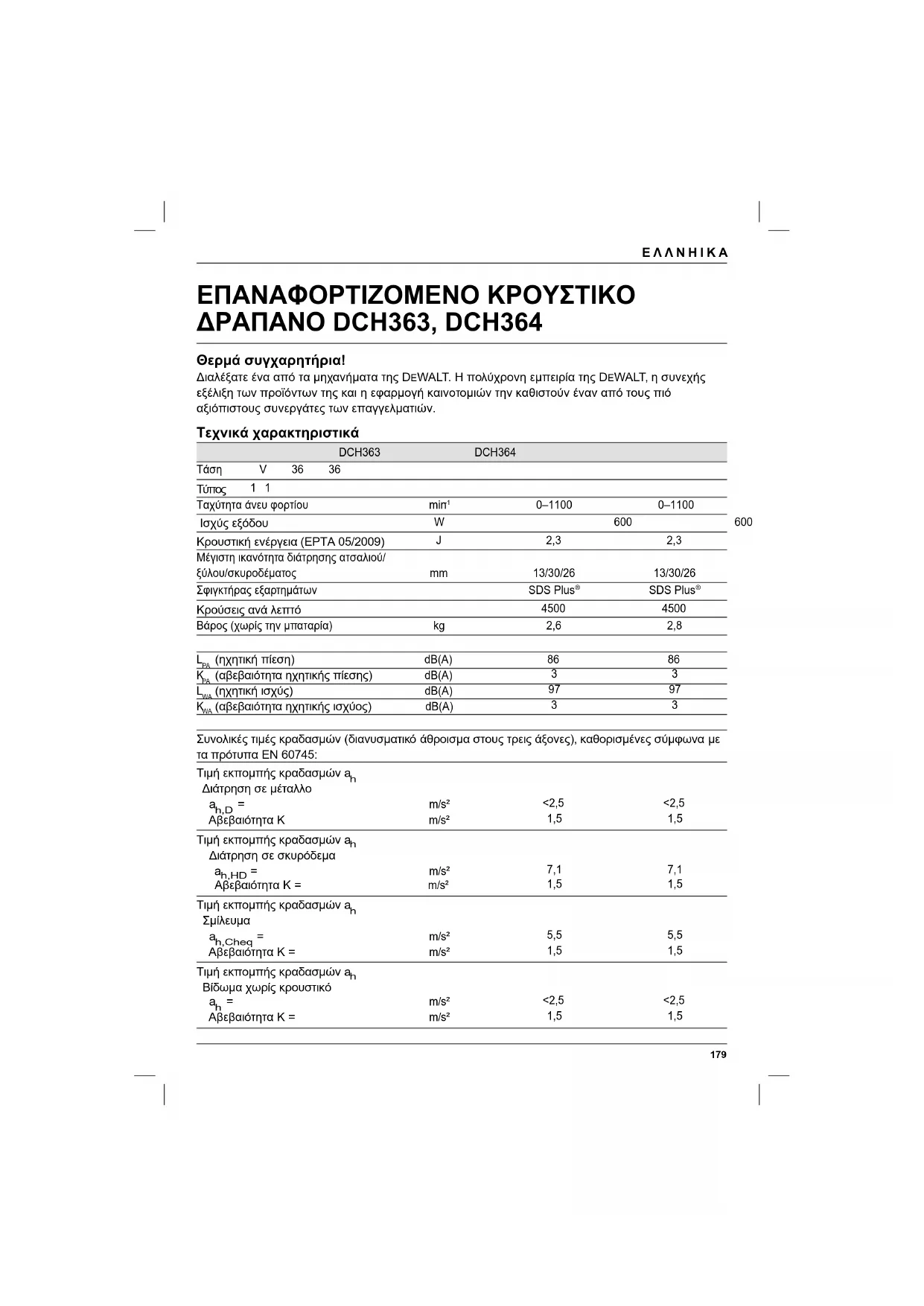 ΕΠΑΝΑΦΟΡΤΙΖΟΜΕΝΟ ΚΡΟΥΣΤΙΚΟ ΔΡΑΠΑΝΟ DCH363, DCH364 Θερμά συγχαρητήρια! Διαλέξατε ένα από τα μηχανήματα της DEWALT. Η πολύχρονη εμπειρία της DEWALT, η συνεχής εξέλιξη των προϊόντων της και η εφαρμογή καινοτομιών την καθιστούν έναν από τους πιό αξιόπιστους συνεργάτες των επαγγελματιών. Τεχνικά χαρακτηριστικά DCH363 DCH364 Τάση V 36 36