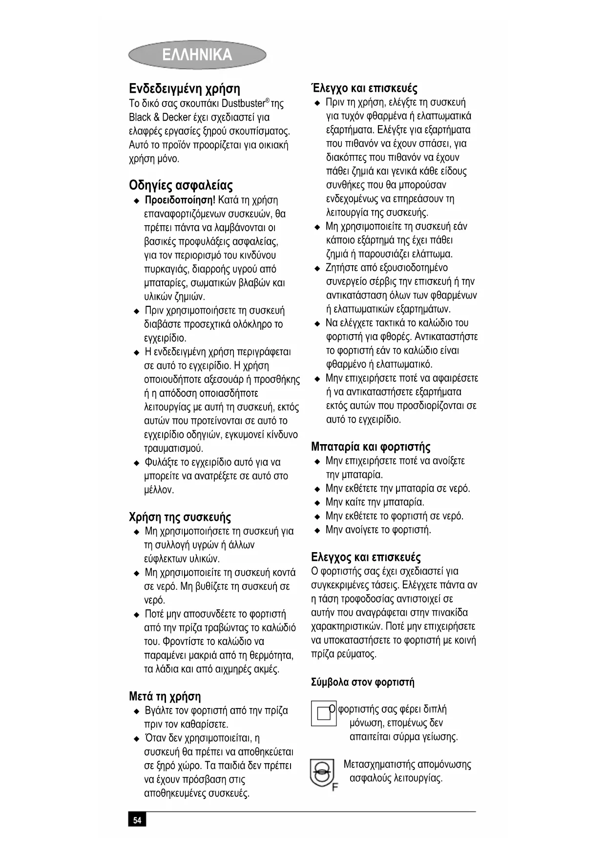 Black & Decker έχει σχεδιαστεί για ελαφρές εργασίες ξηρού σκουπίσματος. Αυτό το προϊόν προορίζεται για οικιακή χρήση μόνο. Οδηγίες ασφαλείας Προειδοποίηση! Κατά τη χρήση επαναφορτιζόμενων συσκευών, θα πρέπει πάντα να λαμβάνονται οι βασικές προφυλάξεις ασφαλείας, για τον περιορισμό του κινδύνου πυρκαγιάς, διαρροής υγρού από μπαταρίες, σωματικών βλαβών και υλικών ζημιών. Πριν χρησιμοποιήσετε τη συσκευή διαβάστε προσεχτικά ολόκληρο το εγχειρίδιο. Η ενδεδειγμένη χρήση περιγράφεται σε αυτό το εγχειρίδιο. Η χρήση οποιουδήποτε αξεσουάρ ή προσθήκης ή η απόδοση οποιασδήποτε λειτουργίας με αυτή τη συσκευή, εκτός αυτών που προτείνονται σε αυτό το εγχειρίδιο οδηγιών, εγκυμονεί κίνδυνο τραυματισμού. Φυλάξτε το εγχειρίδιο αυτό για να μπορείτε να ανατρέξετε σε αυτό στο