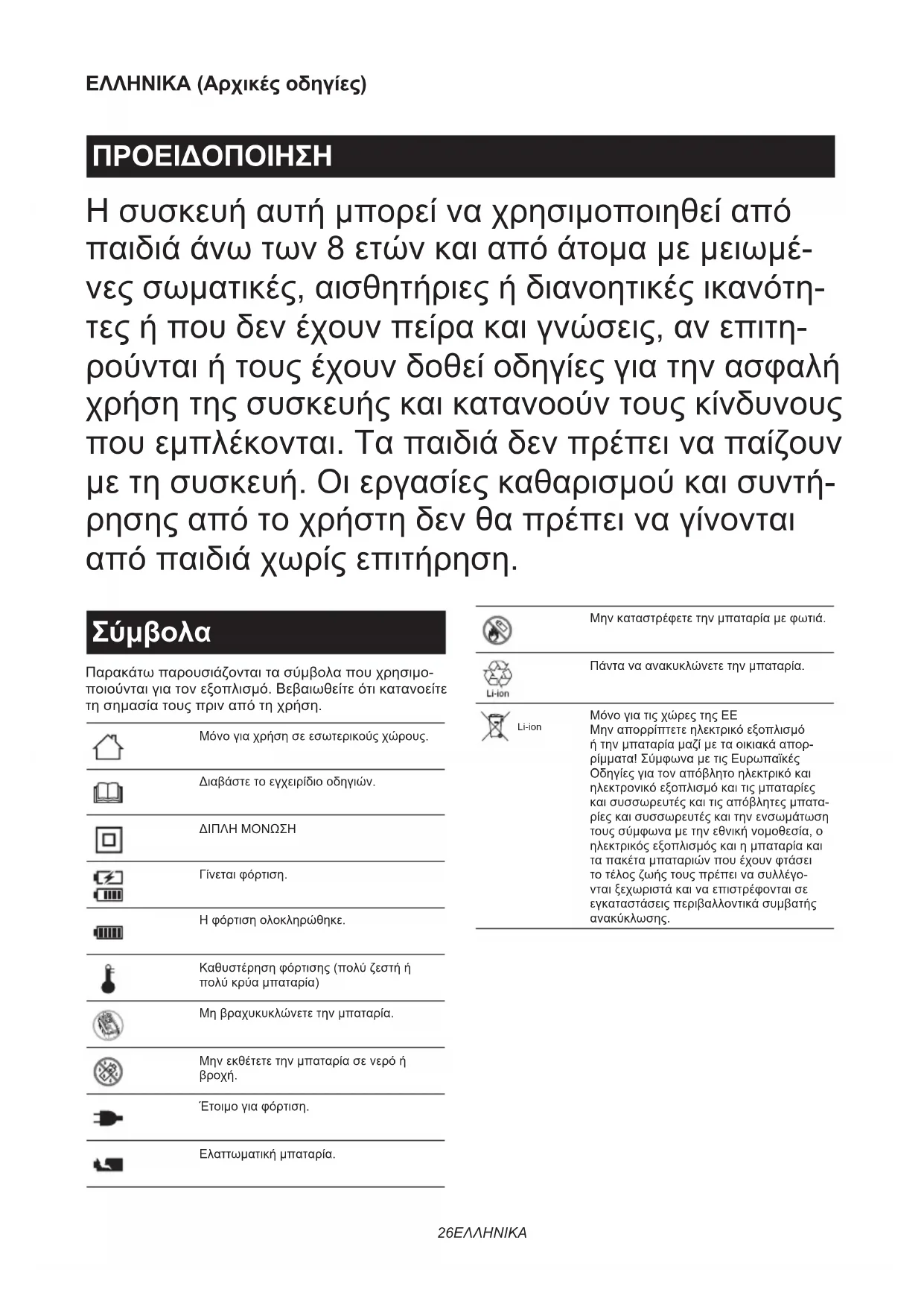 - Akku, der har ligget i lang tid på et sted, som er udsat for kold luft. Opladningen starter, når akkuens temperatur når et niveau, hvor opladning er mulig. BEMÆRK: Hvis opladningslampen blinker skiftevist grønt og rødt, er opladning ikke mulig. Terminalerne på opla- deren eller akkuen er tilstoppede med støv, eller akkuen er udslidt eller beskadiget.26 ΕΛΛΗΝΙΚΑ ΕΛΛΗΝΙΚΑ (Αρχικές οδηγίες) ΠΡΟΕΙΔΟΠΟΙΗΣΗ Η συσκευή αυτή μπορεί να χρησιμοποιηθεί από παιδιά άνω των 8 ετών και από άτομα με μειωμέ- νες σωματικές, αισθητήριες ή διανοητικές ικανότη- τες ή που δεν έχουν πείρα και γνώσεις, αν επιτη- ρούνται ή τους έχουν δοθεί οδηγίες για την ασφαλή χρήση της συσκευής και κατανοούν τους κίνδυνους που εμπλέκονται. Τα παιδιά δεν πρέπει να παίζουν με τη συσκευή. Οι εργασίες καθαρισμού και συντή- ρησης από το χρήστη δεν θα πρέπει να γίνονται από παιδιά χωρίς επιτήρηση.