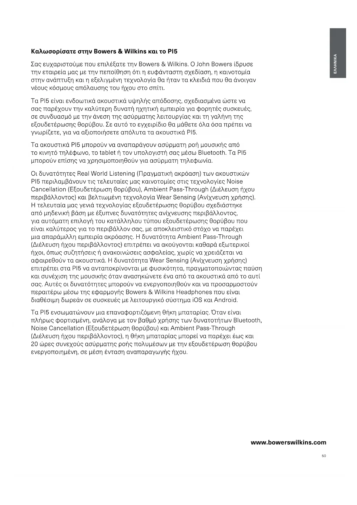 www.bowerswilkins.com Καλωσορίσατε στην Bowers & Wilkins και το PI5 Σας ευχαριστούμε που επιλέξατε την Bowers & Wilkins. Ο John Bowers ίδρυσε την εταιρεία μας με την πεποίθηση ότι η ευφάνταστη σχεδίαση, η καινοτομία στην ανάπτυξη και η εξελιγμένη τεχνολογία θα ήταν τα κλειδιά που θα άνοιγαν νέους κόσμους απόλαυσης του ήχου στο σπίτι. Τα PI5 είναι ενδοωτικά ακουστικά υψηλής απόδοσης, σχεδιασμένα ώστε να σας παρέχουν την καλύτερη δυνατή ηχητική εμπειρία για φορητές συσκευές, σε συνδυασμό με την άνεση της ασύρματης λειτουργίας και τη γαλήνη της εξουδετέρωσης θορύβου. Σε αυτό το εγχειρίδιο θα μάθετε όλα όσα πρέπει να γνωρίζετε, για να αξιοποιήσετε απόλυτα τα ακουστικά PI5. Τα ακουστικά PI5 μπορούν να αναπαράγουν ασύρματη ροή μουσικής από το κινητό τηλέφωνο, το tablet ή τον υπολογιστή σας μέσω Bluetooth. Τα PI5 μπορούν επίσης να χρησιμοποιηθούν για ασύρματη τηλεφωνία. Οι δυνατότητες Real World Listening (Πραγματική ακρόαση) των ακουστικών PI5 περιλαμβάνουν τις τελευταίες μας καινοτομίες στις τεχνολογίες Noise Cancellation (Εξουδετέρωση θορύβου), Ambient Pass-Through (Διέλευση ήχου περιβάλλοντος) και βελτιωμένη τεχνολογία Wear Sensing (Ανίχνευση χρήσης). Η τελευταία μας γενιά τεχνολογίας εξουδετέρωσης θορύβου σχεδιάστηκε από μηδενική βάση με έξυπνες δυνατότητες ανίχνευσης περιβάλλοντος, για αυτόματη επιλογή του κατάλληλου τύπου εξουδετέρωσης θορύβου που είναι καλύτερος για το περιβάλλον σας, με αποκλειστικό στόχο να παρέχει μια απαράμιλλη εμπειρία ακρόασης. Η δυνατότητα Ambient Pass-Through (Διέλευση ήχου περιβάλλοντος) επιτρέπει να ακούγονται καθαρά εξωτερικοί ήχοι, όπως συζητήσεις ή ανακοινώσεις ασφαλείας, χωρίς να χρειάζεται να αφαιρεθούν τα ακουστικά. Η δυνατότητα Wear Sensing (Ανίχνευση χρήσης) επιτρέπει στα PI5 να ανταποκρίνονται με φυσικότητα, πραγματοποιώντας παύση και συνέχιση της μουσικής όταν ανασηκώνετε ένα από τα ακουστικά από το αυτί σας. Αυτές οι δυνατότητες μπορούν να ενεργοποιηθούν και να προσαρμοστούν περαιτέρω μέσω της εφαρμογής Bowers & Wilkins Headphones που είναι διαθέσιμη δωρεάν σε συσκευές με λειτουργικό σύστημα iOS και Android. Τα PI5 ενσωματώνουν μια επαναφορτιζόμενη θήκη μπαταρίας. Όταν είναι πλήρως φορτισμένη, ανάλογα με τον βαθμό χρήσης των δυνατοτήτων Bluetooth, Noise Cancellation (Εξουδετέρωση θορύβου) και Ambient Pass-Through (Διέλευση ήχου περιβάλλοντος), η θήκη μπαταρίας μπορεί να παρέχει έως και 20 ώρες συνεχούς ασύρματης ροής πολυμέσων με την εξουδετέρωση θορύβου ενεργοποιημένη, σε μέση ένταση αναπαραγωγής ήχου.