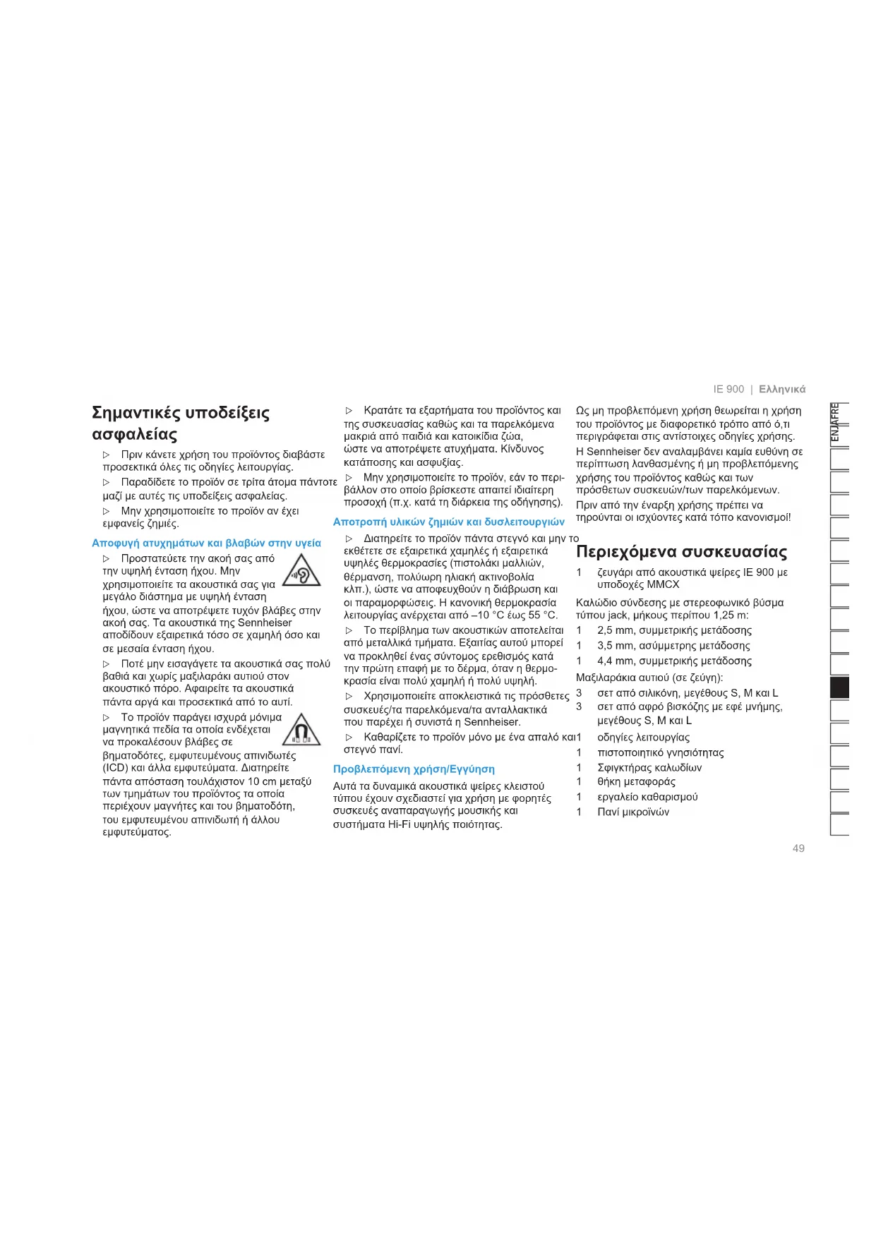 ▷ Πριν κάνετε χρήση του προϊόντος διαβάστε προσεκτικά όλες τις οδηγίες λειτουργίας. ▷ Παραδίδετε το προϊόν σε τρίτα άτομα πάντοτε μαζί με αυτές τις υποδείξεις ασφαλείας. ▷ Μην χρησιμοποιείτε το προϊόν αν έχει εμφανείς ζημιές. Αποφυγή ατυχημάτων και βλαβών στην υγεία ▷ Προστατεύετε την ακοή σας από την υψηλή ένταση ήχου. Μην χρησιμοποιείτε τα ακουστικά σας για μεγάλο διάστημα με υψηλή ένταση ήχου, ώστε να αποτρέψετε τυχόν βλάβες στην ακοή σας. Τα ακουστικά της Sennheiser αποδίδουν εξαιρετικά τόσο σε χαμηλή όσο και σε μεσαία ένταση ήχου. ▷ Ποτέ μην εισαγάγετε τα ακουστικά σας πολύ βαθιά και χωρίς μαξιλαράκι αυτιού στον ακουστικό πόρο. Αφαιρείτε τα ακουστικά πάντα αργά και προσεκτικά από το αυτί. ▷ Το προϊόν παράγει ισχυρά μόνιμα μαγνητικά πεδία τα οποία ενδέχεται να προκαλέσουν βλάβες σε βηματοδότες, εμφυτευμένους απινιδωτές (ICD) και άλλα εμφυτεύματα. Διατηρείτε πάντα απόσταση τουλάχιστον 10 cm μεταξύ των τμημάτων του προϊόντος τα οποία περιέχουν μαγνήτες και του βηματοδότη, του εμφυτευμένου απινιδωτή ή άλλου εμφυτεύματος. ▷ Κρατάτε τα εξαρτήματα του προϊόντος και της συσκευασίας καθώς και τα παρελκόμενα μακριά από παιδιά και κατοικίδια ζώα, ώστε να αποτρέψετε ατυχήματα. Κίνδυνος κατάποσης και ασφυξίας. ▷ Μην χρησιμοποιείτε το προϊόν, εάν το περι- βάλλον στο οποίο βρίσκεστε απαιτεί ιδιαίτερη προσοχή (π.χ. κατά τη διάρκεια της οδήγησης). Αποτροπή υλικών ζημιών και δυσλειτουργιών ▷ Διατηρείτε το προϊόν πάντα στεγνό και μην το εκθέτετε σε εξαιρετικά χαμηλές ή εξαιρετικά υψηλές θερμοκρασίες (πιστολάκι μαλλιών, θέρμανση, πολύωρη ηλιακή ακτινοβολία κλπ.), ώστε να αποφευχθούν η διάβρωση και οι παραμορφώσεις. Η κανονική θερμοκρασία λειτουργίας ανέρχεται από –10 °C έως 55 °C. ▷ Το περίβλημα των ακουστικών αποτελείται από μεταλλικά τμήματα. Εξαιτίας αυτού μπορεί να προκληθεί ένας σύντομος ερεθισμός κατά την πρώτη επαφή με το δέρμα, όταν η θερμο- κρασία είναι πολύ χαμηλή ή πολύ υψηλή. ▷ Χρησιμοποιείτε αποκλειστικά τις πρόσθετες συσκευές/τα παρελκόμενα/τα ανταλλακτικά που παρέχει ή συνιστά η Sennheiser. ▷ Καθαρίζετε το προϊόν μόνο με ένα απαλό και στεγνό πανί. Προβλεπόμενη χρήση/Εγγύηση Αυτά τα δυναμικά ακουστικά ψείρες κλειστού τύπου έχουν σχεδιαστεί για χρήση με φορητές συσκευές αναπαραγωγής μουσικής και συστήματα Hi-Fi υψηλής ποιότητας. Ως μη προβλεπόμενη χρήση θεωρείται η χρήση του προϊόντος με διαφορετικό τρόπο από ό,τι περιγράφεται στις αντίστοιχες οδηγίες χρήσης. Η Sennheiser δεν αναλαμβάνει καμία ευθύνη σε περίπτωση λανθασμένης ή μη προβλεπόμενης χρήσης του προϊόντος καθώς και των πρόσθετων συσκευών/των παρελκόμενων. Πριν από την έναρξη χρήσης πρέπει να τηρούνται οι ισχύοντες κατά τόπο κανονισμοί! Περιεχόμενα συσκευασίας 1 ζευγάρι από ακουστικά ψείρες IE 900 με υποδοχές MMCX Καλώδιο σύνδεσης με στερεοφωνικό βύσμα τύπου jack, μήκους περίπου 1,25 m: 1 2,5 mm, συμμετρικής μετάδοσης 1 3,5 mm, ασύμμετρης μετάδοσης 1 4,4 mm, συμμετρικής μετάδοσης Μαξιλαράκια αυτιού (σε ζεύγη): 3 σετ από σιλικόνη, μεγέθους S, M και L 3 σετ από αφρό βισκόζης με εφέ μνήμης, μεγέθους S, M και L 1 οδηγίες λειτουργίας 1 πιστοποιητικό γνησιότητας 1 Σφιγκτήρας καλωδίων 1 θήκη μεταφοράς 1 εργαλείο καθαρισμού 1 Πανί μικροϊνών50 Ελληνικά | IE 900 Τα Sennheiser IE 900 Για τους πιο απαιτητικούς λάτρεις της μουσικής, η αναζήτηση του ιδανικού ήχου είναι μια ασταμάτητη προσπάθεια για τελειότητα. Εμπνευσμένα από αυτό τ