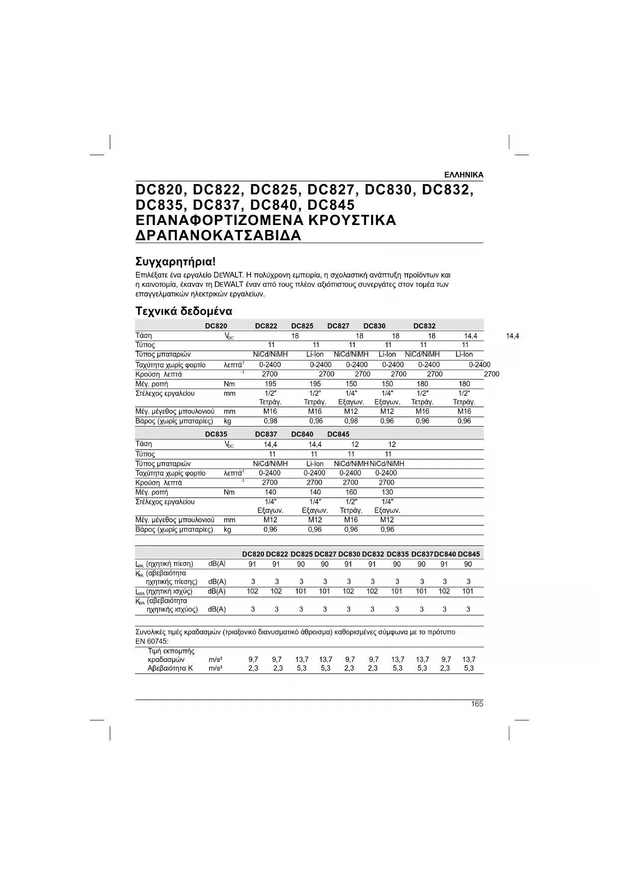 DC820, DC822, DC825, DC827, DC830, DC832, DC835, DC837, DC840, DC845 ΕΠΑΝΑΦΟΡΤΙΖΟΜΕΝΑ ΚΡΟΥΣΤΙΚΑ ΔΡΑΠΑΝΟΚΑΤΣΑΒΙΔΑ Συγχαρητήρια! Επιλέξατε ένα εργαλείο DEWALT. Η πολύχρονη εμπειρία, η σχολαστική ανάπτυξη προϊόντων και η καινοτομία, έκαναν τη DEWALT έναν από τους πλέον αξιόπιστους συνεργάτες στον τομέα των επαγγελματικών ηλεκτρικών εργαλείων. Τεχνικά δεδομένα DC820 DC822 DC825 DC827 DC830 DC832 Τάση V
