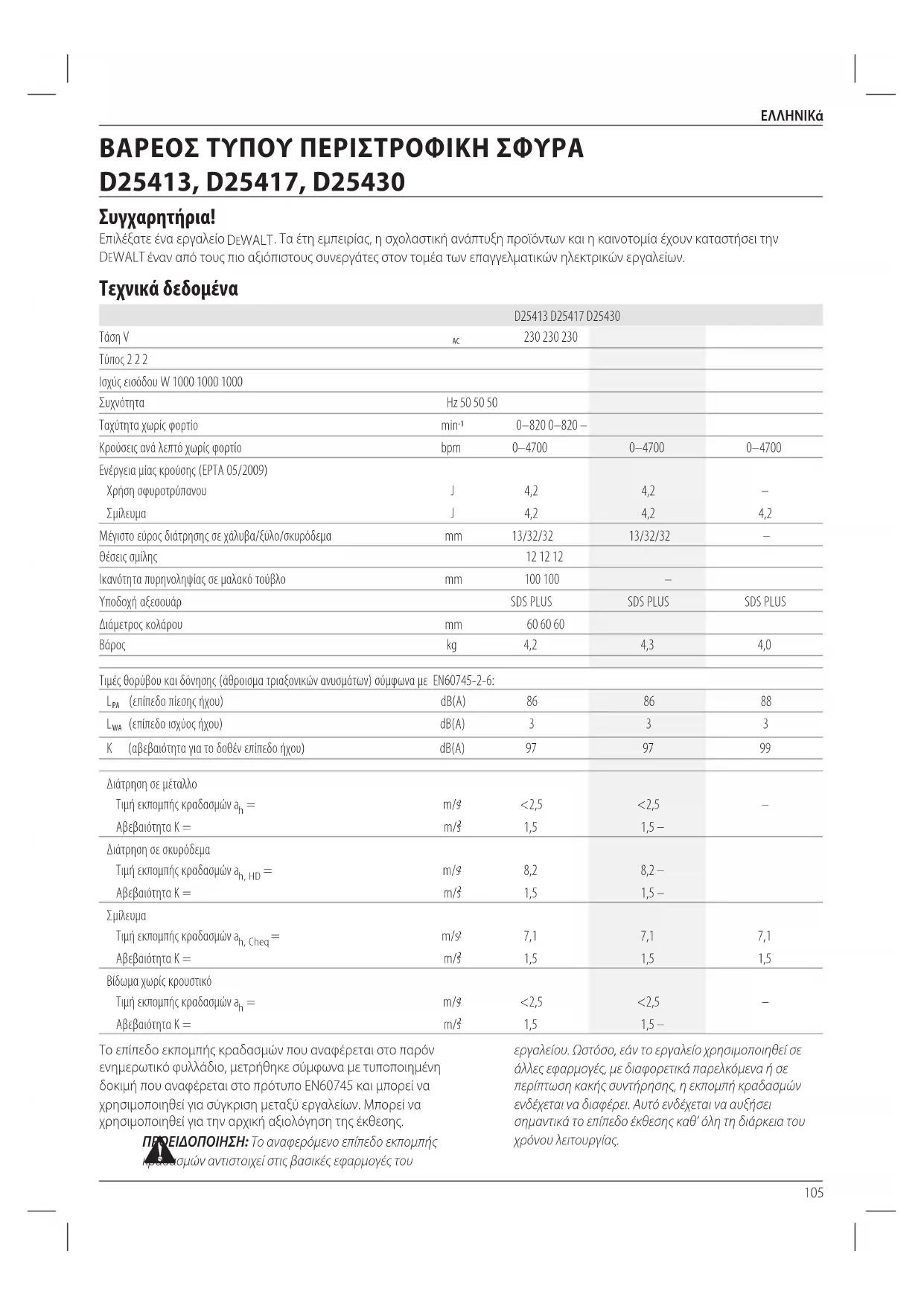 ΠΡΟΕΙΔΟΠΟΙΗΣΗ: Το αναφερόμενο επίπεδο εκπομπής κραδασμών αντιστοιχεί στις βασικές εφαρμογές του εργαλείου. Ωστόσο, εάν το εργαλείο χρησιμοποιηθεί σε άλλες εφαρμογές, με διαφορετικά παρελκόμενα ή σε περίπτωση κακής συντήρησης, η εκπομπή κραδασμών ενδέχεται να διαφέρει. Αυτό ενδέχεται να αυξήσει σημαντικά το επίπεδο έκθεσης καθ’ όλη τη διάρκεια του χρόνουλειτουργίας. Ελληνικά (μετάφραση από τις πρωτότυπες οδηγίες) ΒΑΡΕΟΣ ΤΥΠΟΥ ΠΕΡΙΣΤΡΟΦΙΚΗ ΣΦΥΡΑ D25413, D25417, D25430 Συγχαρητήρια! Επιλέξατε ένα εργαλείο DeWALT . Τα έτη εμπειρίας, η σχολαστική ανάπτυξη προϊόντων και ηκαινοτομία έχουν καταστήσει την DeWALT έναν από τους πιο αξιόπιστους συνεργάτες στον τομέα των επαγγελματικών ηλεκτρικώνεργαλείων. Τεχνικά δεδομένα D25413 D25417 D25430 Τάση V