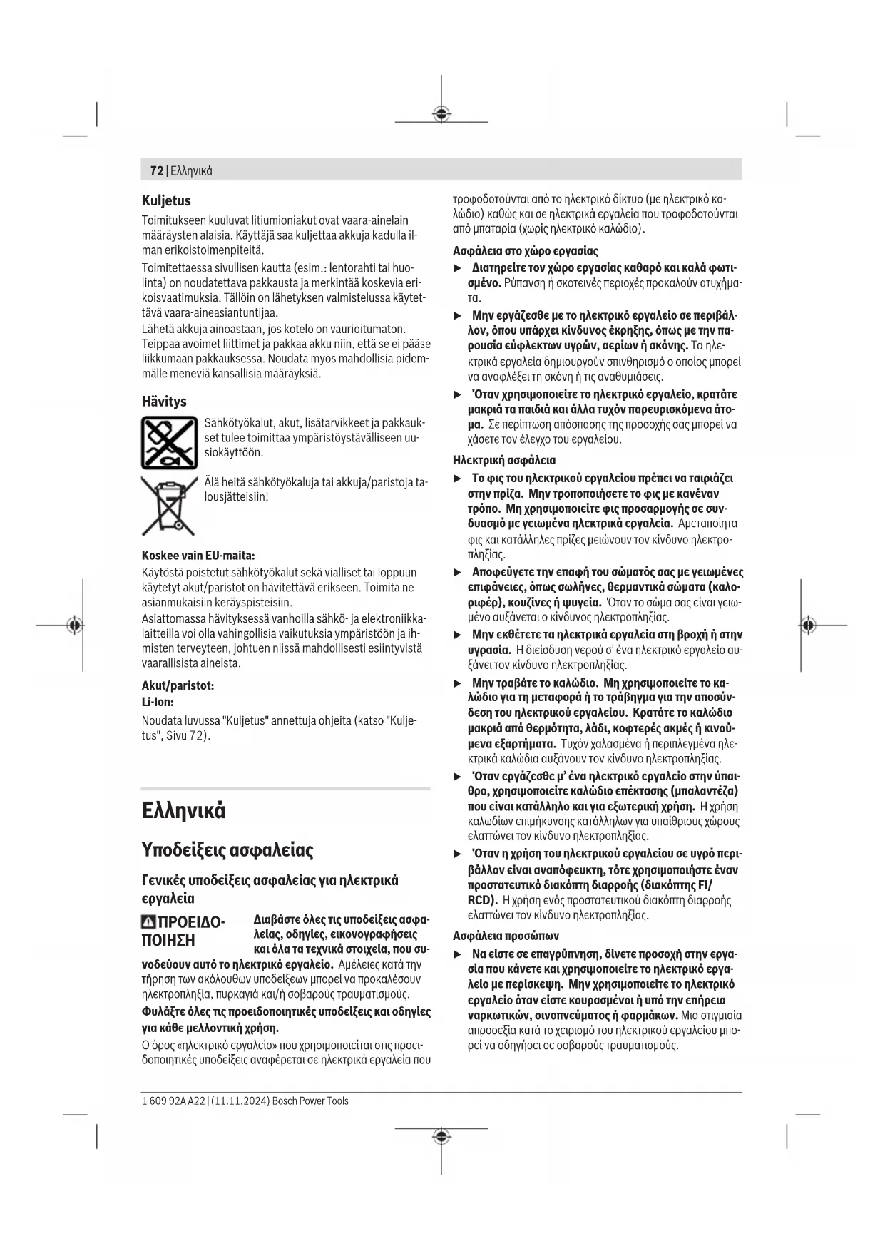 u Χρησιμοποιείτε τα ηλεκτρικά εργαλεία μόνο με τις ειδι- κά σχεδιασμένες μπαταρίες. Η χρήση άλλων μπαταριών μπορεί να οδηγήσει σε τραυματισμούς και να δημιουργήσει κίνδυνο πυρκαγιάς. u Όταν η μπαταρία δε χρησιμοποιείται, κρατήστε την μα- κριά από άλλα μεταλλικά αντικείμενα, όπως συνδετή- ρες χαρτιών, νομίσματα, κλειδιά, καρφιά, βίδες ή άλλα μικρά μεταλλικά αντικείμενα που μπορούν να βραχυκυ- κλώσουν τις επαφές της μπαταρίας. Ένα βραχυκύκλωμα των επαφών της μπαταρίας μπορεί να προκαλέσει τραυματι- σμούς ή φωτιά. u Μια τυχόν εσφαλμένη χρήση μπορεί να οδηγήσει σε διαρροή υγρών από την μπαταρία. Αποφεύγετε κάθε επαφή μ’ αυτά. Σε περίπτωση τυχαίας επαφής ξεπλύνε- τε καλά με νερό. Εάν τα υγρά έρθουν σε επαφή με τα μάτια, ζητήστε επιπλέον ιατρική βοήθεια. Διαρρέοντα υγρά μπαταρίας μπορεί να οδηγήσουν σε ερεθισμούς του δέρματος ή σε εγκαύματα. Bosch Power Tools 1 609 92A A22 | (11.11.2024)74 | Ελληνικά u Μην χρησιμοποιείτε μπαταρία ή εργαλείο που είναι κα- τεστραμμένο ή τροποποιημένο. Οι χαλασμένες ή τροπο- ποιημένες μπαταρίες μπορεί να παρουσιάσουν μια απρόβλεπτη συμπεριφορά και να οδηγήσουν σε φωτιά, έκρηξη ή σε κίνδυνο τραυματισμού. u Μην εκθέτετε μια μπαταρία ή ένα εργαλείο μπαταρίας σε φωτιά ή σε πολύ υψηλές θερμοκρασίες. Η έκθεση στη φωτιά ή σε θερμοκρασία πάνω από τους 130 °C μπορεί να προκαλέσει έκρηξη. u Τηρείτε όλες τις υποδείξεις για τη φόρτιση και μη φορ- τίζετε την μπαταρία ή το εργαλείο μπαταρίας ποτέ εκτός της περιοχής θερμοκρασίας που αναφέρεται στις οδηγίες λειτουργίας. Η λάθος φόρτιση ή η φόρτιση εκτός της επιτρεπτής περιοχής θερμοκρασίας μπορεί να κατα- στρέψει την μπαταρία και να αυξήσει τον κίνδυνο πυρκα-