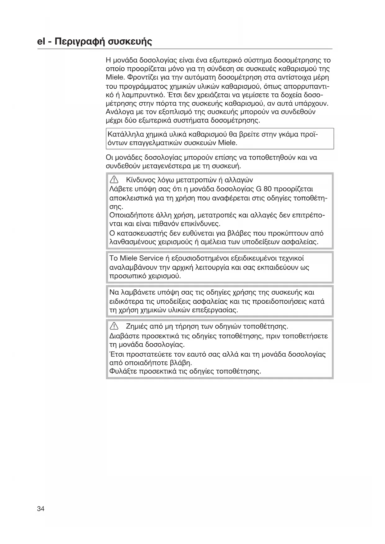 Η μονάδα δοσολογίας είναι ένα εξωτερικό σύστημα δοσομέτρησης το οποίο προορίζεται μόνο για τη σύνδεση σε συσκευές καθαρισμού της Miele. Φροντίζει για την αυτόματη δοσομέτρηση στα αντίστοιχα μέρη του προγράμματος χημικών υλικών καθαρισμού, όπως απορρυπαντι- κό ή λαμπρυντικό. Έτσι δεν χρειάζεται να γεμίσετε τα δοχεία δοσο- μέτρησης στην πόρτα της συσκευής καθαρισμού, αν αυτά υπάρχουν. Ανάλογα με τον εξοπλισμό της συσκευής μπορούν να συνδεθούν μέχρι δύο εξωτερικά συστήματα δοσομέτρησης. Κατάλληλα χημικά υλικά καθαρισμού θα βρείτε στην γκάμα προϊ- όντων επαγγελματικών συσκευών Miele. Οι μονάδες δοσολογίας μπορούν επίσης να τοποθετηθούν και να συνδεθούν μεταγενέστερα με τη συσκευή. Κίνδυνος λόγω μετατροπών ή αλλαγών Λάβετε υπόψη σας ότι η μονάδα δοσολογίας G 80 προορίζεται αποκλειστικά για τη χρήση που αναφέρεται στις οδηγίες τοποθέτη-
