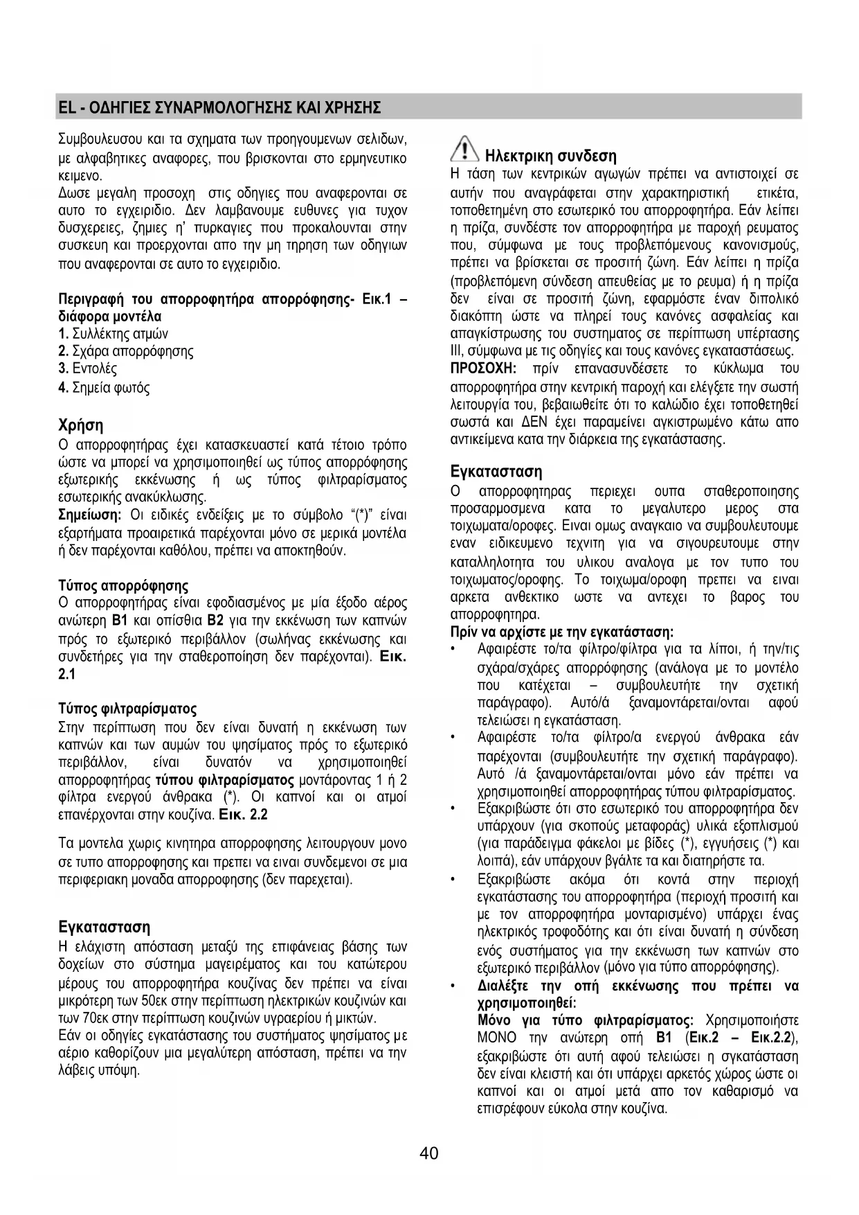 ∆ωσε µεγαλη προσοχη στις οδηγιες που αναφερονται σε αυτο το εγχειριδιο. ∆εν λαµβανουµε ευθυνες για τυχον δυσχερειες, ζηµιες η’ πυρκαγιες που προκαλουνται στην συσκευη και προερχονται απο την µη τηρηση των οδηγιων που αναφερονται σε αυτο το εγχειριδιο. Περιγραφή του απορροφητήρα απορρόφησης- Εικ.1 – διάφορα µοντέλα