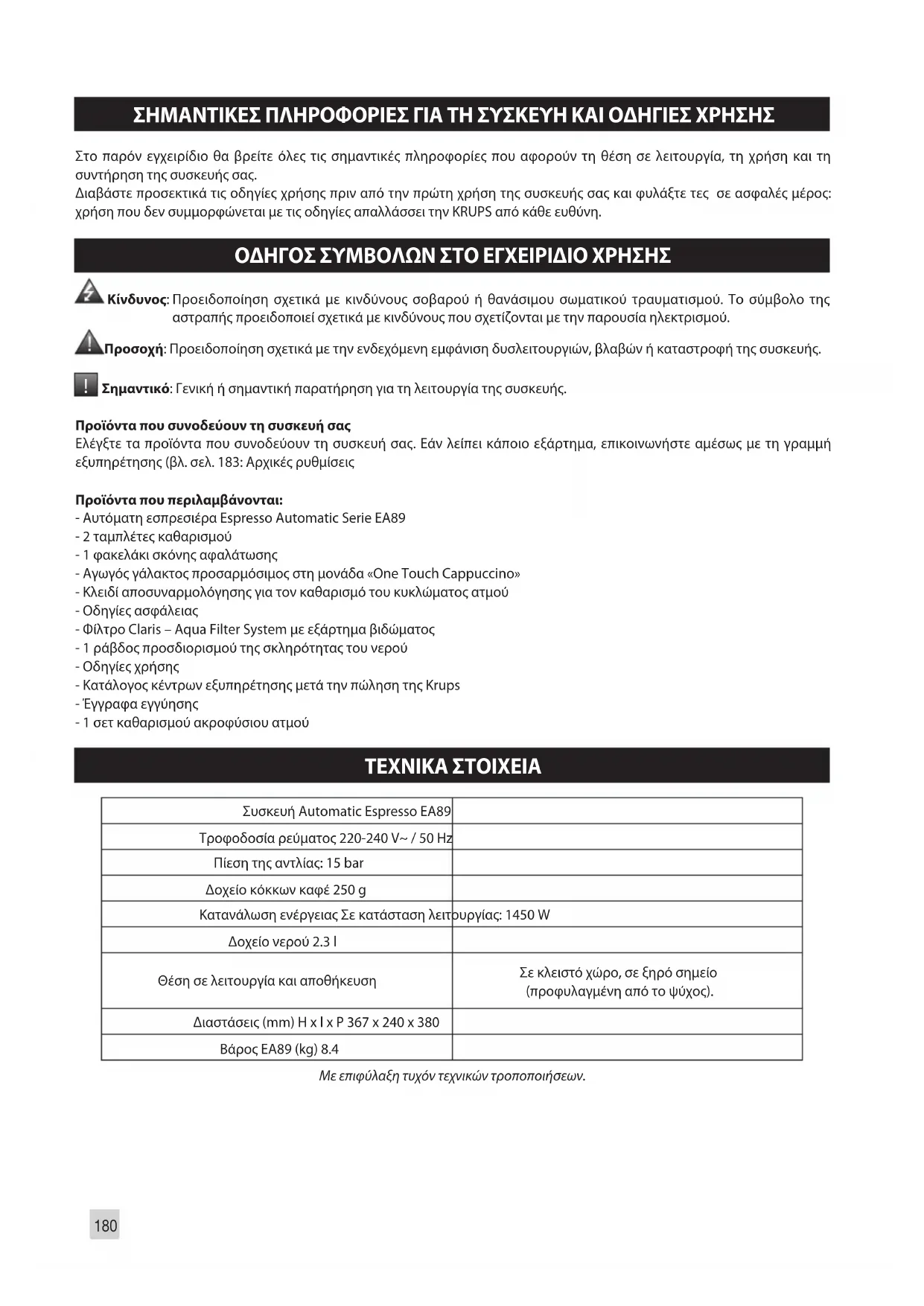 ΠΕΡΙΕΧΟΜΕΝΑ ΣΗΜΑΝΤΙΚΕΣ ΠΛΗΡΟΦΟΡΙΕΣ ΓΙΑ ΤΗ ΣΥΣΚΕΥΗ ΚΑΙ ΟΔΗΓΙΕΣ ΧΡΗΣΗΣ ..................................p. 180 ΤΕΧΝΙΚΑ ΣΤΟΙΧΕΙΑ ............................................................................................................p. 180 ΠΕΡΙΓΡΑΦΗ ΤΗΣ ΣΥΣΚΕΥΗΣ ..............................................................................................p. 181 ΕΠΙΣΚΟΠΗΣΗ ...................................................................................................................p. 181 ΕΦΑΡΜΟΓΗ KRUPS ...........................................................................................................p. 182 ΕΝΑΡΞΗ ΛΕΙΤΟΥΡΓΙΑΣ ΕΓΚΑΤΑΣΤΑΣΗ ΤΗΣ ΣΥΣΚΕΥΗΣ ..........................................................................................p. 183 ΠΡΙΝ ΑΠΟ ΤΗΝ ΠΑΡΑΣΚΕΥΗ ΤΩΝ ΡΟΦΗΜΑΤΩΝ ΣΗΜΑΝΤΙΚΈΣ ΥΠΟΔΕΊΞΕΙΣ ................................................................................................p. 184 ΠΑΡΑΣΚΕΥΗ ΡΟΦΗΜΑΤΩΝ ΚΑΦΕ ΜΕ ΑΜΕΣΗ ΠΡΟΣΒΑΣΗ ...................................................p. 185 ΑΜΕΣΗ ΠΡΟΣΒΑΣΗ ΣΤΗΝ ΠΑΡΑΣΚΕΥΗ ΡΟΦΗΜΑΤΩΝ ΜΕ ΓΑΛΑ ..........................................p. 185 ΡΟΦΗΜΑΤΑ ΤΣΑΓΙΩΝ .......................................................................................................p. 186 ΠΑΡΑΣΚΕΥΗ ΑΛΛΩΝ ΡΟΦΗΜΑΤΩΝ: ΡΙΣΤΡΕΤΟ, ΝΤΟΠΙΟ, ΑΜΕΡΙΚΑΝΟ Η ΑΦΡΟΓΑΛΑ ............p. 186 ΑΛΛΕΣ ΛΕΙΤΟΥΡΓΙΕΣ .........................................................................................................p. 187 ΓΕΝΙΚΗ ΣΥΝΤΗΡΗΣΗ .........................................................................................................p. 188 ΠΡΟΒΛΗΜΑΤΑ ΚΑΙ ΤΡΟΠΟΙ ΑΝΤΙΜΕΤΩΠΙΣΗΣ .....................................................................p. 190180 ΣΗΜΑΝΤΙΚΕΣ ΠΛΗΡΟΦΟΡΙΕΣ ΓΙΑ ΤΗ ΣΥΣΚΕΥΗ ΚΑΙ ΟΔΗΓΙΕΣ ΧΡΗΣΗΣ Στο παρόν εγχειρίδιο θα βρείτε όλες τις σημαντικές πληροφορίες που αφορούν τη θέση σε λειτουργία, τη χρήση και τη συντήρηση της συσκευής σας. Διαβάστε προσεκτικά τις οδηγίες χρήσης πριν από την πρώτη χρήση της συσκευής σας και φυλάξτε τες σε ασφαλές μέρος: χρήση που δεν συμμορφώνεται με τις οδηγίες απαλλάσσει την KRUPS από κάθε ευθύνη. ΟΔΗΓΟΣ ΣΥΜΒΟΛΩΝ ΣΤΟ ΕΓΧΕΙΡΙΔΙΟ ΧΡΗΣΗΣ Κίνδυνος: Προειδοποίηση σχετικά με κινδύνους σοβαρού ή θανάσιμου σωματικού τραυματισμού. Το σύμβολο της αστραπής προειδοποιεί σχετικά με κινδύνους που σχετίζονται με την παρουσία ηλεκτρισμού. Προσοχή: Προειδοποίηση σχετικά με την ενδεχόμενη εμφάνιση δυσλειτουργιών, βλαβών ή καταστροφή της συσκευής.