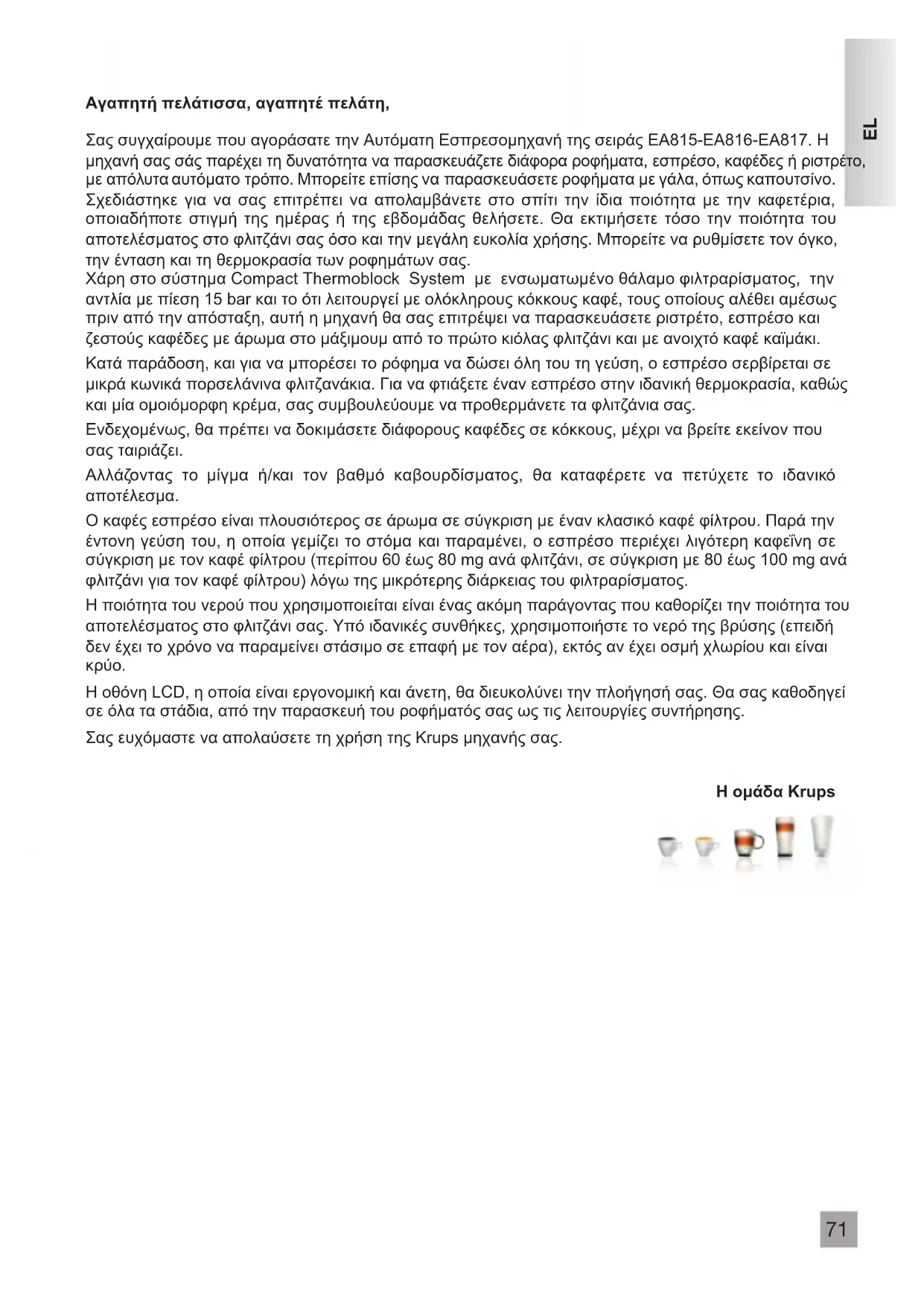 Αγαπητήπελάτισσα,αγαπητέπελάτη, Σας συγχαίρουμε που αγοράσατε την Αυτόματη Εσπρεσομηχανή της σειράς EA815-EA816-EA817. Η μηχανή σας σάς παρέχει τη δυνατότητα να παρασκευάζετε διάφορα ροφήματα, εσπρέσο, καφέδες ή ριστρέτο, με απόλυτα αυτόματο τρόπο. Μπορείτε επίσης να παρασκευάσετε ροφήματα με γάλα, όπως καπουτσίνο. Σχεδιάστηκε για να σας επιτρέπει να απολαμβάνετε στο σπίτι την ίδια ποιότητα με την καφετέρια, οποιαδήποτε στιγμή της ημέρας ή της εβδομάδας θελήσετε. Θα εκτιμήσετε τόσο την ποιότητα του αποτελέσματος στο φλιτζάνι σας όσο και την μεγάλη ευκολία χρήσης. Μπορείτε να ρυθμίσετε τον όγκο, την ένταση και τη θερμοκρασία των ροφημάτων σας. Χάρη στο σύστημα Compact Thermoblock System με ενσωματωμένο θάλαμο φιλτραρίσματος, την αντλία με πίεση 15 bar και το ότι λειτουργεί με ολόκληρους κόκκους καφέ, τους οποίους αλέθει αμέσως πριν από την απόσταξη, αυτή η μηχανή θα σας επιτρέψει να παρασκευάσετε ριστρέτο, εσπρέσο και ζεστούς καφέδες με άρωμα στο μάξιμουμ από το πρώτο κιόλας φλιτζάνι και με ανοιχτό καφέ καϊμάκι. Κατά παράδοση, και για να μπορέσει το ρόφημα να δώσει όλη του τη γεύση, ο εσπρέσο σερβίρεται σε μικρά κωνικά πορσελάνινα φλιτζανάκια. Για να φτιάξετε έναν εσπρέσο στην ιδανική θερμοκρασία, καθώς και μία ομοιόμορφη κρέμα, σας συμβουλεύουμε να προθερμάνετε τα φλιτζάνια σας. Ενδεχομένως, θα πρέπει να δοκιμάσετε διάφορους καφέδες σε κόκκους, μέχρι να βρείτε εκείνον που σας ταιριάζει. Αλλάζοντας το μίγμα ή/και τον βαθμό καβουρδίσματος, θα καταφέρετε να πετύχετε το ιδανικό αποτέλεσμα. Ο καφές εσπρέσο είναι πλουσιότερος σε άρωμα σε σύγκριση με έναν κλασικό καφέ φίλτρου. Παρά την έντονη γεύση του, η οποία γεμίζει το στόμα και παραμένει, ο εσπρέσο περιέχει λιγότερη καφεΐνη σε σύγκριση με τον καφέ φίλτρου (περίπου 60 έως 80 mg ανά φλιτζάνι, σε σύγκριση με 80 έως 100 mg ανά φλιτζάνι για τον καφέ φίλτρου) λόγω της μικρότερης διάρκειας του φιλτραρίσματος. Η ποιότητα του νερού που χρησιμοποιείται είναι ένας ακόμη παράγοντας που καθορίζει την ποιότητα του αποτελέσματος στο φλιτζάνι σας. Υπό ιδανικές συνθήκες, χρησιμοποιήστε το νερό της βρύσης (επειδή δεν έχει το χρόνο να παραμείνει στάσιμο σε επαφή με τον αέρα), εκτός αν έχει οσμή χλωρίου και είναι