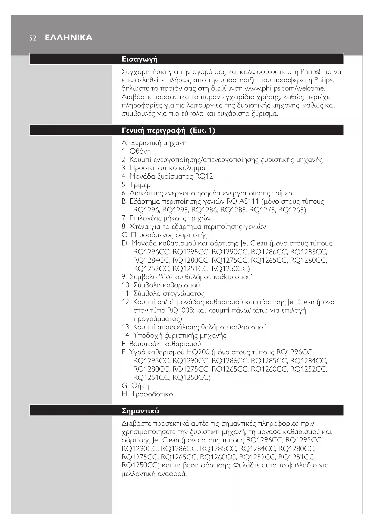 Συγχαρητήρια για την αγορά σας και καλωσορίσατε στη Philips! Για να επωφεληθείτε πλήρως από την υποστήριξη που προσφέρει η Philips, δηλώστε το προϊόν σας στη διεύθυνση www.philips.com/welcome. Διαβάστε προσεκτικά το παρόν εγχειρίδιο χρήσης, καθώς περιέχει πληροφορίες για τις λειτουργίες της ξυριστικής μηχανής, καθώς και συμβουλές για πιο εύκολο και ευχάριστο ξύρισμα. Γενική περιγραφή (Εικ. 1) A Ξυριστική μηχανή 1 Οθόνη 2 Κουμπί ενεργοποίησης/απενεργοποίησης ξυριστικής μηχανής 3 Προστατευτικό κάλυμμα 4 Μονάδα ξυρίσματος RQ12 5 Τρίμερ 6 Διακόπτης ενεργοποίησης/απενεργοποίησης τρίμερ B Εξάρτημα περιποίησης γενιών RQ AS111 (μόνο στους τύπους RQ1296, RQ1295, RQ1286, RQ1285, RQ1275, RQ1265) 7 Επιλογέας μήκους τριχών 8 Χτένα για το εξάρτημα περιποίησης γενιών C Πτυσσόμενος φορτιστής D Μονάδα καθαρισμού και φόρτισης Jet Clean (μόνο στους τύπους RQ1296CC, RQ1295CC, RQ1290CC, RQ1286CC, RQ1285CC, RQ1284CC, RQ1280CC, RQ1275CC, RQ1265CC, RQ1260CC, RQ1252CC, RQ1251CC, RQ1250CC) 9 Σύμβολο “άδειου θαλάμου καθαρισμού” 10 Σύμβολο καθαρισμού 11 Σύμβολο στεγνώματος 12 Κουμπί on/off μονάδας καθαρισμού και φόρτισης Jet Clean (μόνο στον τύπο RQ1008: και κουμπί πάνω/κάτω για επιλογή προγράμματος) 13 Κουμπί απασφάλισης θαλάμου καθαρισμού 14 Υποδοχή ξυριστικής μηχανής E Βουρτσάκι καθαρισμού F Υγρό καθαρισμού HQ200 (μόνο στους τύπους RQ1296CC, RQ1295CC, RQ1290CC, RQ1286CC, RQ1285CC, RQ1284CC, RQ1280CC, RQ1275CC, RQ1265CC, RQ1260CC, RQ1252CC, RQ1251CC, RQ1250CC) G Θήκη H Τροφοδοτικό