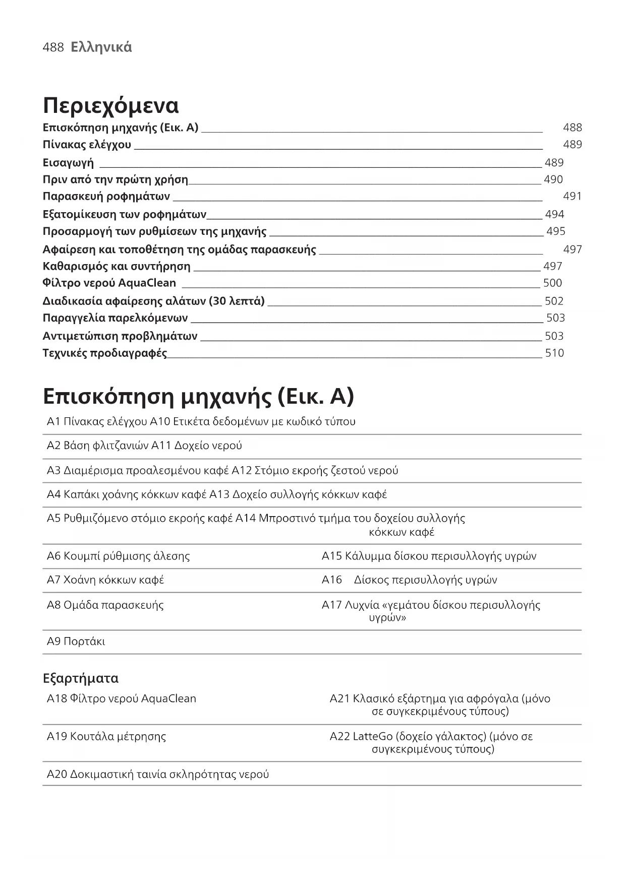 Περιεχόμενα Επισκόπηση μηχανής (Εικ. Α) _____________________________________________________________ 488 Πίνακας ελέγχου _________________________________________________________________________ 489 Εισαγωγή _______________________________________________________________________________ 489Πριν από την πρώτη χρήση_______________________________________________________________ 490 Παρασκευή ροφημάτων __________________________________________________________________ 491 Εξατομίκευση των ροφημάτων____________________________________________________________ 494Προσαρμογή των ρυθμίσεων της μηχανής _________________________________________________ 495 Αφαίρεση και τοποθέτηση της ομάδας παρασκευής ________________________________________ 497 Καθαρισμός και συντήρηση ______________________________________________________________ 497Φίλτρο νερού AquaClean ________________________________________________________________ 500Διαδικασία αφαίρεσης αλάτων (30 λεπτά) _________________________________________________ 502Παραγγελία παρελκόμενων _______________________________________________________________ 503Αντιμετώπιση προβλημάτων _____________________________________________________________ 503Τεχνικές προδιαγραφές___________________________________________________________________ 510 Επισκόπηση μηχανής (Εικ. Α) A1 Πίνακας ελέγχου A10 Ετικέτα δεδομένων με κωδικό τύπουA2 Βάση φλιτζανιών A11 Δοχείο νερούA3 Διαμέρισμα προαλεσμένου καφέ A12 Στόμιο εκροής ζεστού νερούA4 Καπάκι χοάνης κόκκων καφέ A13 Δοχείο συλλογής κόκκων καφέA5 Ρυθμιζόμενο στόμιο εκροής καφέ A14 Μπροστινό τμήμα του δοχείου συλλογήςκόκκων καφέA6 Κουμπί ρύθμισης άλεσης A15 Κάλυμμα δίσκου περισυλλογής υγρώνA7 Χοάνη κόκκων καφέ A16 Δίσκος περισυλλογής υγρώνA8 Ομάδα παρασκευής A17 Λυχνία «γεμάτου δίσκου περισυλλογήςυγρών»A9 Πορτάκι A18 Φίλτρο νερού AquaClean A21 Κλασικό εξάρτημα για αφρόγαλα (μόνοσε συγκεκριμένους τύπους)A19 Κουτάλα μέτρησης A22 LatteGo (δοχείο γάλακτος) (μόνο σεσυγκεκριμένους τύπους)A20 Δοκιμαστική ταινία σκληρότητας νερού489