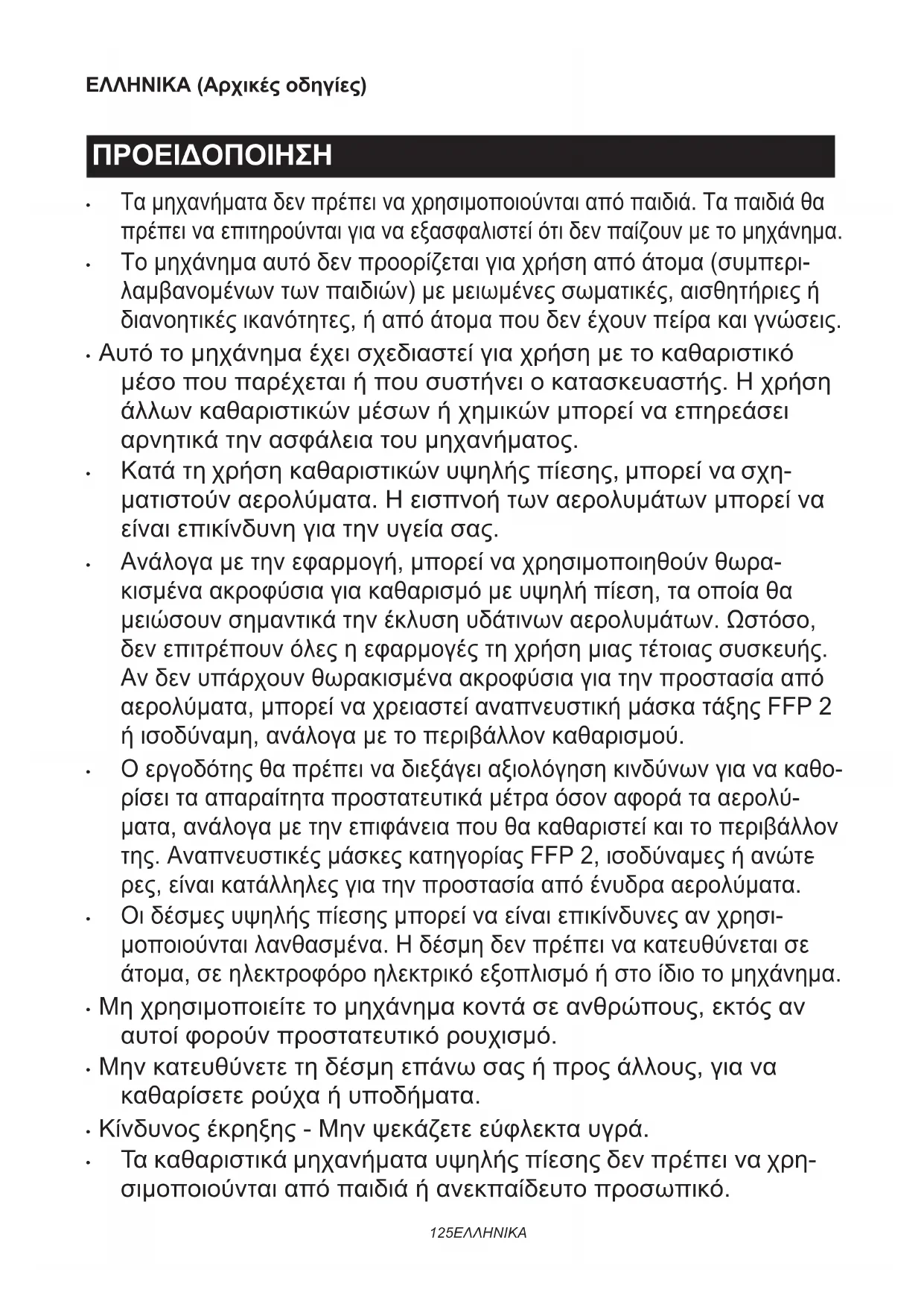 - Τα καθαριστικά μηχανήματα υψηλής πίεσης δεν πρέπει να χρη- σιμοποιούνται από παιδιά ή ανεκπαίδευτο προσωπικό.126 ΕΛΛΗΝΙΚΑ