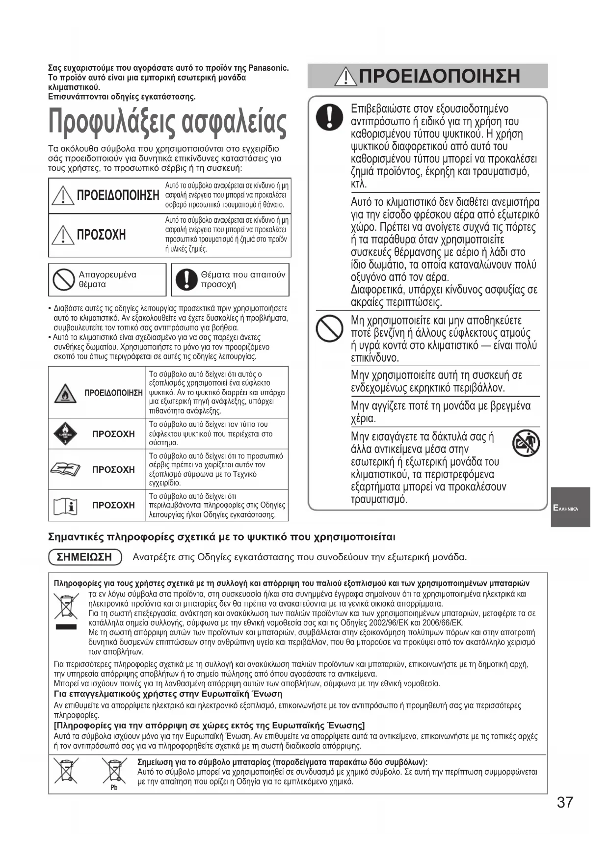 Μην εισαγάγετε τα δάκτυλά σας ή άλλα αντικείμενα μέσα στην εσωτερική ή εξωτερική μονάδα του κλιματιστικού, τα περιστρεφόμενα εξαρτήματα μπορεί να προκαλέσουν τραυματισμό. ΠΡΟΕΙΔΟΠΟΙΗΣΗ ΠΡΟΕΙΔΟΠΟΙΗΣΗΤο σύμβολο αυτό δείχνει ότι αυτός ο εξοπλισμός χρησιμοποιεί ένα εύφλεκτο ψυκτικό. Αν το ψυκτικό διαρρέει και υπάρχει μια εξωτερική πηγή ανάφλεξης, υπάρχει πιθανότητα ανάφλεξης.ΠΡΟΣΟΧΗΤο σύμβολο αυτό δείχνει τον τύπο του εύφλεκτου ψυκτικού που περιέχεται στο σύστημα.ΠΡΟΣΟΧΗΤο σύμβολο αυτό δείχνει ότι το προσωπικό σέρβις πρέπει να χειρίζεται αυτόν τον εξοπλισμό σύμφωνα με το Τεχνικό εγχειρίδιο.ΠΡΟΣΟΧΗΤο σύμβολο αυτό δείχνει ότι περιλαμβάνονται πληροφορίες στις Οδηγίες λειτουργίας ή/και Οδηγίες εγκατάστασης.Σημαντικές πληροφορίες σχετικά με το ψυκτικό που χρησιμοποιείταιΣΗΜΕΙΩΣΗ Ανατρέξτε στις Οδηγίες εγκατάστασης που συνοδεύουν την εξωτερική μονάδα.Πληροφορίες για τους χρήστες σχετικά με τη συλλογή και απόρριψη του παλιού εξοπλισμού και των χρησιμοποιημένων μπαταριών