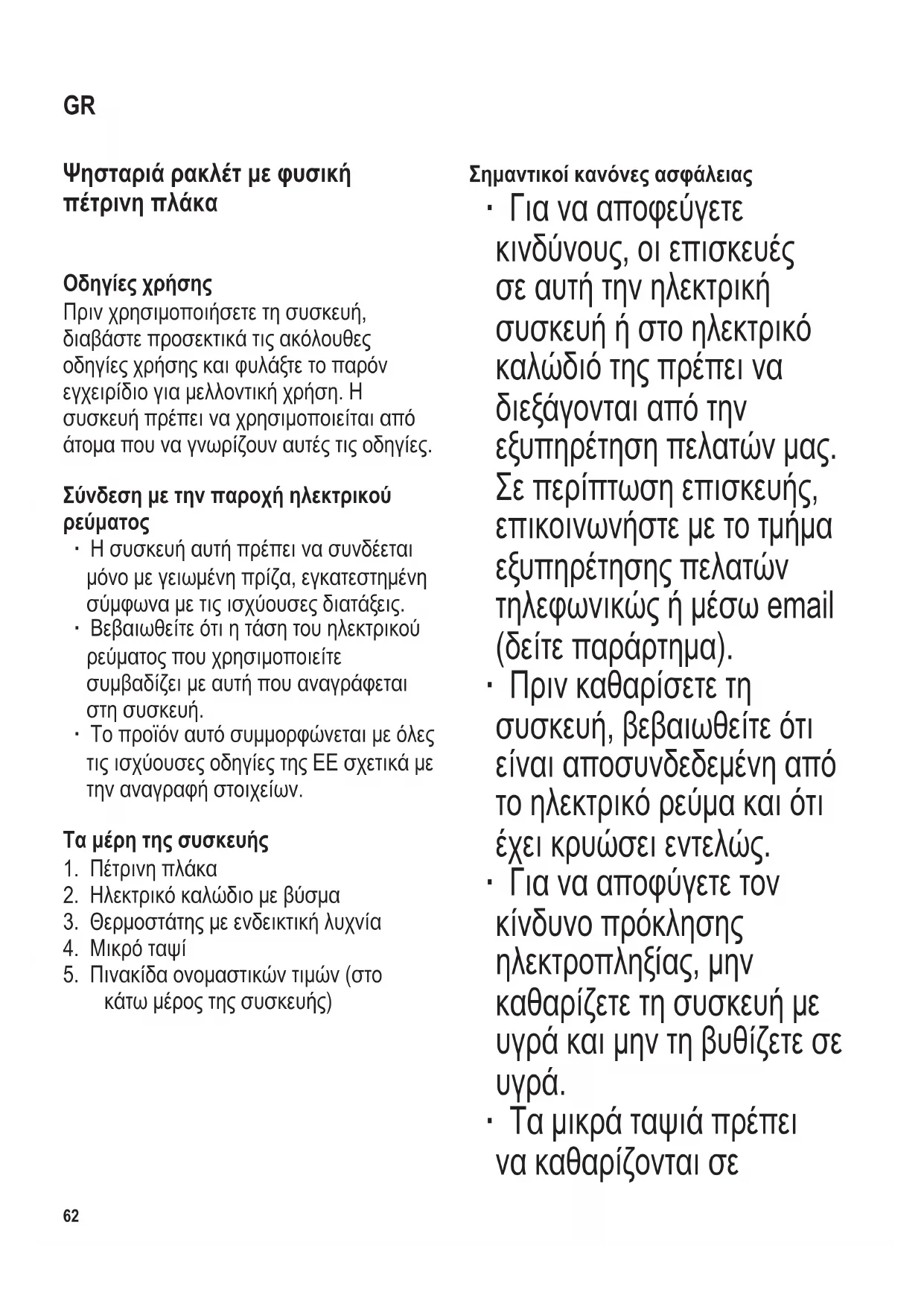 ∙ Η συσκευή αυτή προορίζεται για οικιακή χρήση ή παρόμοιες χρήσεις, όπως για παράδειγμα: - σε κουζίνες εταιρειών, σε γραφεία και άλλα εργασιακά περιβάλλοντα, - σε γεωργικές εταιρείες, - από πελάτες σε ξενοδοχεία, πανδοχεία κτλ. και παρόμοιες εγκαταστάσεις, - σε ξενώνες που σερβίρουν πρωινό. ∙ Η συσκευή αυτή μπορεί να χρησιμοποιηθεί από παιδιά (τουλάχιστον 8 ετών) και από άτομα με μειωμένες φυσικές, αισθητήριες ή διανοητικές ικανότητες ή χωρίς πείρα και γνώσεις, με την προϋπόθεση ότι επιτηρούνται ή τους έχουν δοθεί οδηγίες σχετικά με τη χρήση της συσκευής και κατανοούν πλήρως όλους τους εμπλεκόμενους κίνδυνους και προφυλάξεις για την ασφάλεια. ∙ Τα παιδιά δεν πρέπει να επιτρέπεται να παίζουν με τη συσκευή. ∙ Δεν πρέπει να επιτρέπεται στα παιδιά να εκτελούν οποιαδήποτε εργασία καθαρισμού ή συντήρησης64 104 x 142 mm στη συσκευή εκτός εάν επιτηρούνται και είναι τουλάχιστον 8 ετών. ∙ Κρατήστε πάντα τη συσκευή και το ηλεκτρικό καλώδιό της μακριά από παιδιά κάτω των 8 ετών. ∙ Προσοχή! Τα παιδιά πρέπει να παραμένουν μακριά από τα υλικά συσκευασίας, επειδή είναι δυνητικώς επικίνδυνα, π.χ. κίνδυνος ασφυξίας. ∙ Κάθε φορά που χρησιμοποιείτε τη συσκευή, θα πρέπει να ελέγχετε προσεκτικά την κύρια μονάδα, το ηλεκτρικό καλώδιο, καθώς και κάθε εξάρτημα για τυχόν ελαττώματα. Αν η συσκευή, για παράδειγμα, έχει πέσει σε σκληρή επιφάνεια ή έχει ασκηθεί υπερβολική δύναμη για το τράβηγμα του ηλεκτρικού καλωδίου δεν θα πρέπει να χρησιμοποιηθεί ξανά, ακόμη κι αν η ζημιά δεν φαίνεται ότι μπορεί να προκαλέσει προβλήματα στην ασφαλή λειτουργία της συσκευής. ∙ Οι επιφάνειες της συσκευής, η πέτρινη πλάκα και τα μικρά ταψιά θερμαίνονται κατά τη χρήση και παραμένουν θερμές για κάποιο χρόνο μετέπειτα. Προσοχή! Υπάρχει κίνδυνος για πρόκληση εγκαυμάτων. ∙ Μην αφήνετε τη συσκευή αφύλακτη, ενώ τη χρησιμοποιείτε. ∙ Μην αφήνετε το ηλεκτρικό καλώδιο να αγγίζει οποιοδήποτε θερμό μέρος της