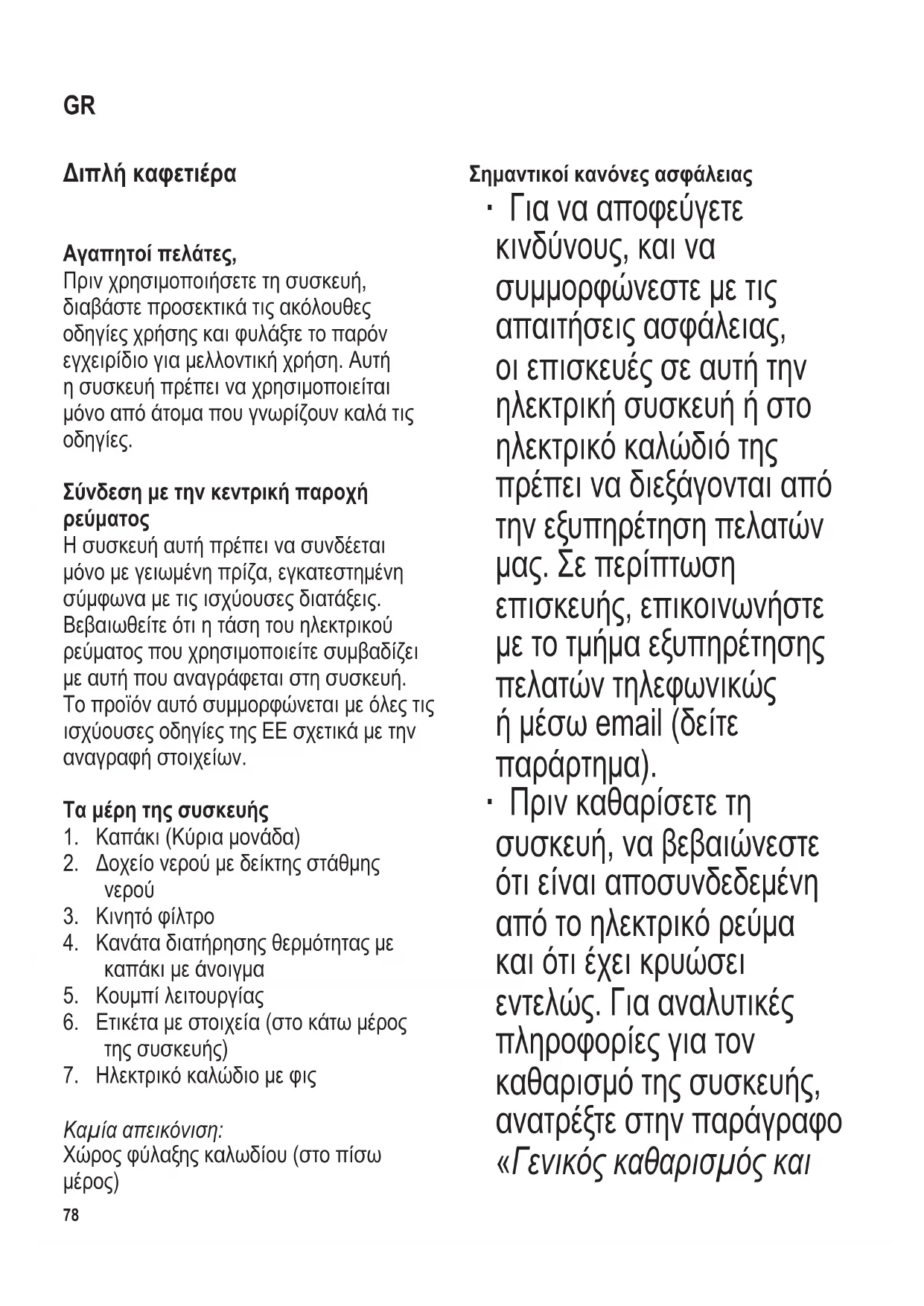 Σημαντικοί κανόνες ασφάλειας ∙ Γιανααποφεύγετε κινδύνους,καινα συμμορφώνεστεμετις απαιτήσειςασφάλειας, οιεπισκευέςσεαυτήτην ηλεκτρικήσυσκευήήστο ηλεκτρικόκαλώδιότης πρέπειναδιεξάγονταιαπό τηνεξυπηρέτησηπελατών μας.Σεπερίπτωση επισκευής,επικοινωνήστε μετοτμήμαεξυπηρέτησης πελατώντηλεφωνικώς ήμέσωemail(δείτε παράρτημα). ∙ Πρινκαθαρίσετετη συσκευή,ναβεβαιώνεστε ότιείναιαποσυνδεδεμένη απότοηλεκτρικόρεύμα καιότιέχεικρυώσει εντελώς.Γιααναλυτικές πληροφορίεςγιατον καθαρισμότηςσυσκευής, ανατρέξτεστηνπαράγραφο «Γενικός καθαρισμός και GR104 x 142 mm