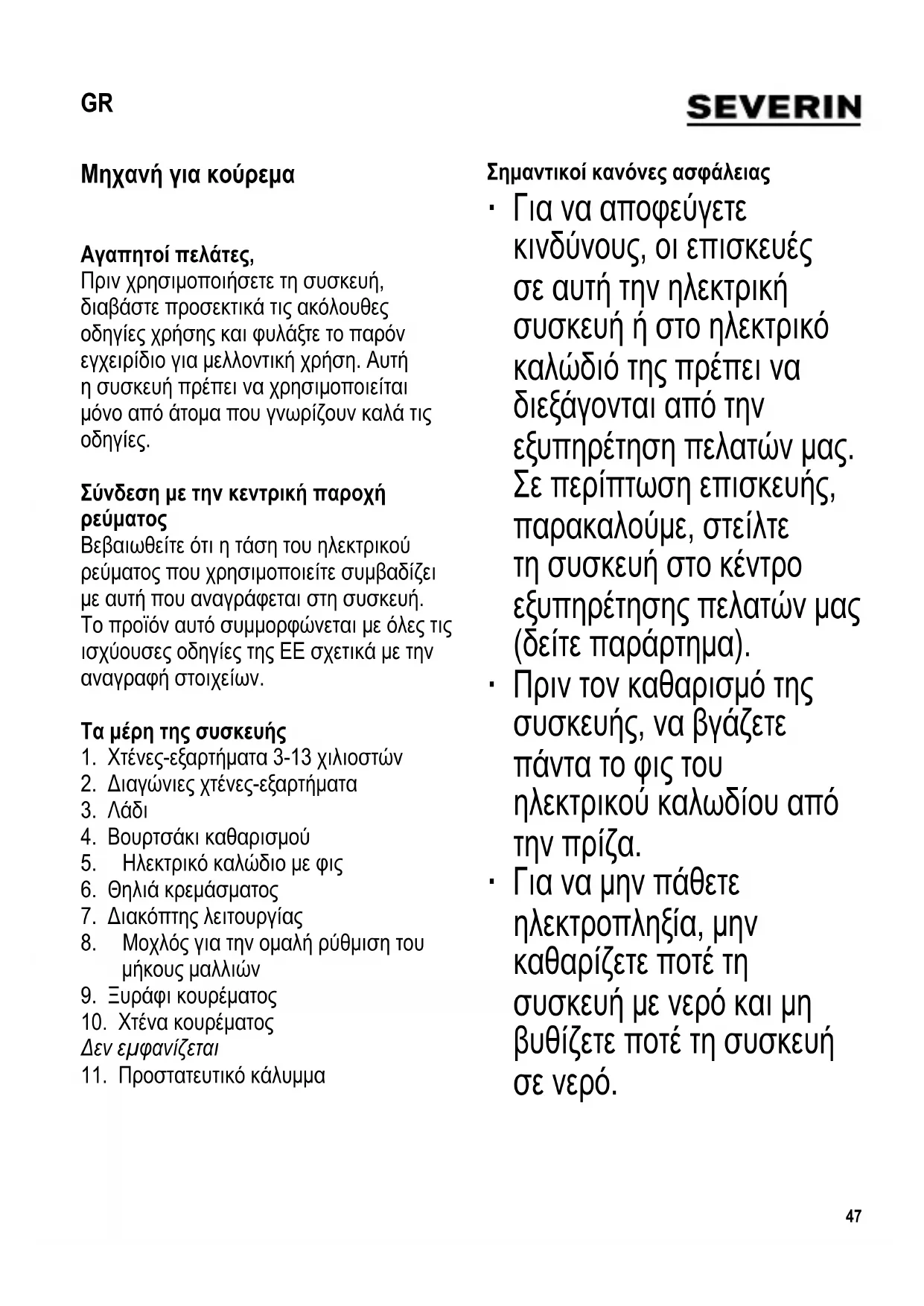 καλωδίου από την πρίζα, μετά τη χρήση και επίσης - σε περίπτωση βλάβης, και - κατά τον καθαρισμό. ∙ Όταν βγάζετε το φις του ηλεκτρικού καλωδίου από την πρίζα, ποτέ μην τραβάτε το ηλεκτρικό καλώδιο. Να πιάνετε πάντα το ίδιο το φις. ∙ Προσοχή! Το ξυράφι κουρέματος είναι πολύ αιχμηρό. Προκειμένου να αποφύγετε την πρόκληση τραυματισμού, να φροντίζετε πάντα το ξυράφι να μην ακουμπά στο δέρμα κατά