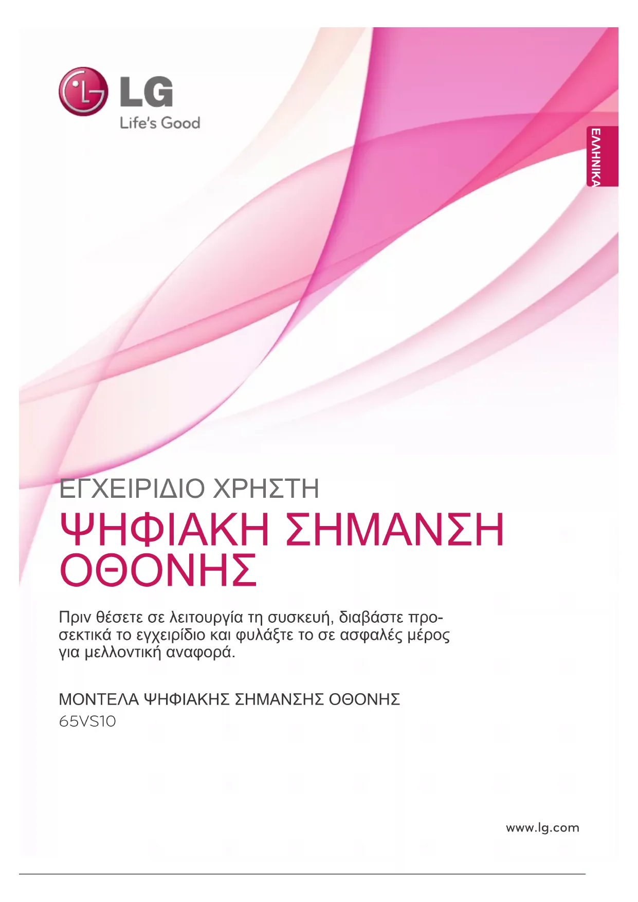 65VS10 Πριν θέσετε σε λειτουργία τη συσκευή, διαβάστε προ- σεκτικά το εγχειρίδιο και φυλάξτε το σε ασφαλές μέρος για μελλοντική αναφορά. ΜΟΝΤΕΛΑ ΨΗΦΙΑΚΗΣ ΣΗΜΑΝΣΗΣ ΟΘΟΝΗΣ