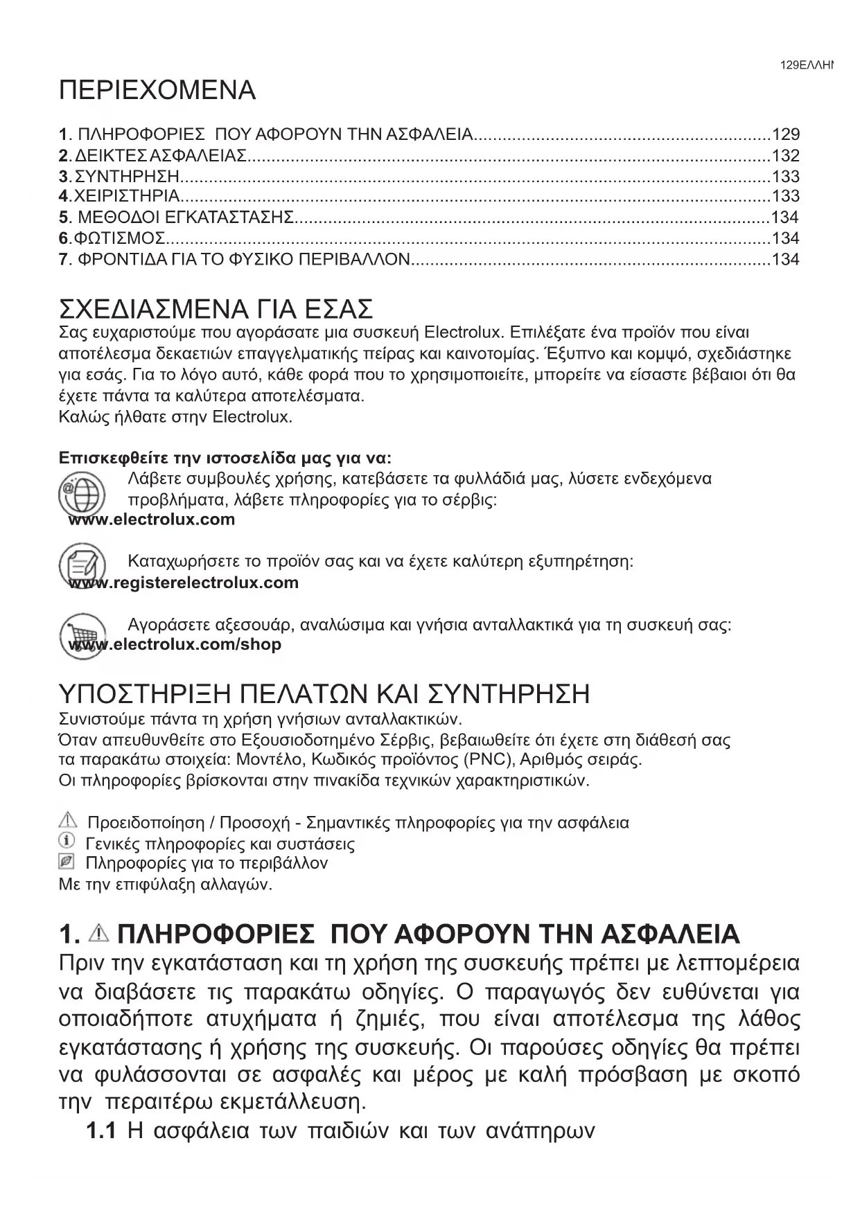 ΣΧΕΔΙΑΣΜΕΝΑ ΓΙΑ ΕΣΑΣ Σας ευχαριστούμε που αγοράσατε μια συσκευή Electrolux. Επιλέξατε ένα προϊόν που είναι αποτέλεσμα δεκαετιών επαγγελματικής πείρας και καινοτομίας. Έξυπνο και κομψό, σχεδιάστηκε για εσάς. Για το λόγο αυτό, κάθε φορά που το χρησιμοποιείτε, μπορείτε να είσαστε βέβαιοι ότι θα έχετε πάντα τα καλύτερα αποτελέσματα. Καλώς ήλθατε στην Electrolux. Επισκεφθείτε την ιστοσελίδα μας για να: Λάβετε συμβουλές χρήσης, κατεβάσετε τα φυλλάδιά μας, λύσετε ενδεχόμενα προβλήματα, λάβετε πληροφορίες για το σέρβις: www.electrolux.com Καταχωρήσετε το προϊόν σας και να έχετε καλύτερη εξυπηρέτηση: www.registerelectrolux.com Αγοράσετε αξεσουάρ, αναλώσιμα και γνήσια ανταλλακτικά για τη συσκευή σας: www.electrolux.com/shop ΥΠΟΣΤΗΡΙΞΗ ΠΕΛΑΤΩΝ ΚΑΙ ΣΥΝΤΗΡΗΣΗ Συνιστούμε πάντα τη χρήση γνήσιων ανταλλακτικών. Όταν απευθυνθείτε στο Εξουσιοδοτημένο Σέρβις, βεβαιωθείτε ότι έχετε στη διάθεσή σας τα παρακάτω στοιχεία: Μοντέλο, Κωδικός προϊόντος (PNC), Αριθμός σειράς. Οι πληροφορίες βρίσκονται στην πινακίδα τεχνικών χαρακτηριστικών. Προειδοποίηση / Προσοχή - Σημαντικές πληροφορίες για την ασφάλεια Γενικές πληροφορίες και συστάσεις Πληροφορίες για το περιβάλλον Με την επιφύλαξη αλλαγών.